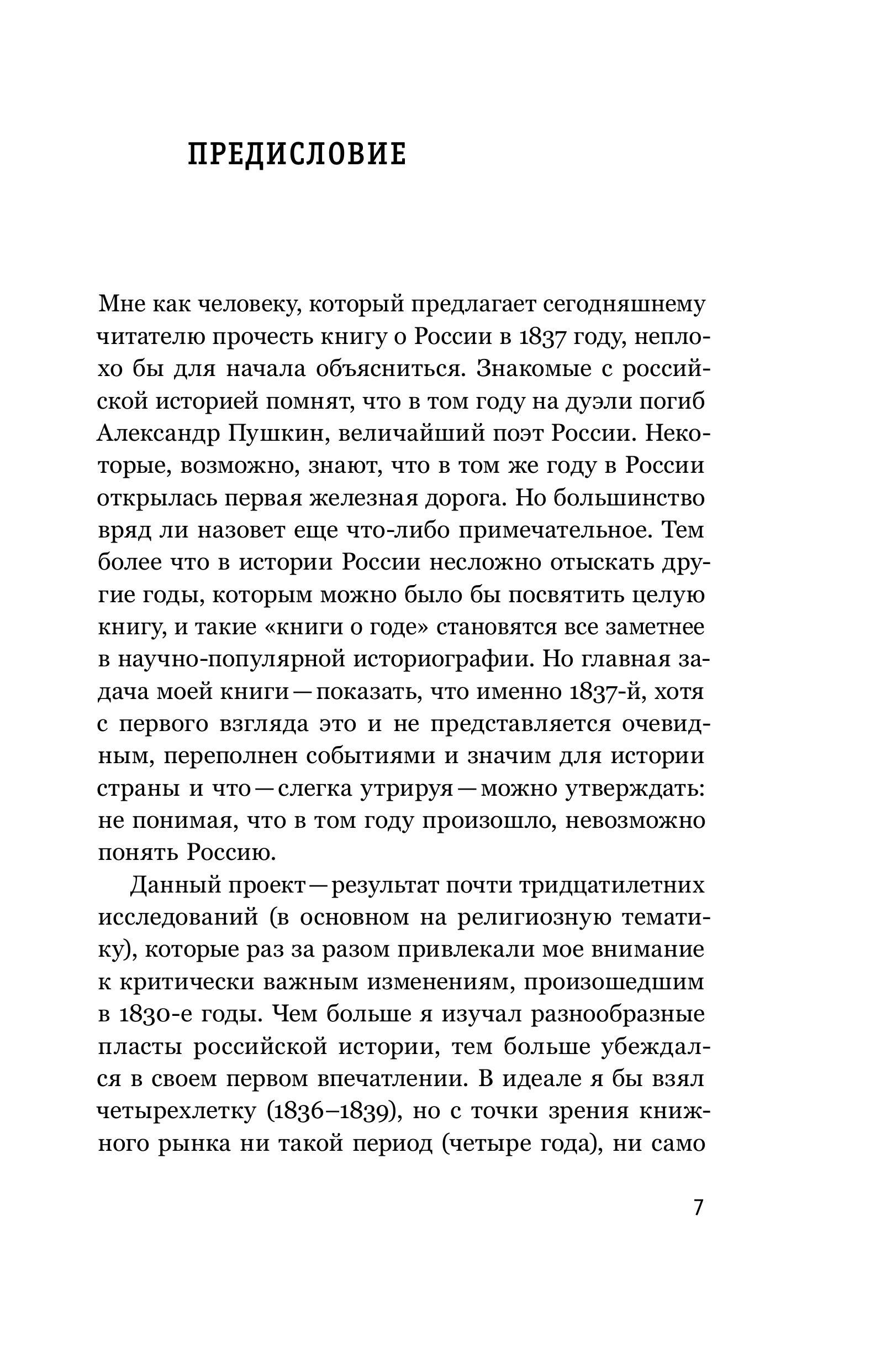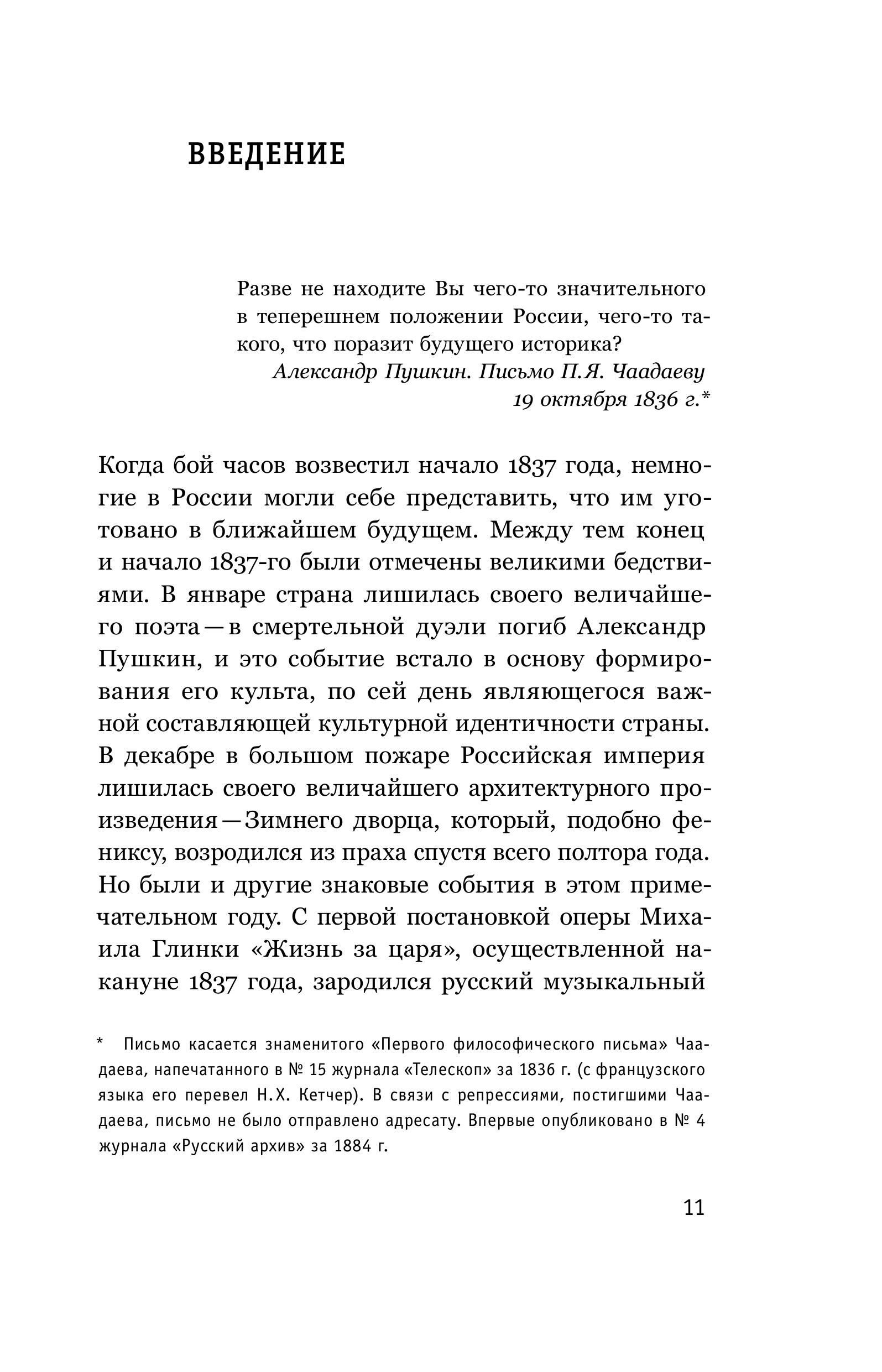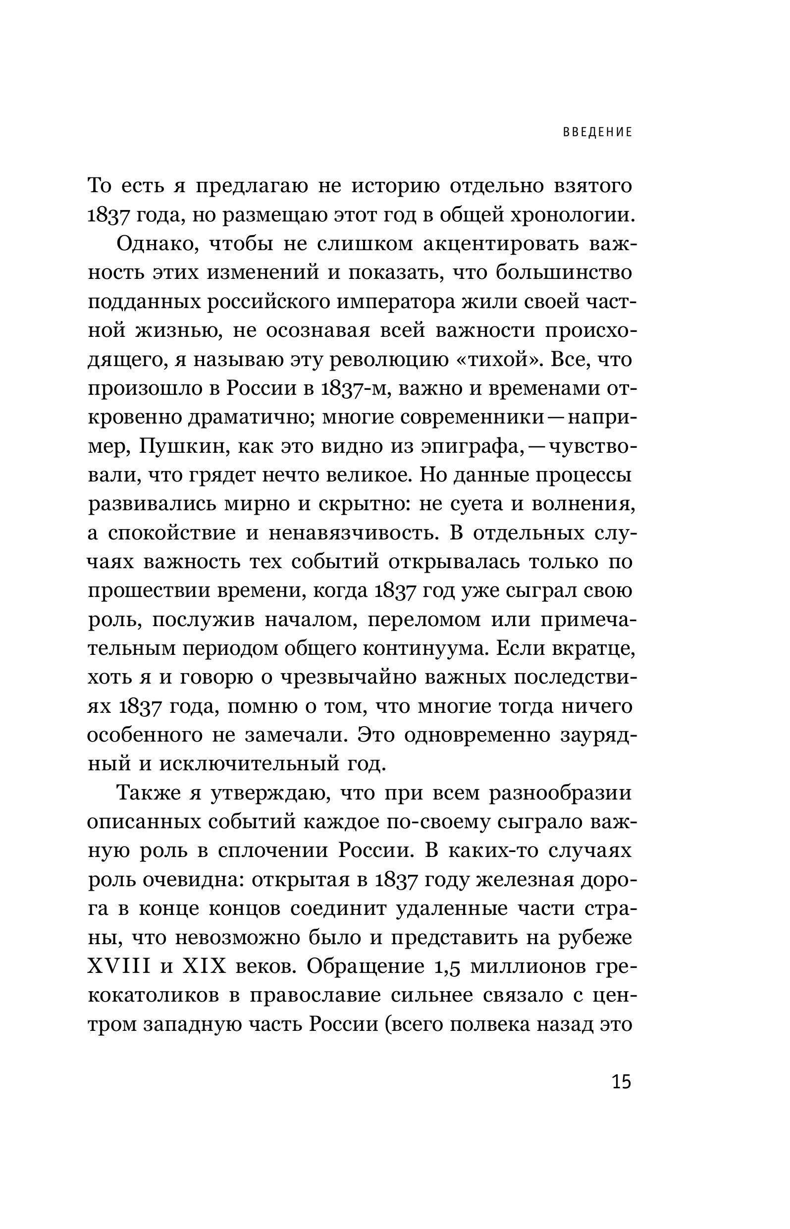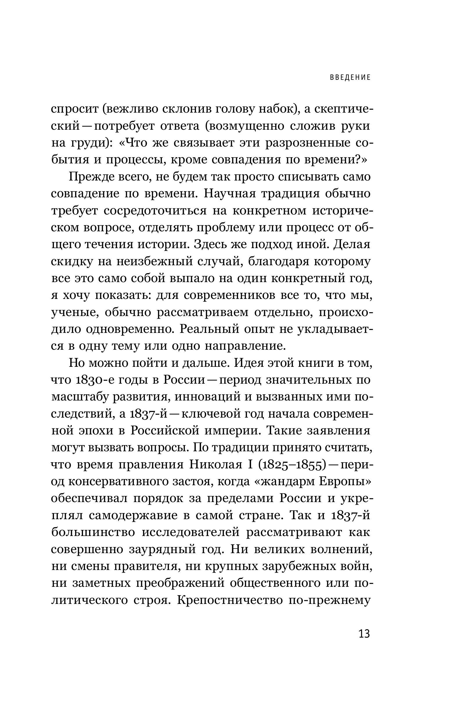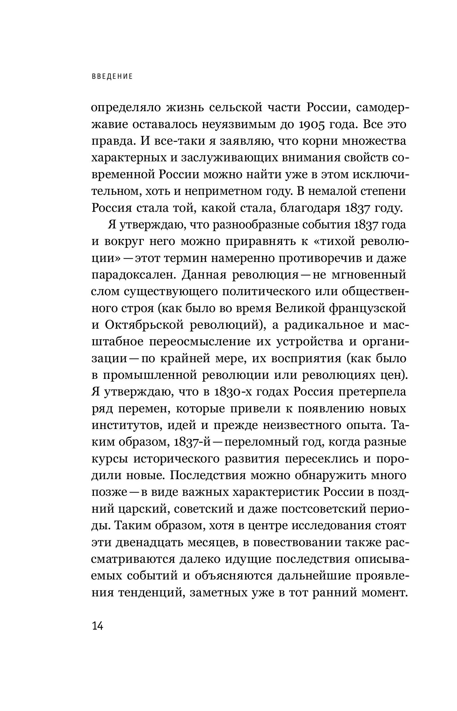 В центре внимания автора — 1837 год, который вобрал в себя много заметных событий: смерть Пушкина, пожар в Зимнем дворце, строительство железных дорог, возникновение провинциальной прессы, становление русской оперы, первый визит Романовых в Сибирь и т. п. Каждая глава посвящена отдельной сфере российской социальной жизни того периода — культуре, прессе, идейным исканиям, промышленности, религии и т. д. Анализируя основные векторные линии развития страны, П. Верт делает вывод, что 1837 год стал поворотным годом для вступления страны в современную эпоху, колыбелью «тихой революции» — медленной, потаенной, но фундаментальной трансформации общественно-политического устройства страны.