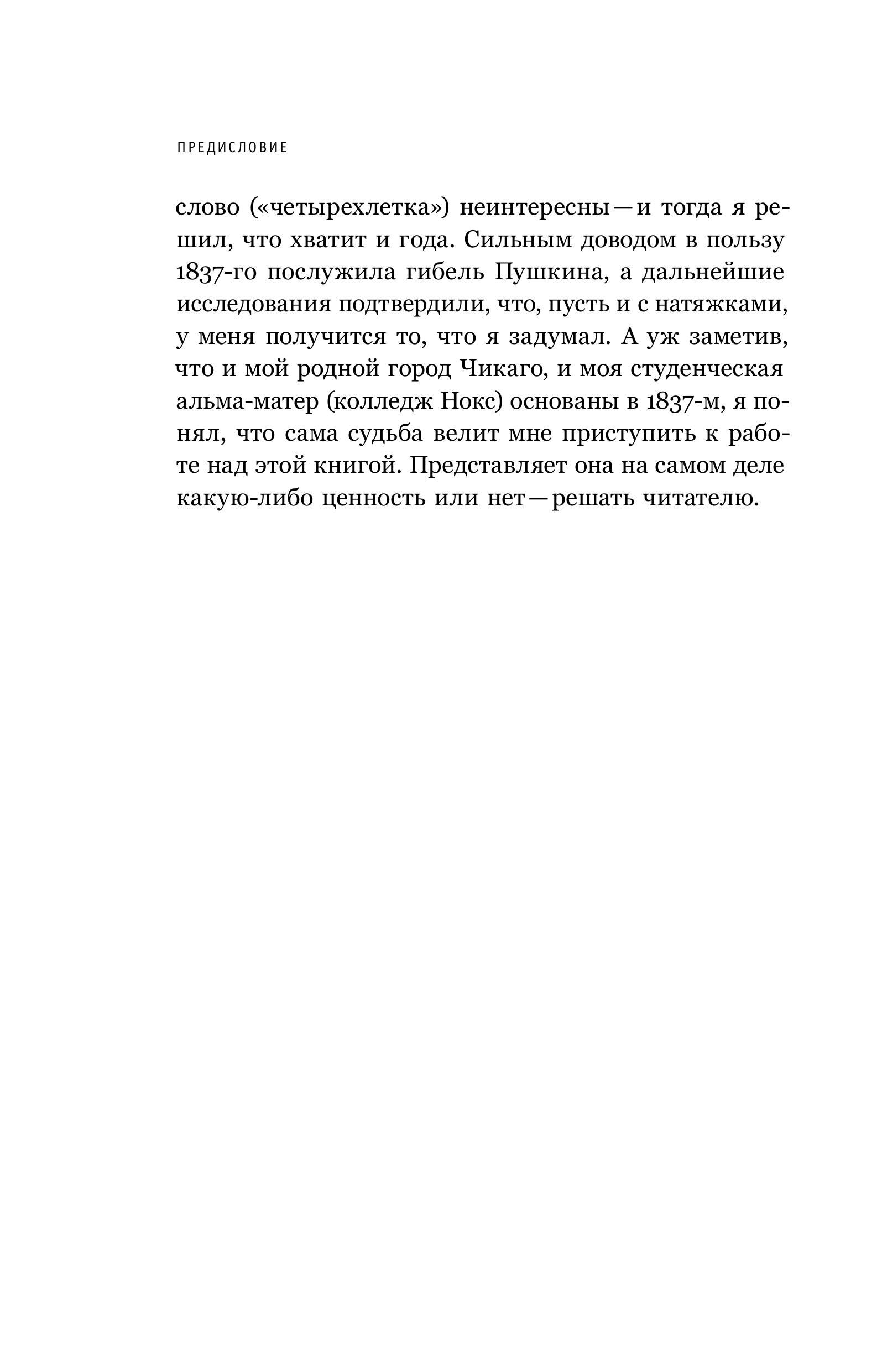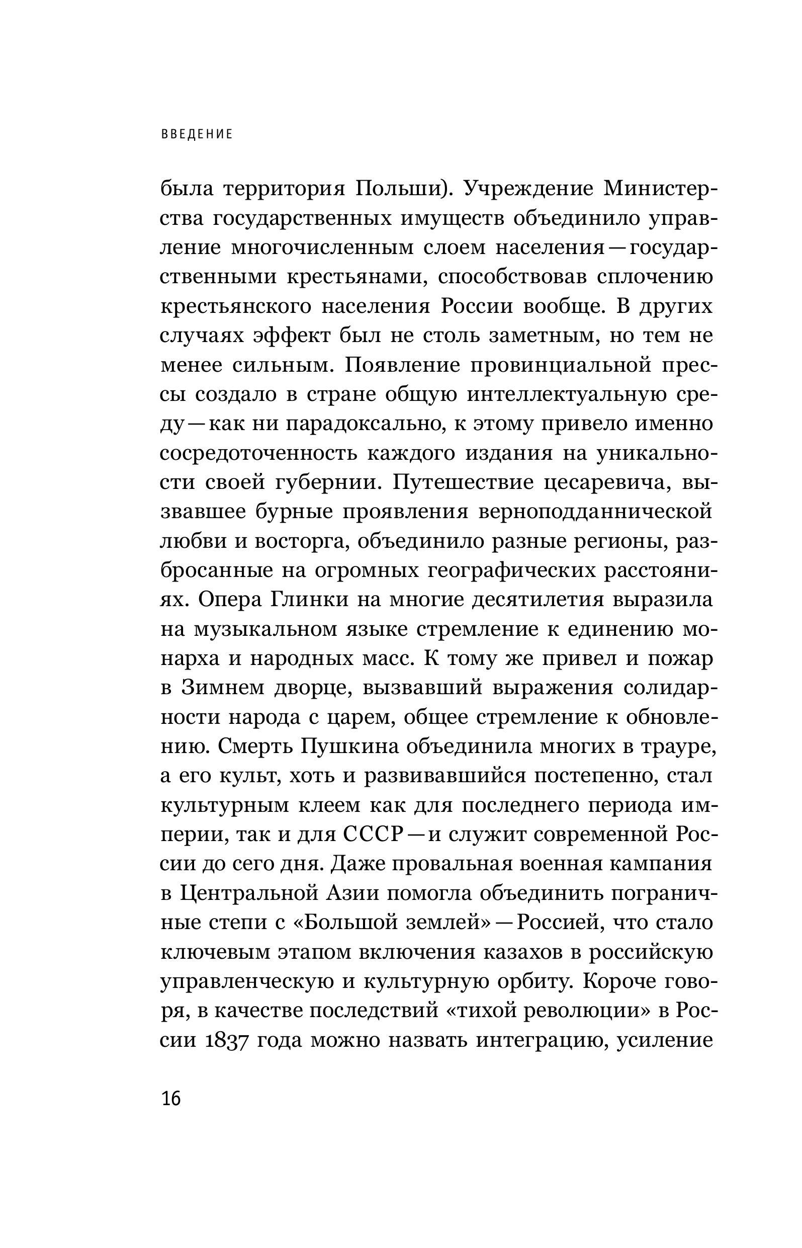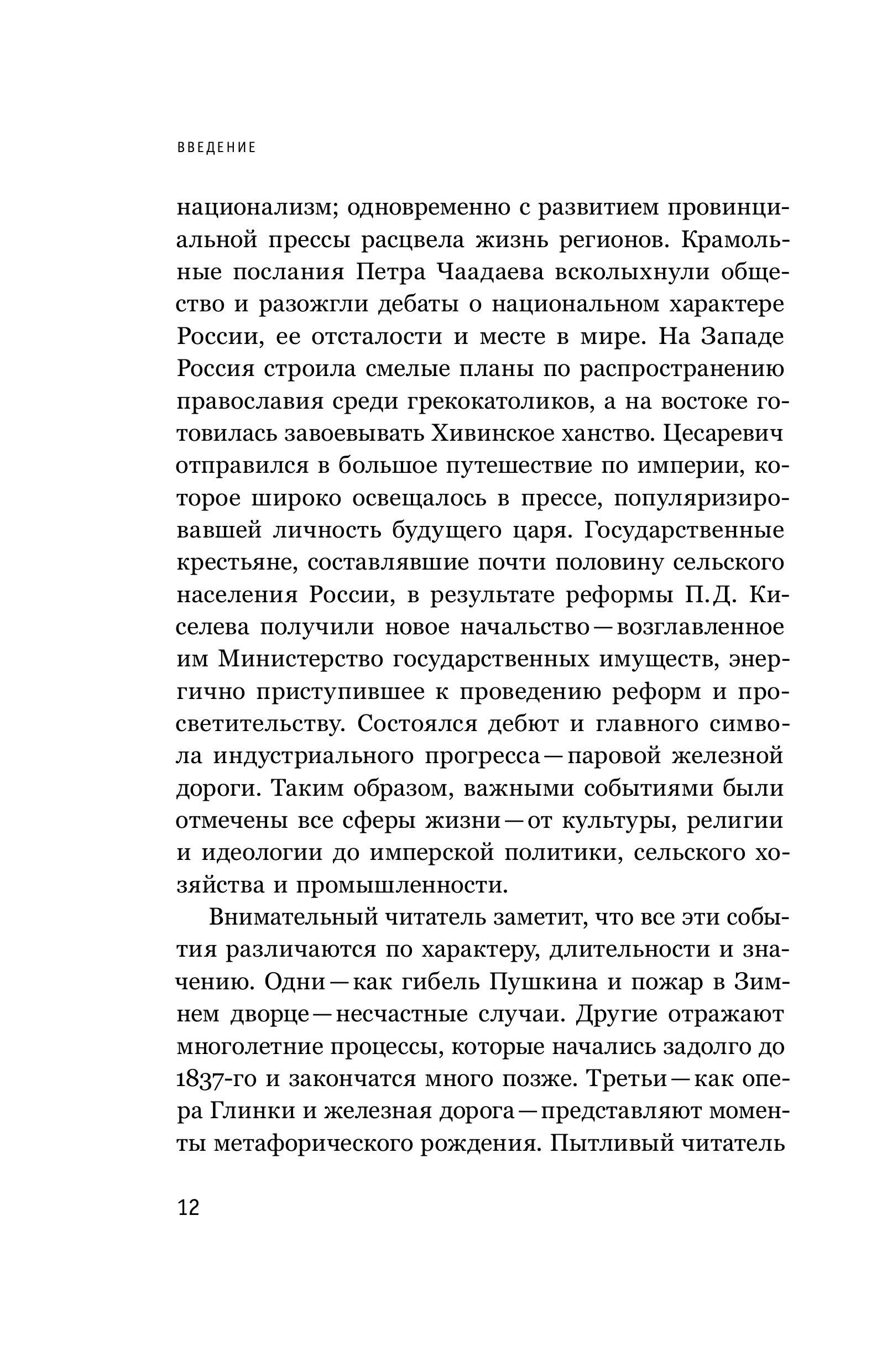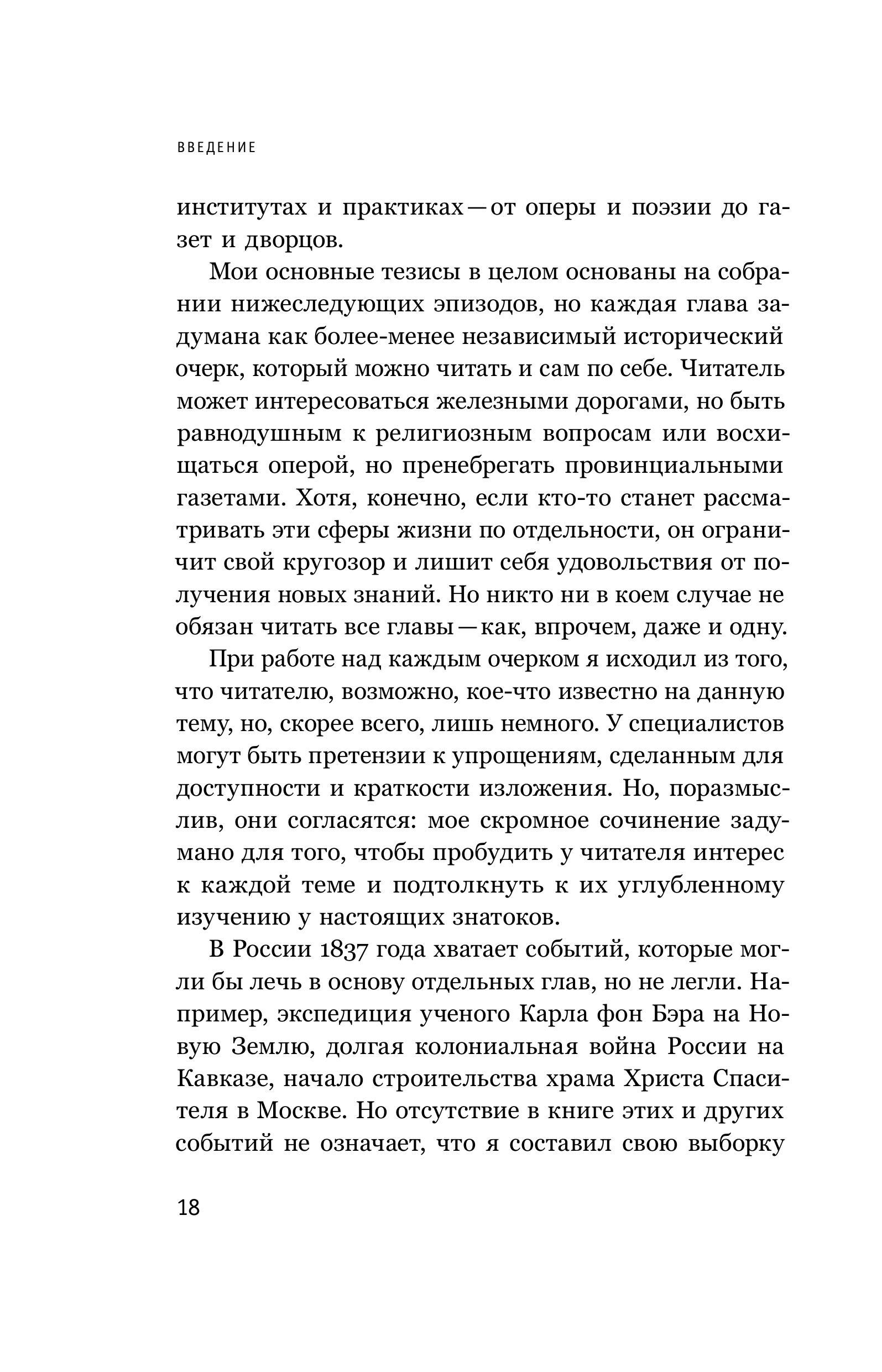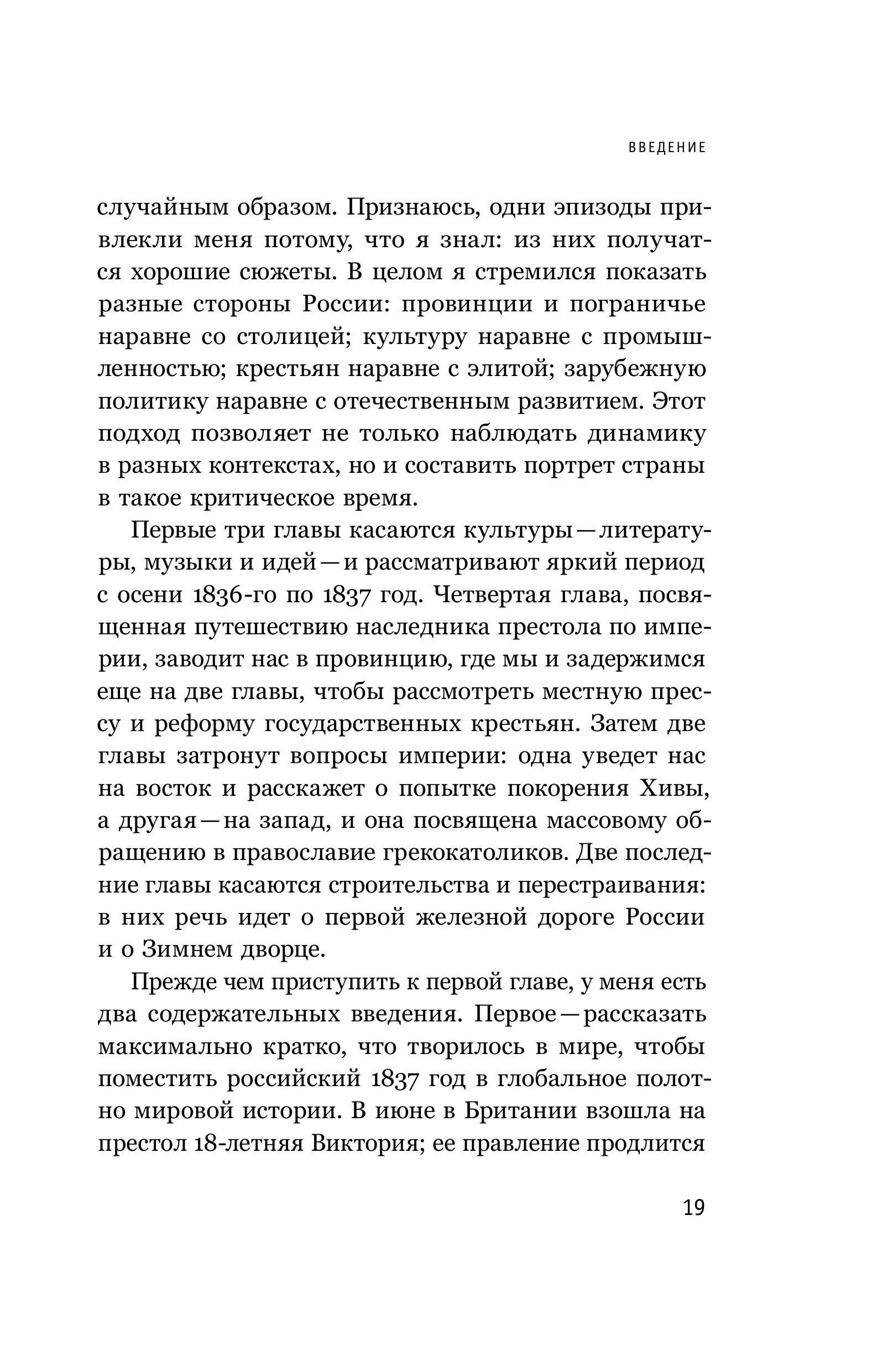 В центре внимания автора — 1837 год, который вобрал в себя много заметных событий: смерть Пушкина, пожар в Зимнем дворце, строительство железных дорог, возникновение провинциальной прессы, становление русской оперы, первый визит Романовых в Сибирь и т. п. Каждая глава посвящена отдельной сфере российской социальной жизни того периода — культуре, прессе, идейным исканиям, промышленности, религии и т. д. Анализируя основные векторные линии развития страны, П. Верт делает вывод, что 1837 год стал поворотным годом для вступления страны в современную эпоху, колыбелью «тихой революции» — медленной, потаенной, но фундаментальной трансформации общественно-политического устройства страны.