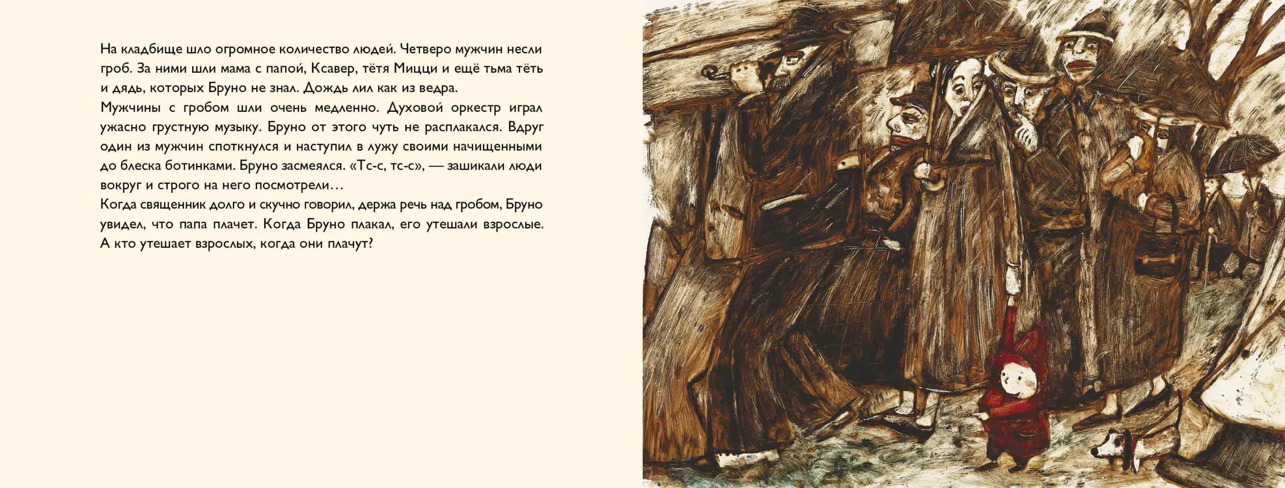 Поначалу, что бы Бруно ни делал, он чувствует глухую боль в груди. Как будто у него маленькая дырка в груди под свитером. Но постепенно она затягивается. Каждый вечер перед тем, как лечь спать, Бруно смотрит на дедушкину фотографию и разговаривает с ним. «Я тебя не забуду», — обещает он дедушке. И кажется, что тот улыбается ему издалека.