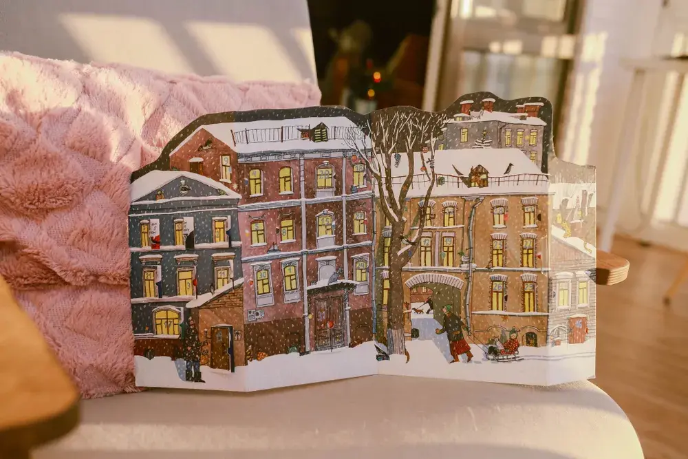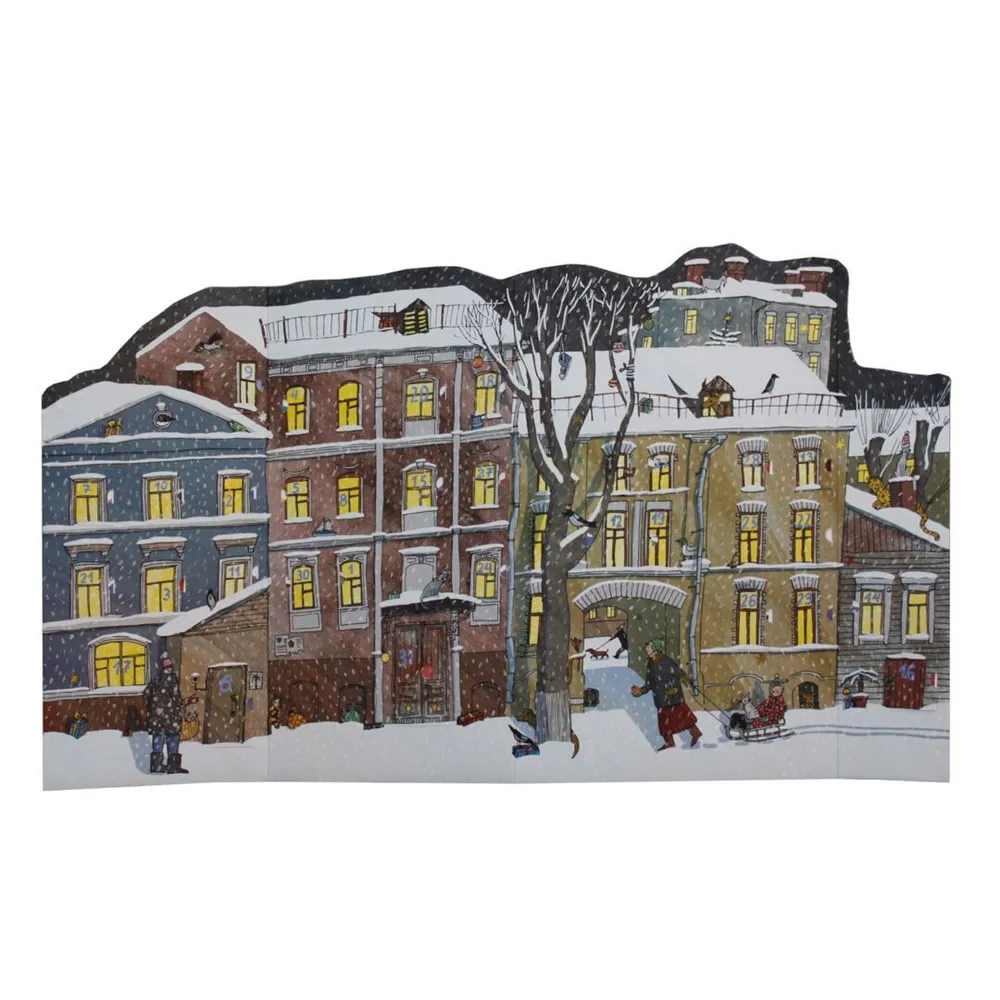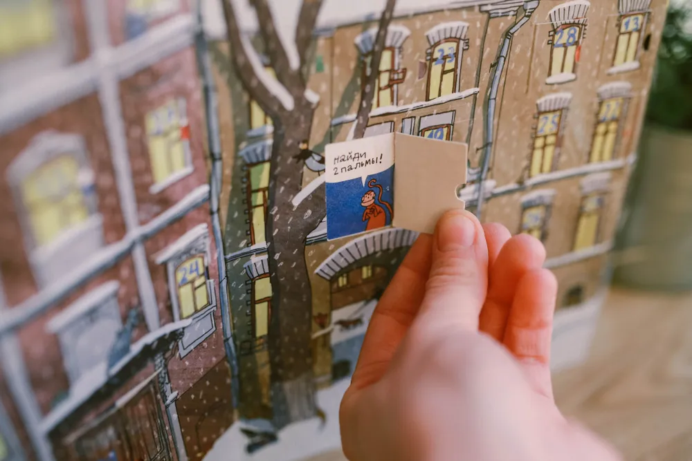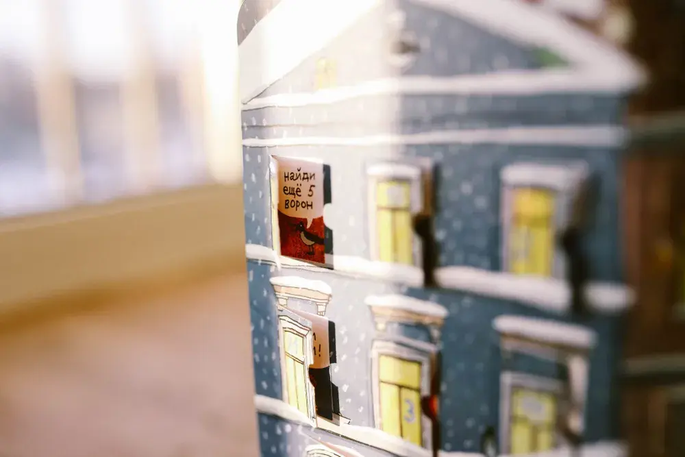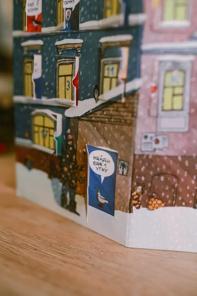 Адвент-календарь «Московский дворик» выполнен в стиле большого виммельбуха. Нарисованные в окошках герои ежедневно выдают разные задания. Когда вы выполните все, наступит 31 декабря и придёт Новый Год!