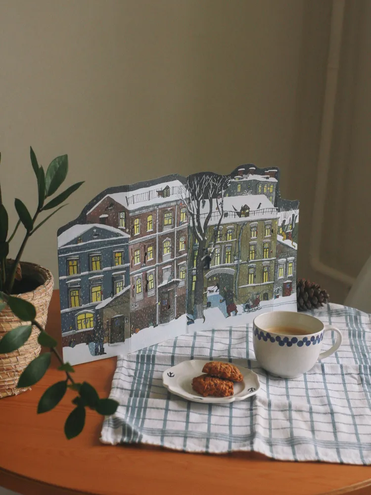 Аня Десницкая сделала календарь в стиле европейских адвентов — но только московский дворик на несколько домов в стиле виммельбуха. Наклеек в этом календаре нет, но есть задания, которые выдает каждый герой, живущий в этих домах.