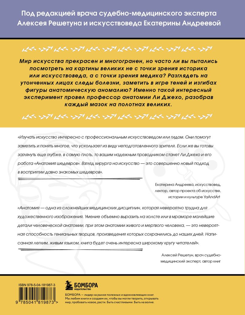 «Изучать искусство интересно с профессиональным искусствоведом или гидом. Они помогут заметить и понять многое, что ускользает из виду неподготовленного зрителя. Если же вы готовы заглянуть еще глубже, в самую плоть, то вашим надежным проводником станет Ли Джэхо и его работа "Анатомия шедевров". Взгляд анатома на искусство — это совершенно новый подход в восприятии давно знакомых шедевров». — Екатерина Андреева, искусствовед, лектор, автор проекта об искусстве, истории и культуре YaAndArt
