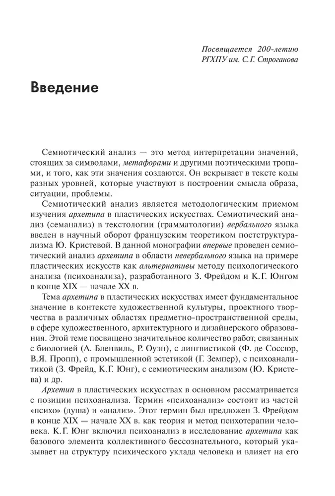 В данной монографии впервые проведен семиотический анализ (семанализ) архетипа в области невербального языка на примере пластических искусств как альтернативы методу психологического анализа (психоанализа), разработанного Зигмундом Фрейдом и Карлом Густавом Юнгом в конце XIX — начале XX в. Термин "семанализ" введен в научный оборот Юлией Кристевой для исследования принципов текстологии в вербальном языке.
