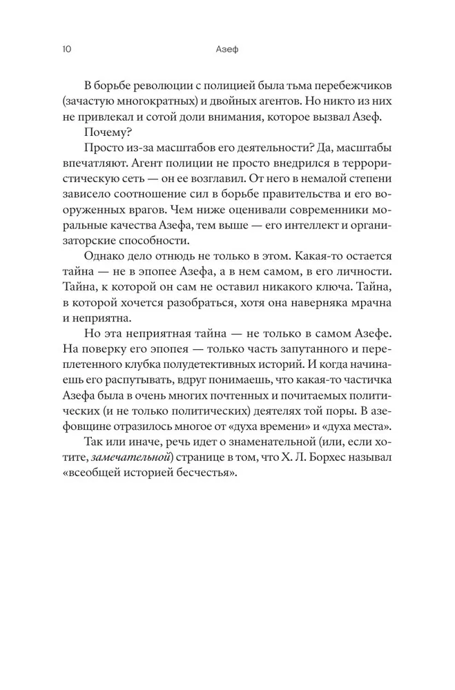 После разоблачения Азеф из легенды революционной борьбы превратился в изгоя, а его имя стало символом позорной беспринципности. Однако писателю Валерию Шубинскому удалось выявить в двойном агенте прежде всего человека — со своими привязанностями, известными моральными ограничениями и даже политическими убеждениями. В турбулентные времена, когда моральный компас общества сбит окончательно, знакомство с реальной историей зловещего циника может не только обескуражить, но и отрезвить.