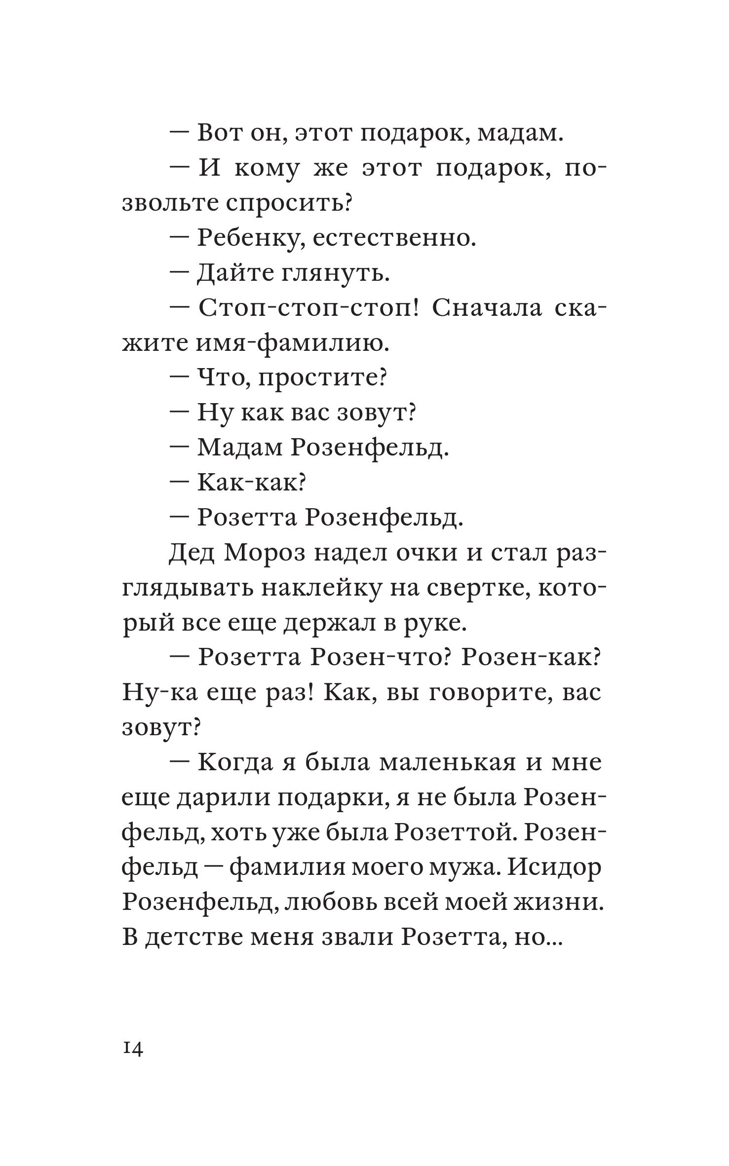 Едва мадам Розенфельд решила в канун Рождества проверить, пролезет ли в ее дымоход Дед Мороз, как он возьми да и свались ей прямо на голову. Ворчливый, на грани нервного срыва, но все же Дед Мороз. Даже член профсоюза. Но помилуйте, какой Дед Мороз в наше время, после всего, что пережил и продолжает переживать мир?