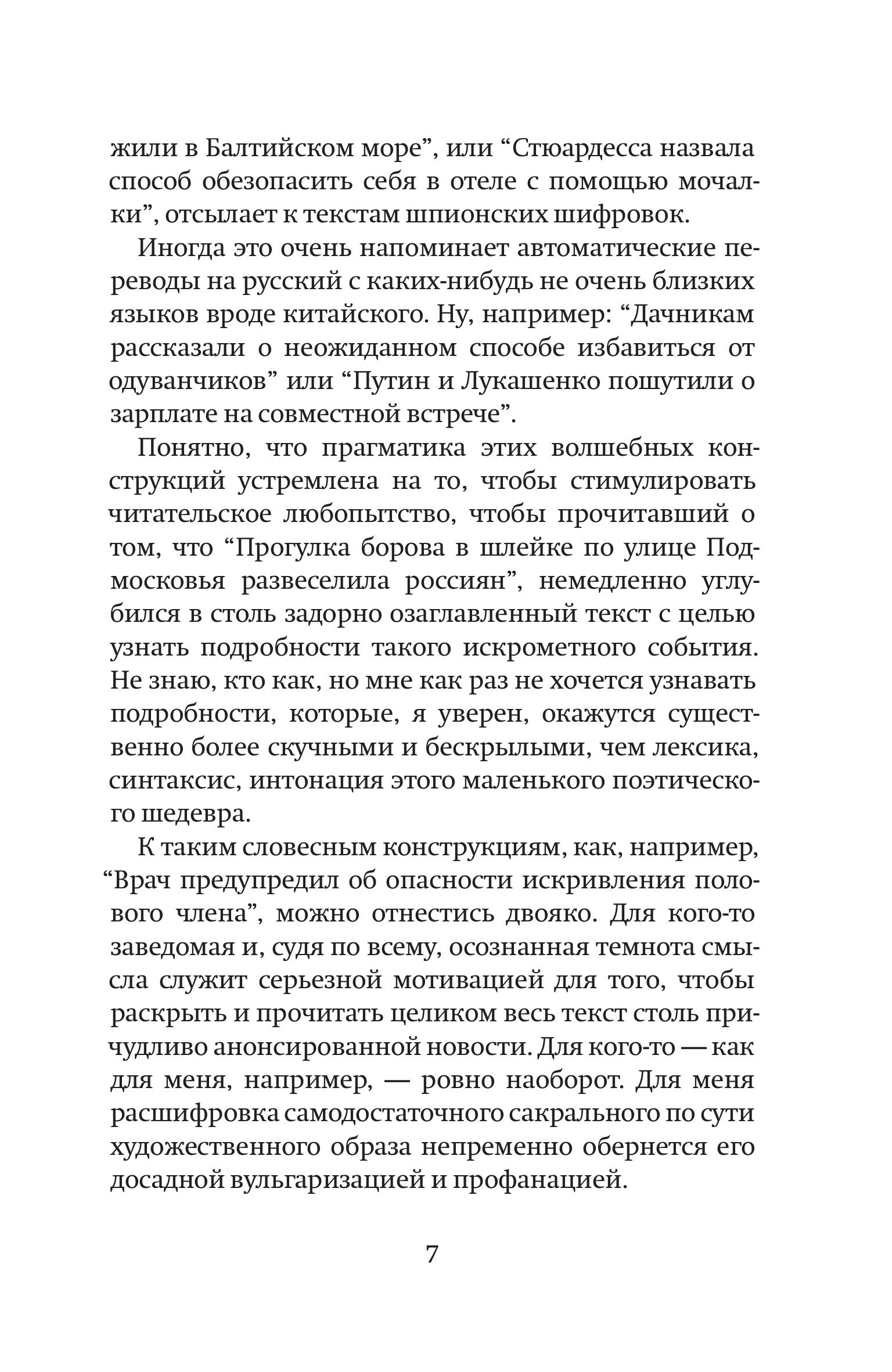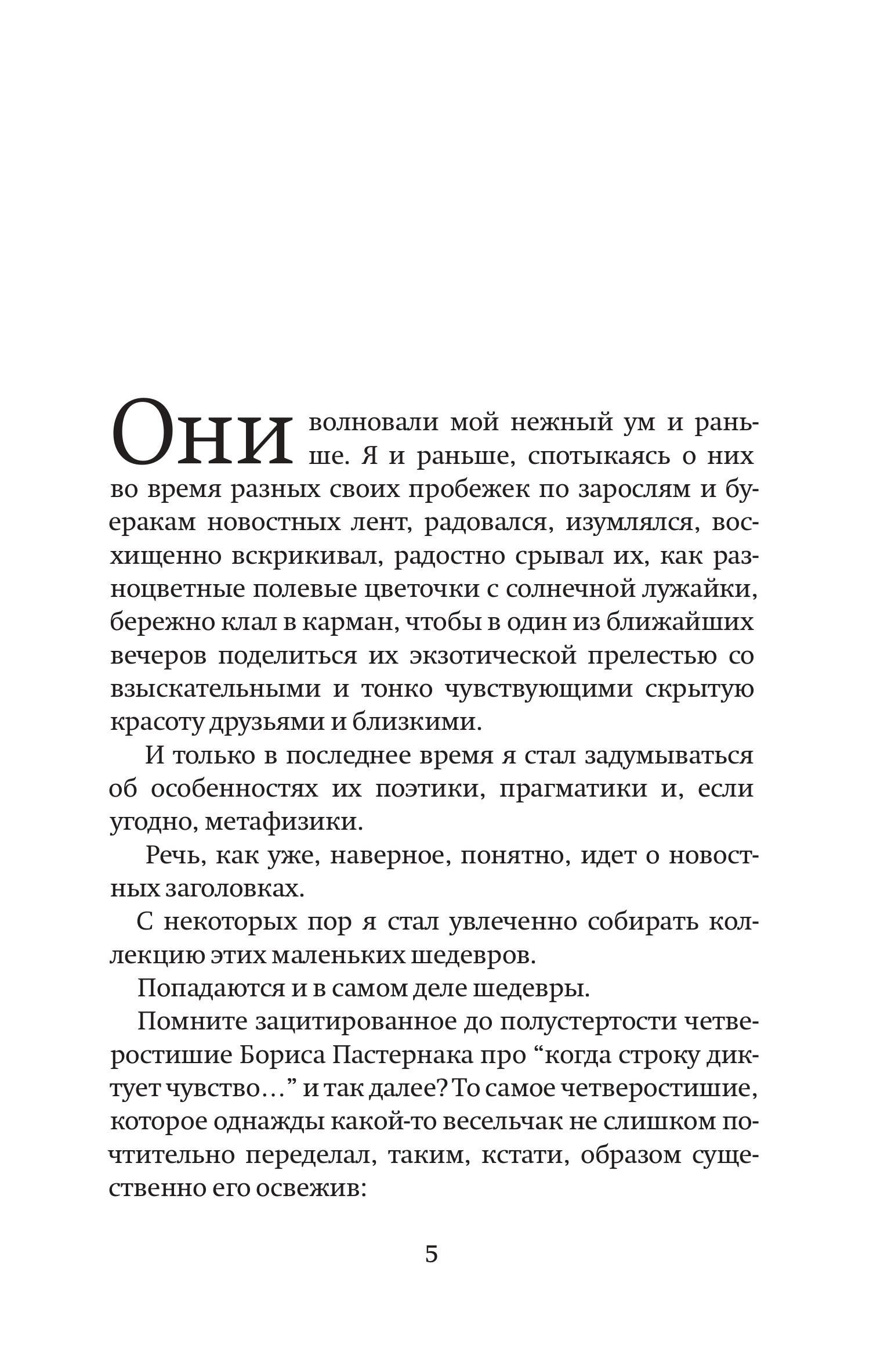 Новая книга Льва Рубинштейна — это одновременно признание в любви к новостным заголовкам и попытка понять, как устроена их причудливая поэтика. Собирая коллекцию маленьких шедевров этого жанра, автор сопровождает их комментариями, в которых воспоминания перемежаются с размышлениями о сегодняшней исторической реальности. В основе такой композиции лежит парадокс: новостные заголовки, обычно сводимые к своей прикладной функции, вдруг становятся аккумуляторами неожиданных значений и смыслов, наслаивающихся друг на друга и превращающих информационный шум в поэзию.