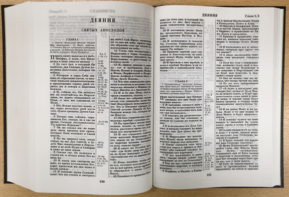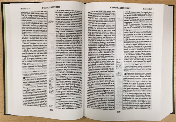 Священное Писание в Синодальном переводе, без неканонических книг Ветхого Завета. Сохранено постраничное расположение текста издания 1947 г. (набор в 2 колонки, указатель параллельных мест посередине страницы). Словарь, цветные географические карты.
