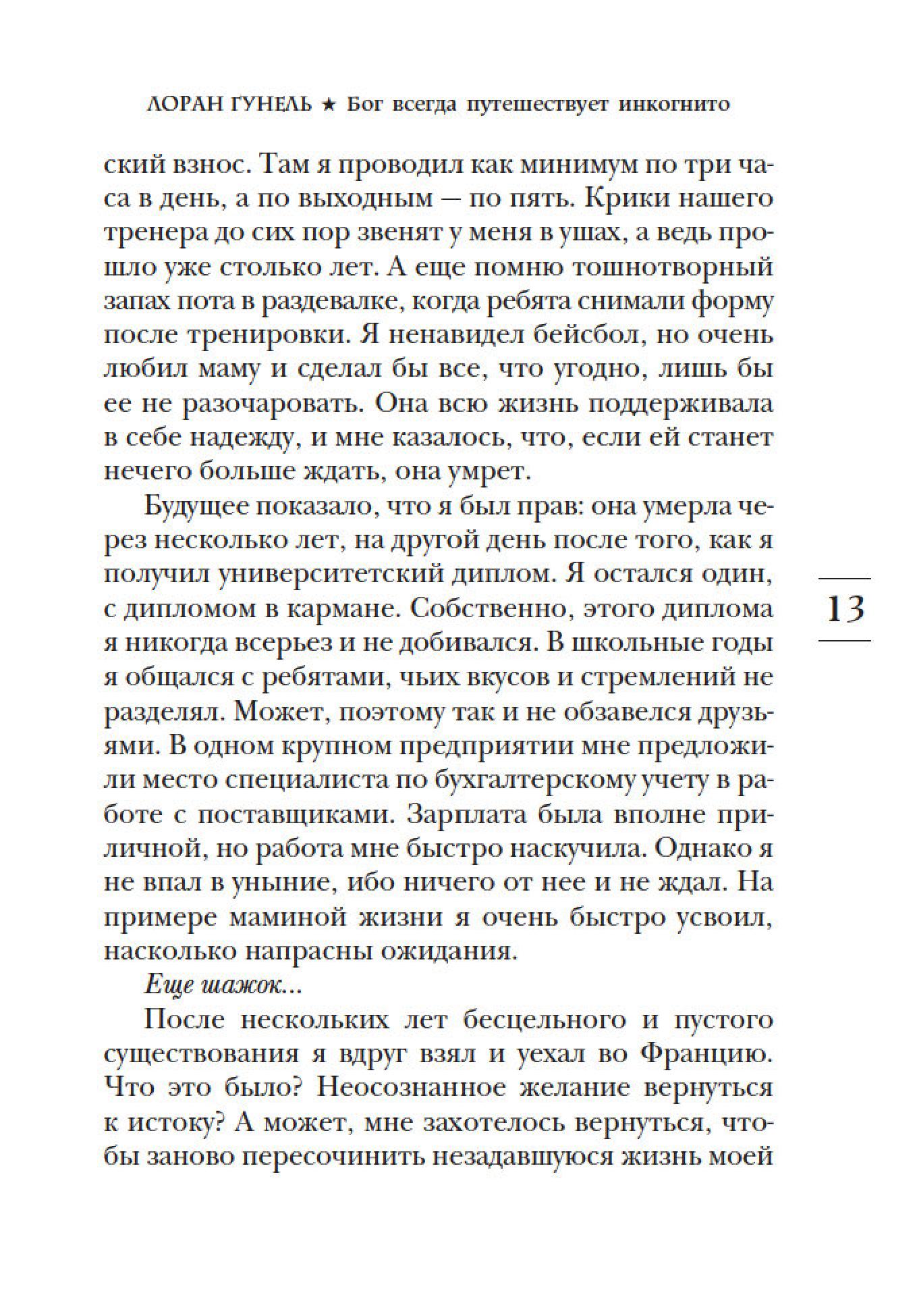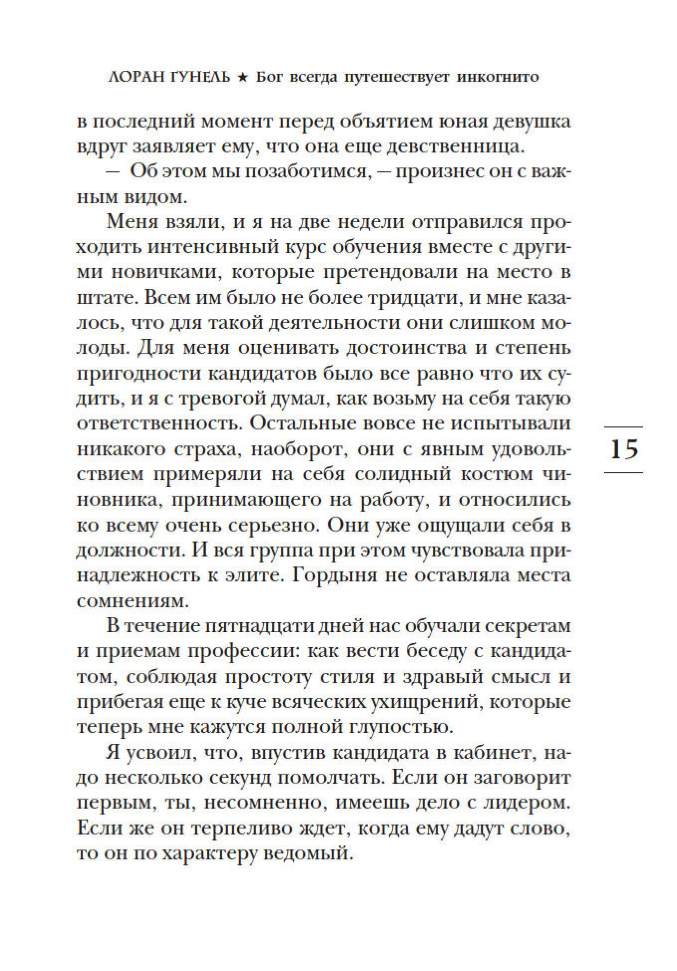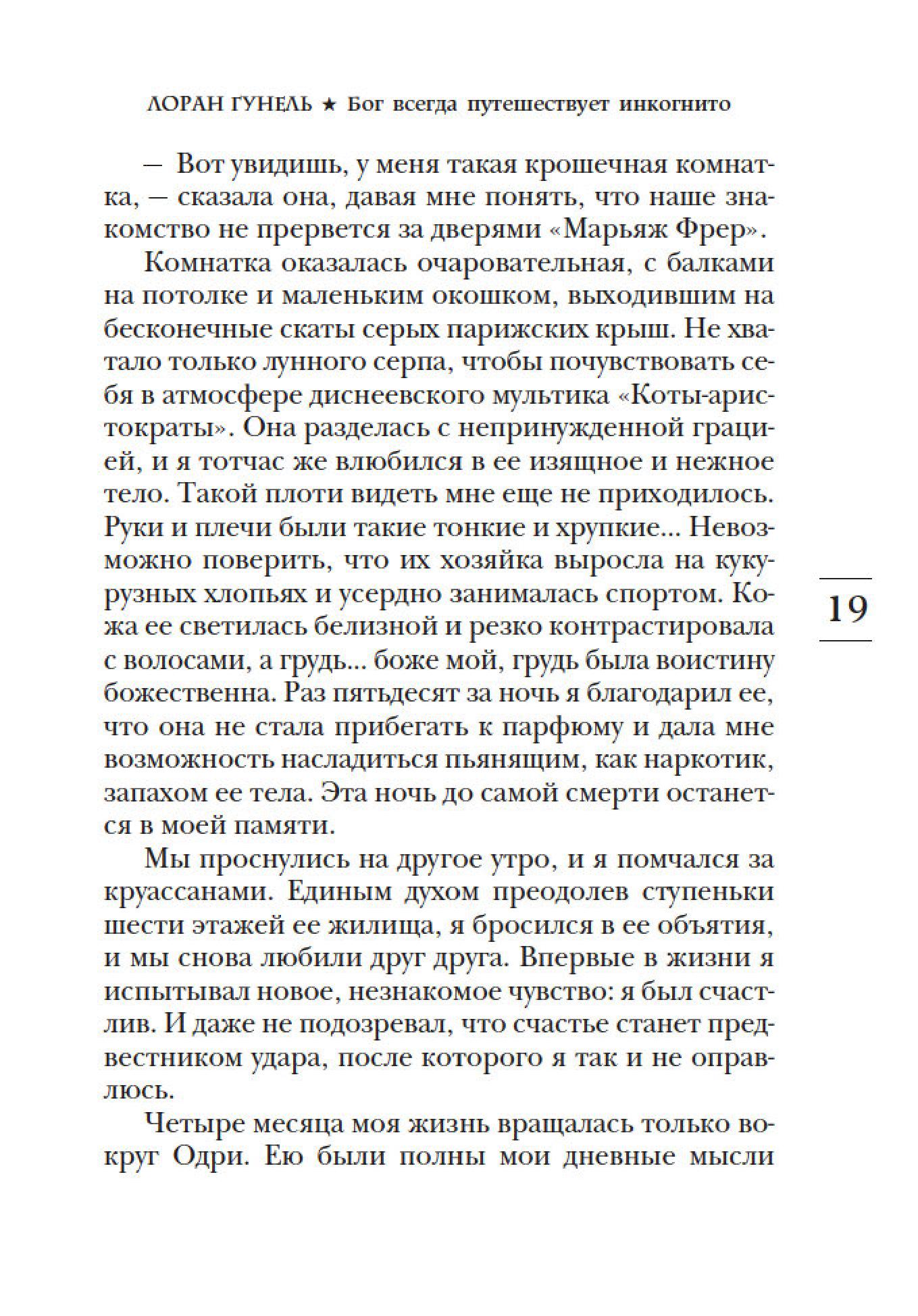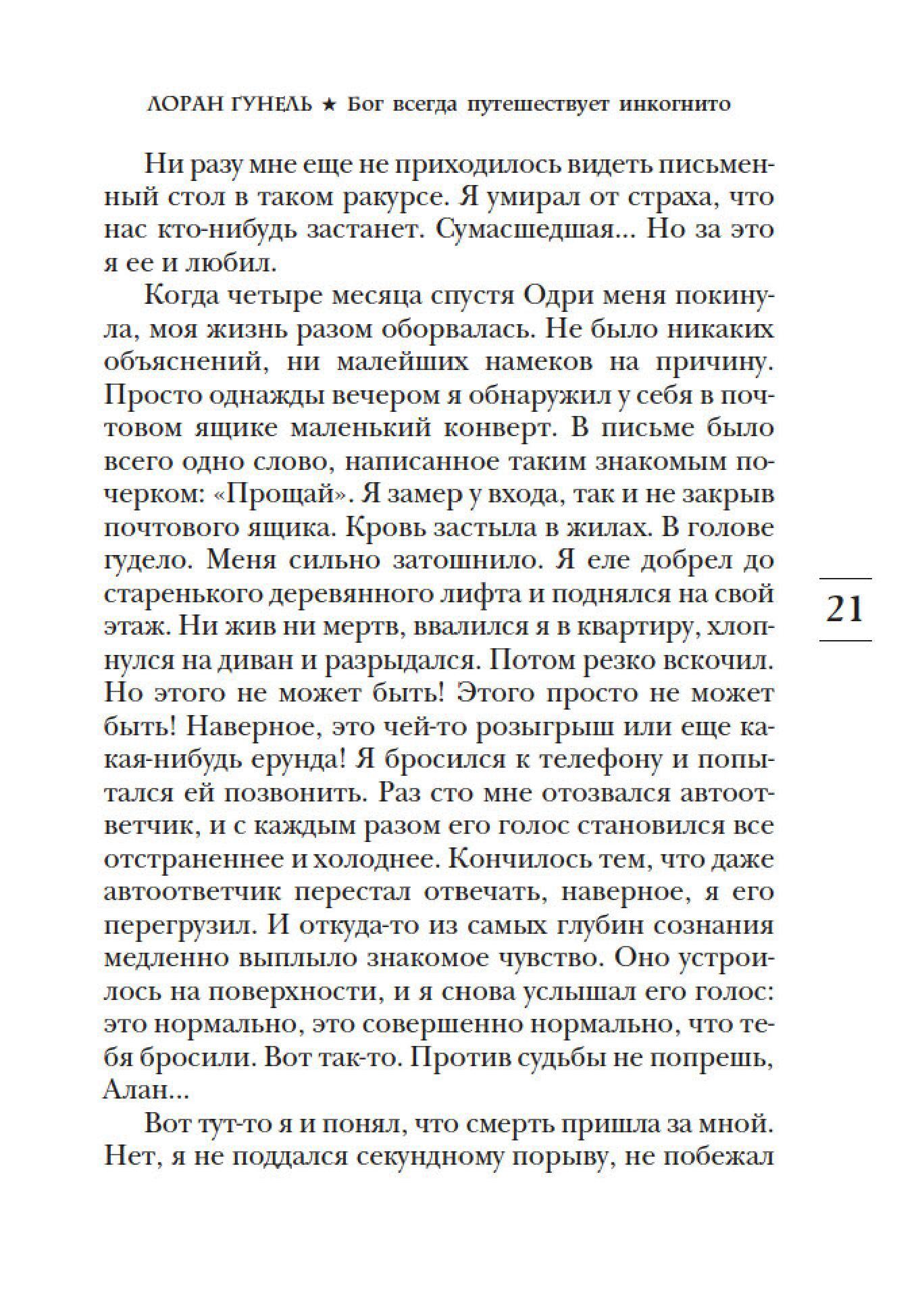 Книга «Бог всегда путешествует инкогнито» Лорана Гунеля, входящего в пятерку самых популярных беллетристов Франции, стала всемирным бестселлером, несколько лет возглавляла топ-листы продаж во Франции и была переведена на множество языков.