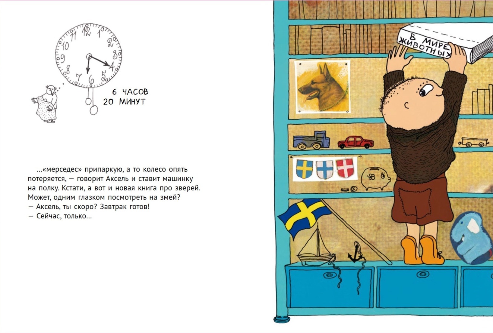 Шесть утра, Аксель собирается в детский сад, но его все время что-то отвлекает: то находится платье для куклы, то рвется страница в любимой книжке, то завораживает фотография в газете. Папа повторяет «давай скорее, Аксель!» и потихоньку звереет. Но вот бьет семь часов, Аксель успел собраться, а папа… папа не может оторваться от газеты. «Давай скорее, папа» — передразнивает его Аксель — и оба смеются от души.