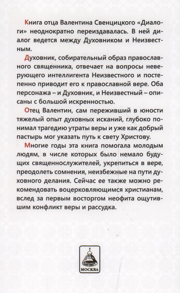 «Диалоги» — это наиболее значительное сочинение выдающегося проповедника Русской Православной Церкви протоиерея Валентина Свенцицкого (1881 — 1931). Оно написано в классической форме диалогов между неверующим интеллигентом и православным священником, разъясняющим основы веры. Книга неоднократно переиздавалась и была популярна среди образованной молодежи. Проблемы, освещенные в этом произведении, наверняка будут интересны и современному читателю: как верующему, так и неверующему или сомневающемуся.