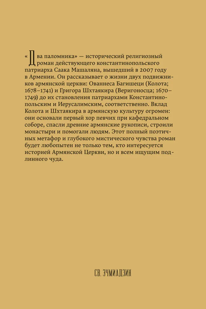 «Два паломника» — исторический религиозный роман действующего константинопольского патриарха Саака Машаляна, вышедший в 2017 году в Армении. Он рассказывает о жизни двух подвижников армянской церкви: Ованнеса Багишеци (Колота; 1678–1741) и Григора Шхтаякира (Веригоносца; 1670–1749) до их становления патриархами Константинопольским и Иерусалимским, соответственно. Вклад Колота и Шхтаякира в армянскую культуру огромен: они основали первый хор певчих при кафедральном соборе, спасли древние армянские рукописи, строили монастыри и помогали людям. Этот полный поэтичных метафор и глубокого мистического чувства роман будет любопытен не только тем, кто интересуется историей Армянской Церкви, но и всем ищущим подлинного чуда.