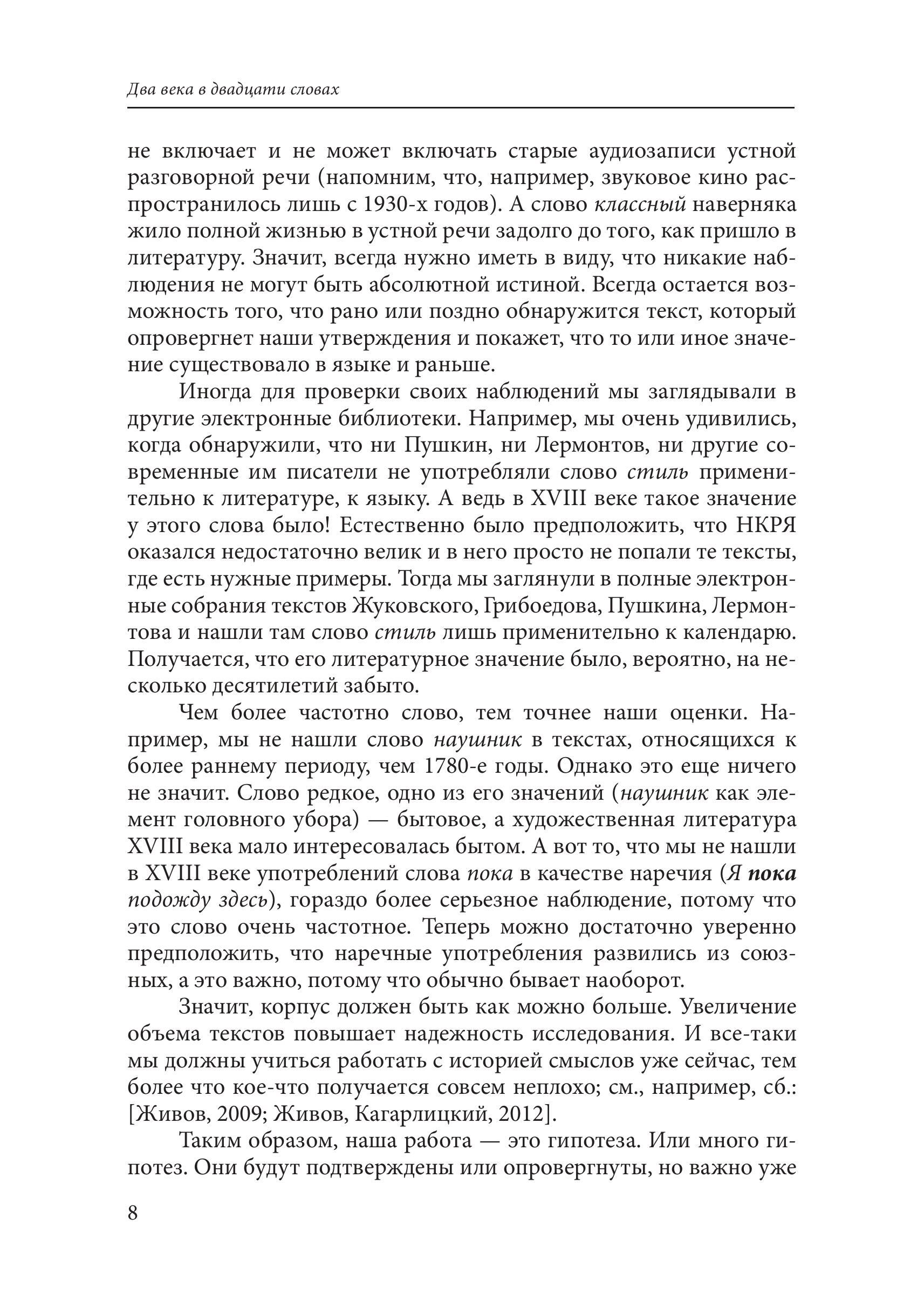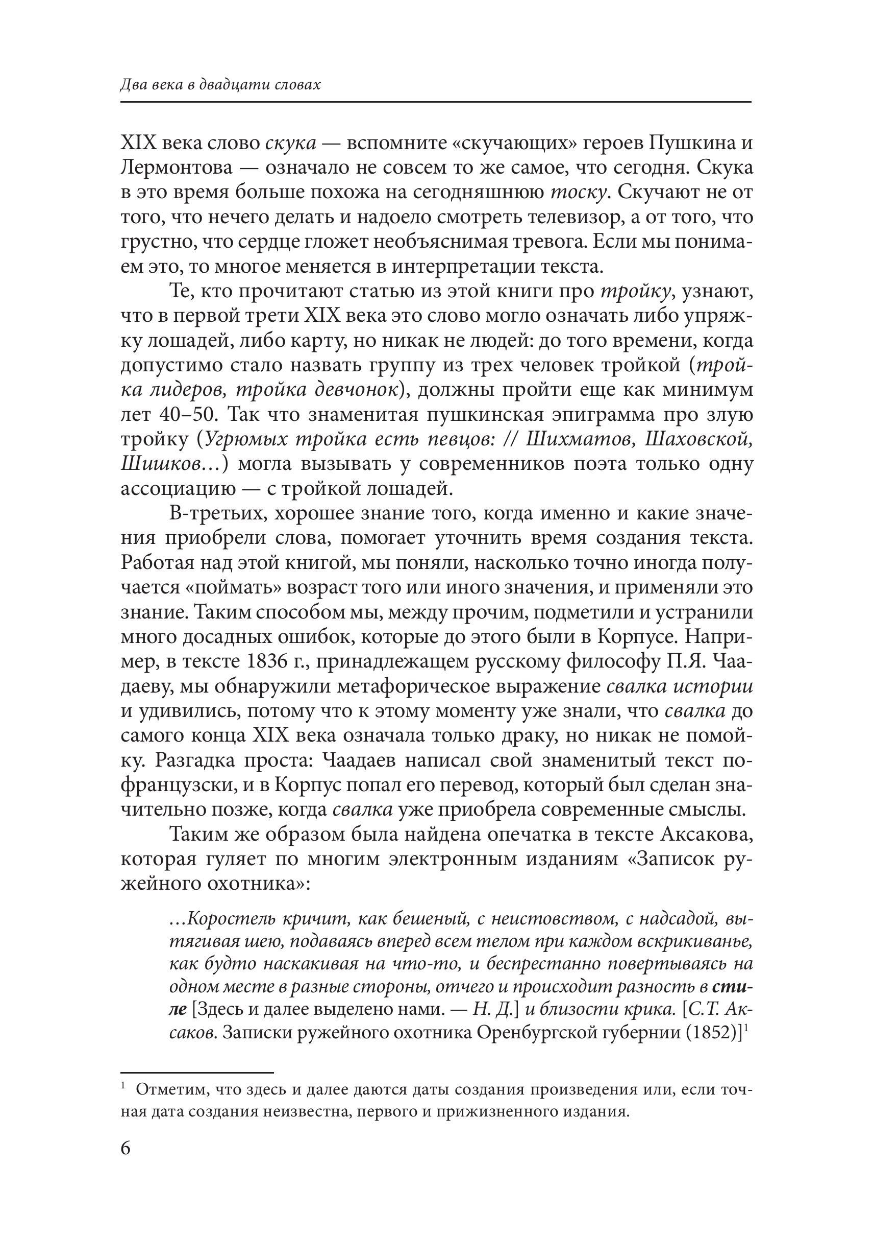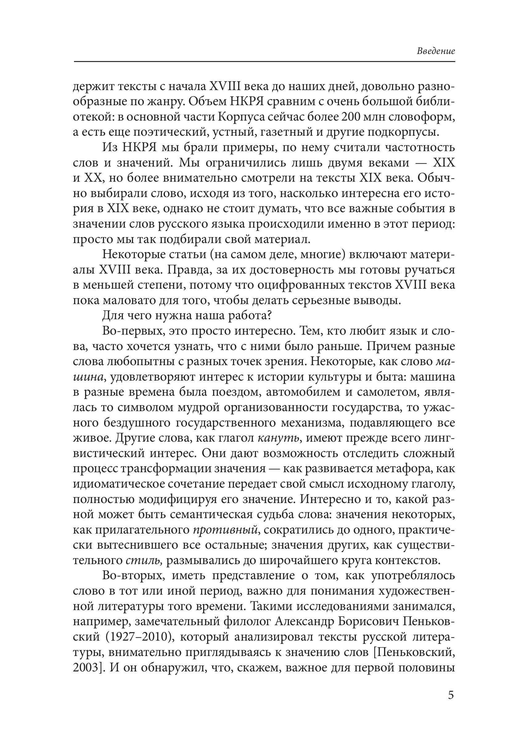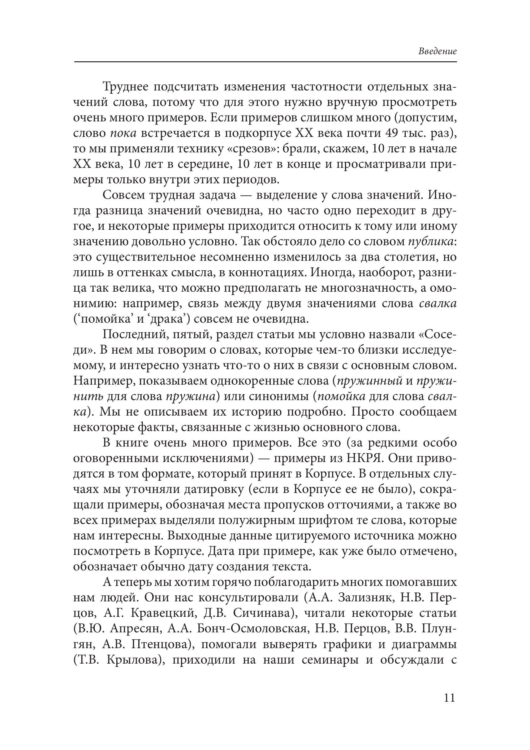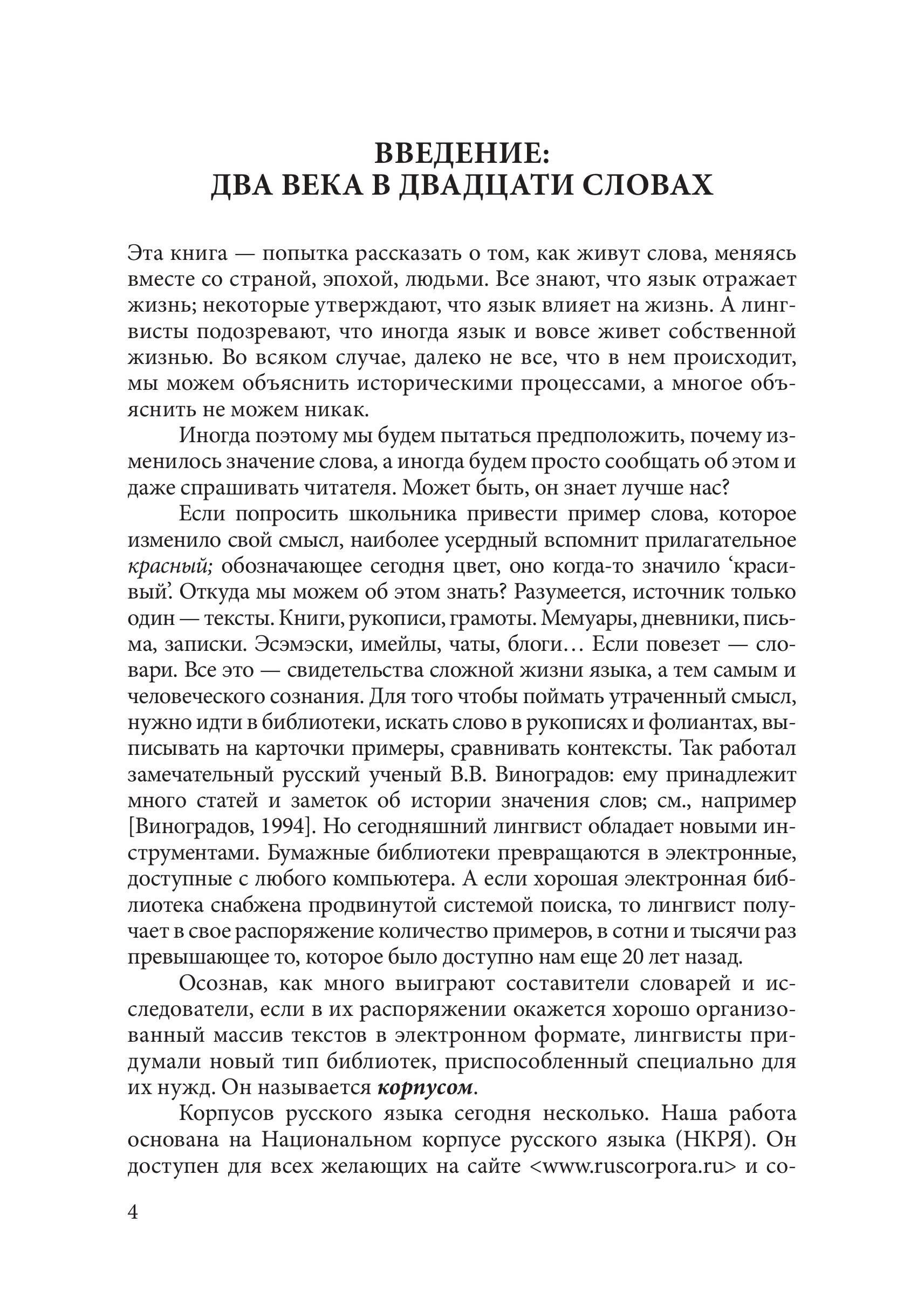 Книга рассказывает о том, как менялись значения двадцати русских слов на протяжении двух столетий, с начала XIX века (а иногда с середины XVIII века), когда свалка еще не была помойкой, мама не была матерью, а тёти не было вовсе. Читатель узнает, кого А.И. Герцен называл классными ворами, когда слово сволочь стало ругательством и как наречие пока превращалось в формулу прощания. Изменения значений слов представлены в виде хронологической шкалы, где момент первого появления нового смысла определен с точностью до десятилетия.
