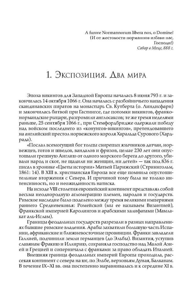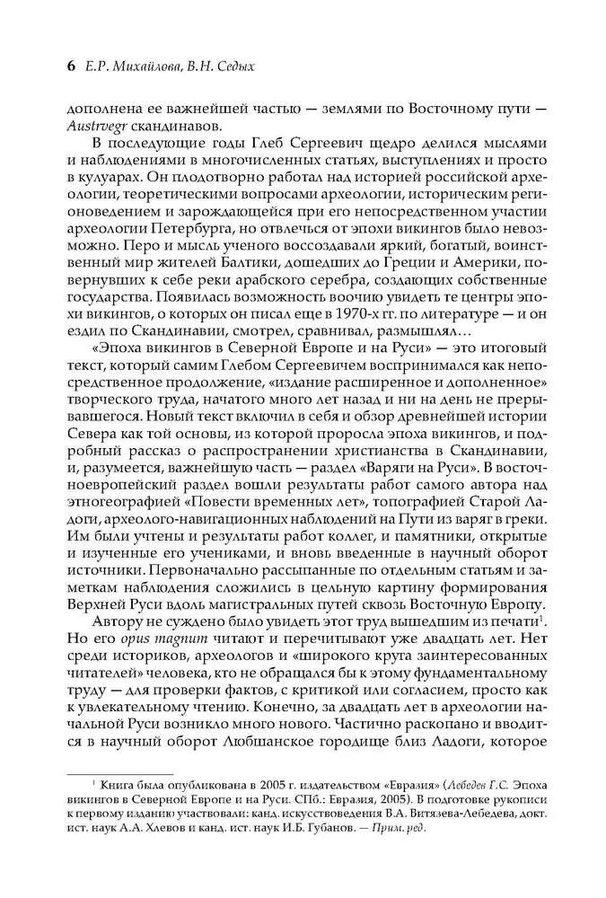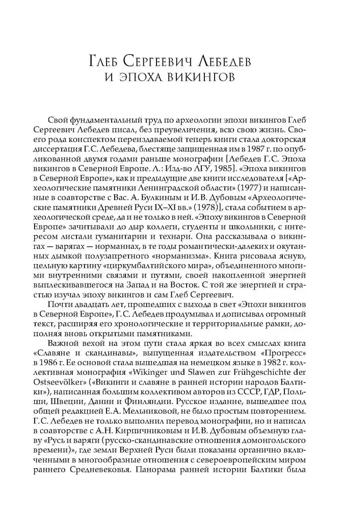 Исследование Г.С. Лебедева посвящено малоисследованной в российской исторической литературе теме — заключительному этапу перехода народов Европы от первобытнообщинного строя к классовому обществу. В ней рассматриваются основные этапы деятельности викингов в Западной Европе, показана несостоятельность норманистстских построений западной историографии. Впервые на конкретных данных истории, археологии, нумизматики и языка раскрывается значение Древней Руси для внутреннего развития скандинавских стран, показано ведущее место Древнерусского государства в международных связях народов Балтийского региона, роль варягов в истории Киевской Руси IX–XI вв. Богатый иллюстративный материал, ясность и последовательность изложения мысли, равно как и увлекательное повествование, привлекут внимание не только специалистов — историков, археологов, этнографов, но и широкого круга читателей, для которых очевидна связь «проблемы викингов» и «варяжского вопроса» — ключевого вопроса русской истории.