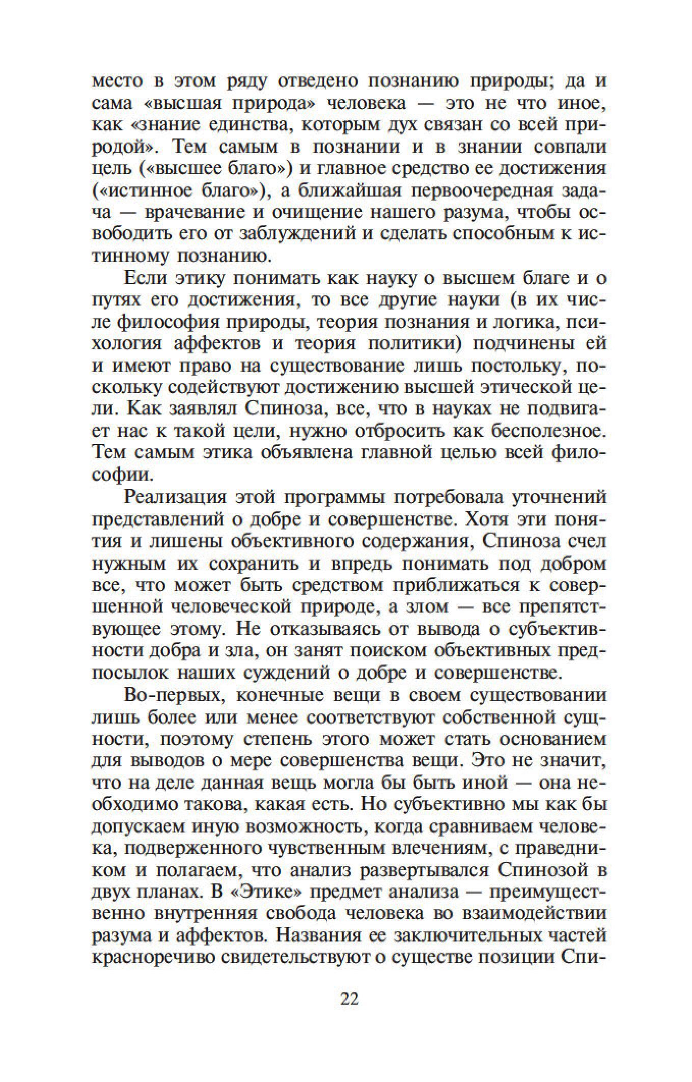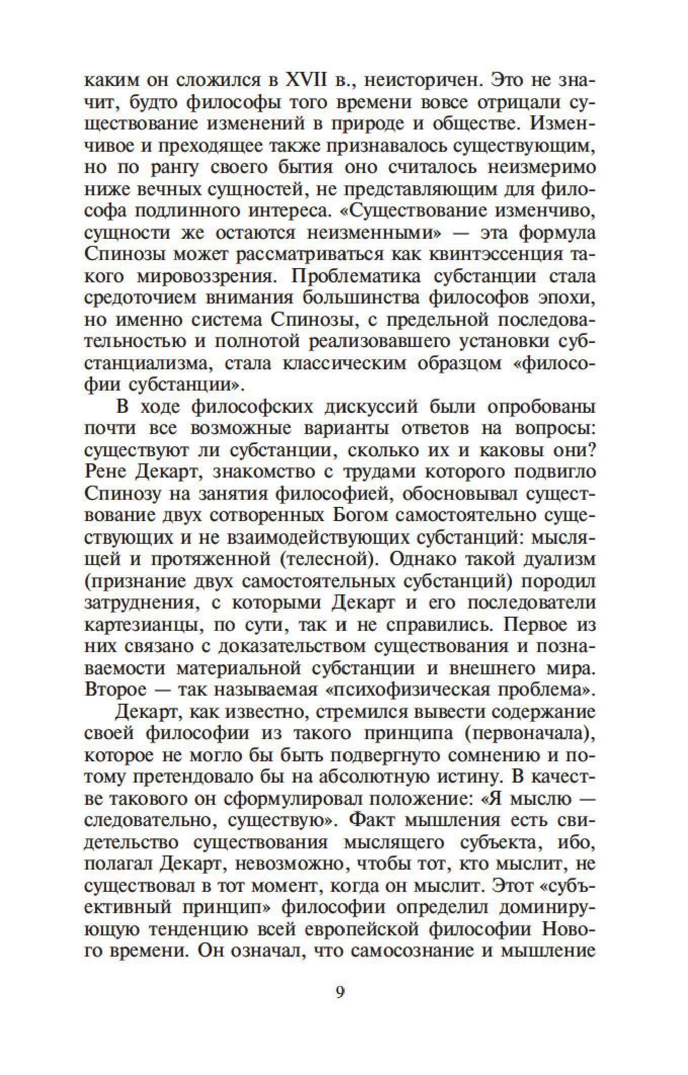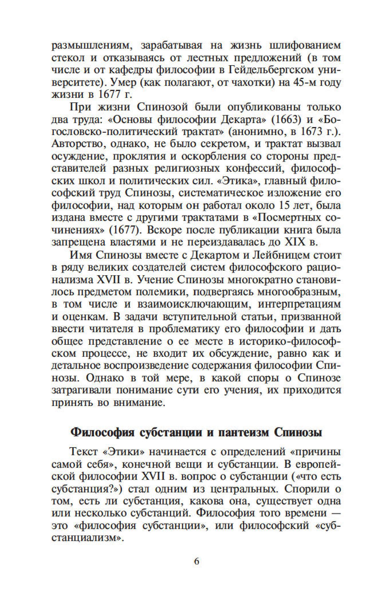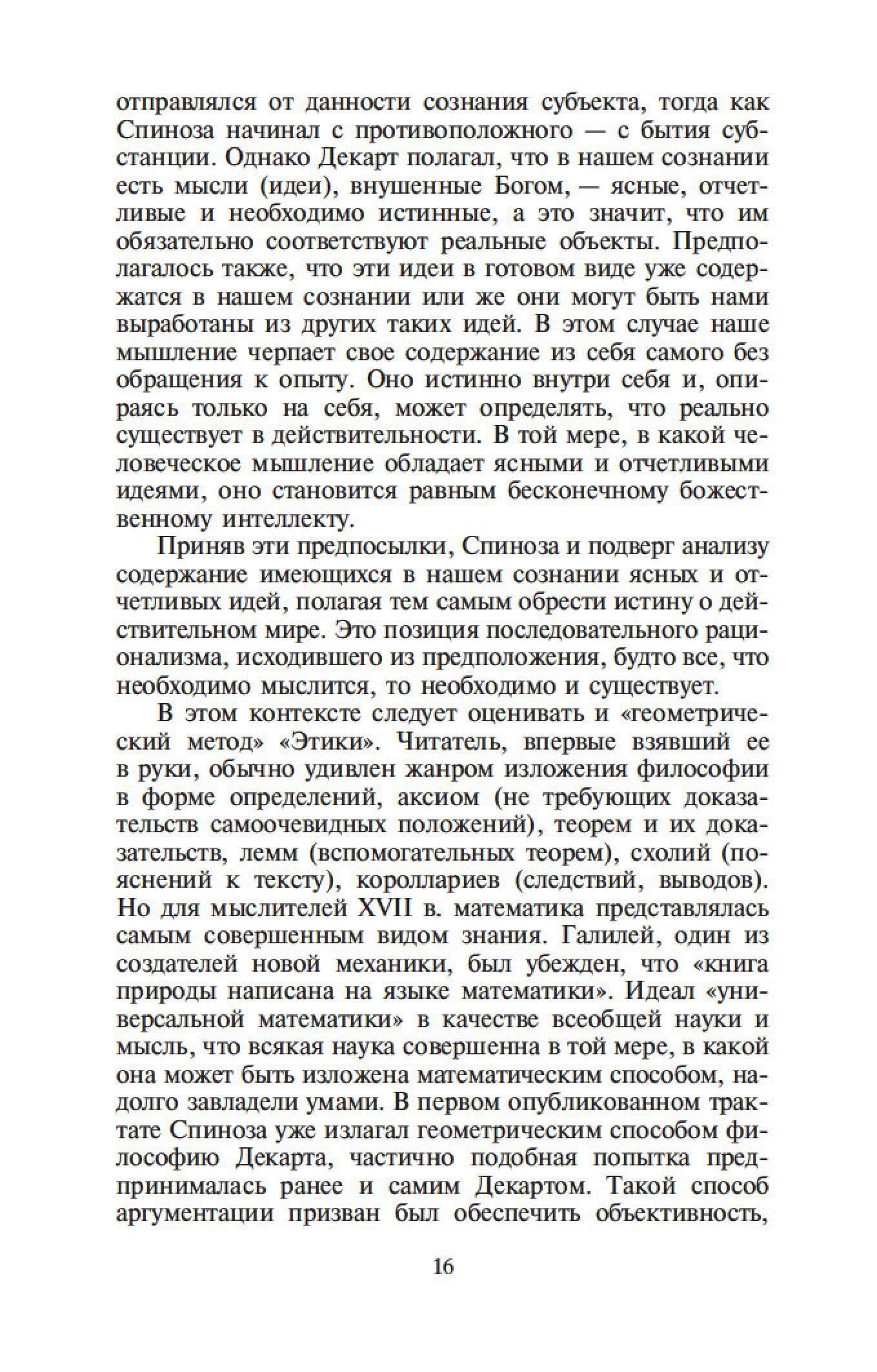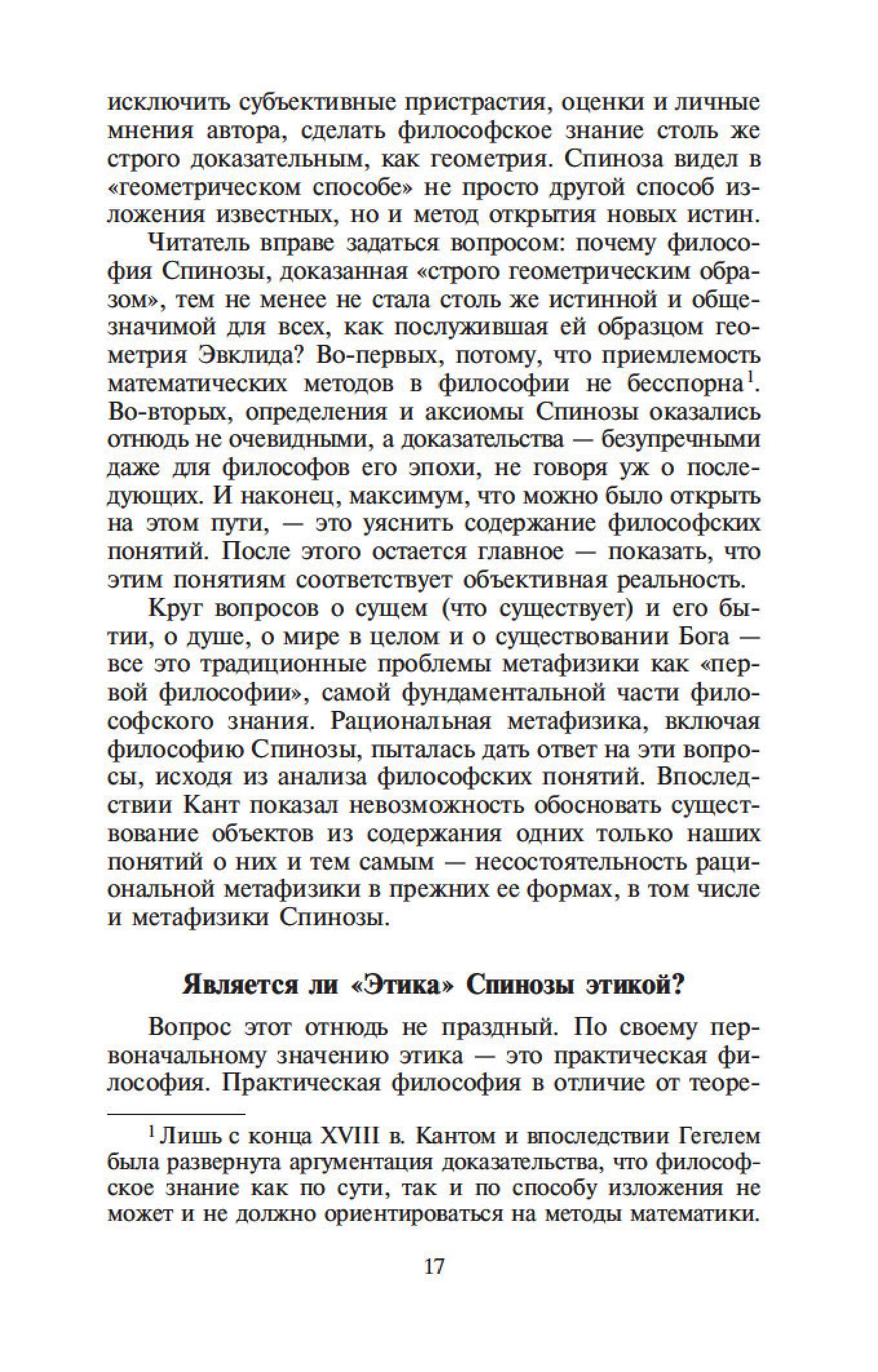 Бенедикт Спиноза — один из величайших философов-рационалистов. Его сочинения составляют эпоху в истории европейской мысли, и их изучение стало необходимым моментом всех учебных курсов по метафизике. Характерной чертой трактатов Спинозы является строгая последовательность мысли и четкая организация текста. Идеи Спинозы, особенно его центрального произведения, «Этики», оказали мощное воздействие на культуру XVII–XIX столетий: Спинозу любили, читали, толковали, с ним спорили не только такие философы, как Беркли, Юм, Шеллинг, Гегель, но и великие ученые, просветители, поэты — Дидро, Гередер, Гете.