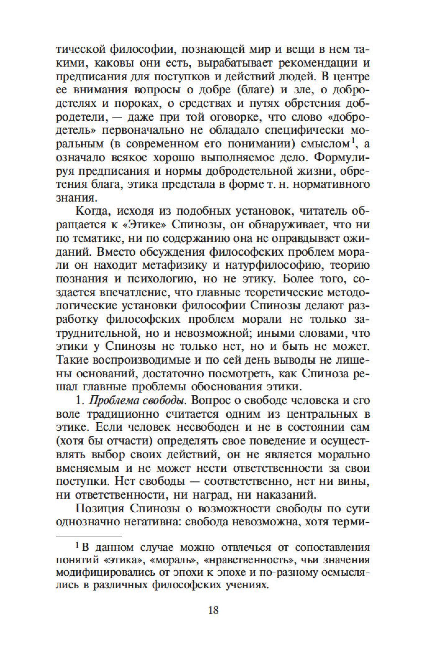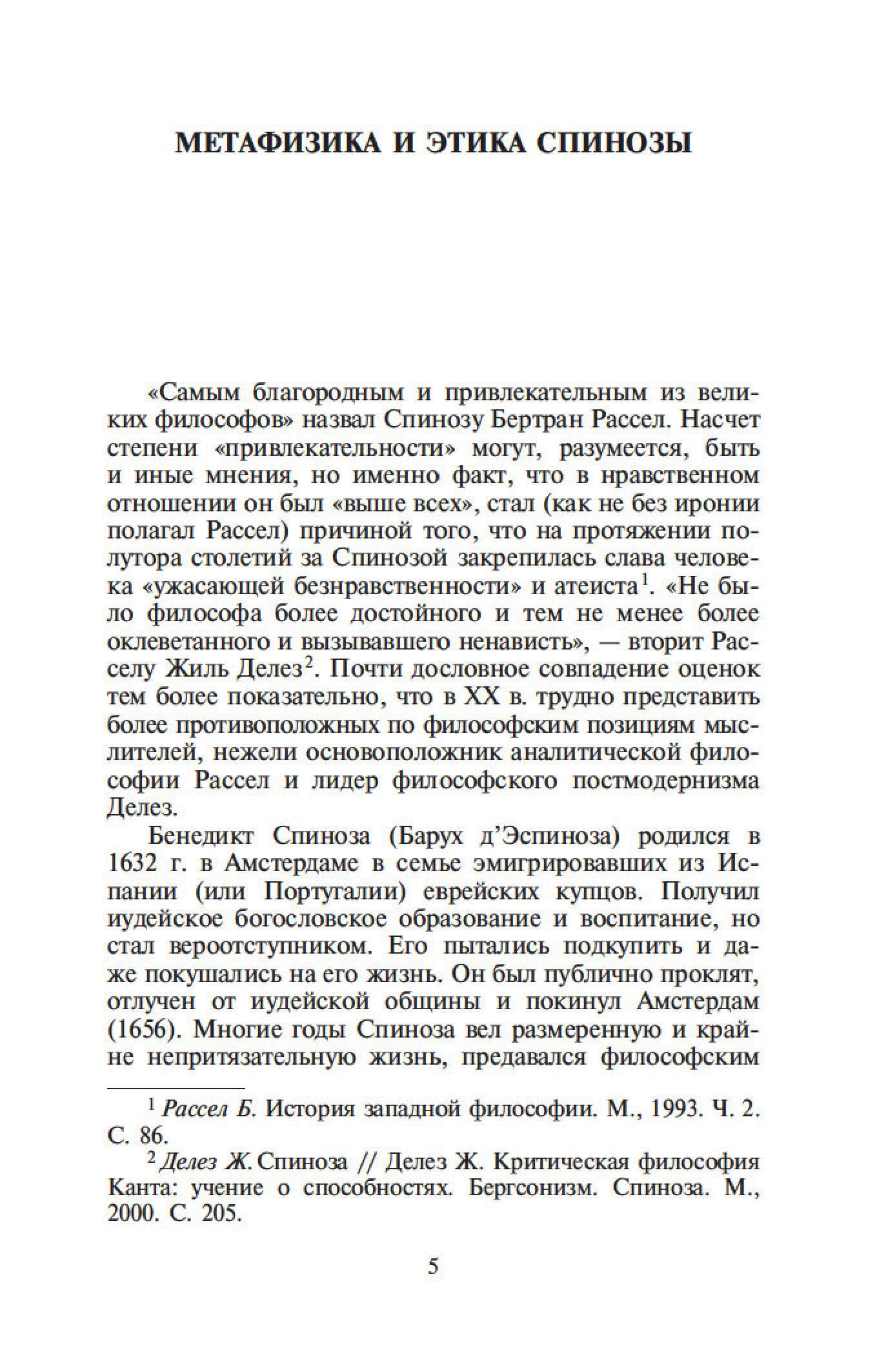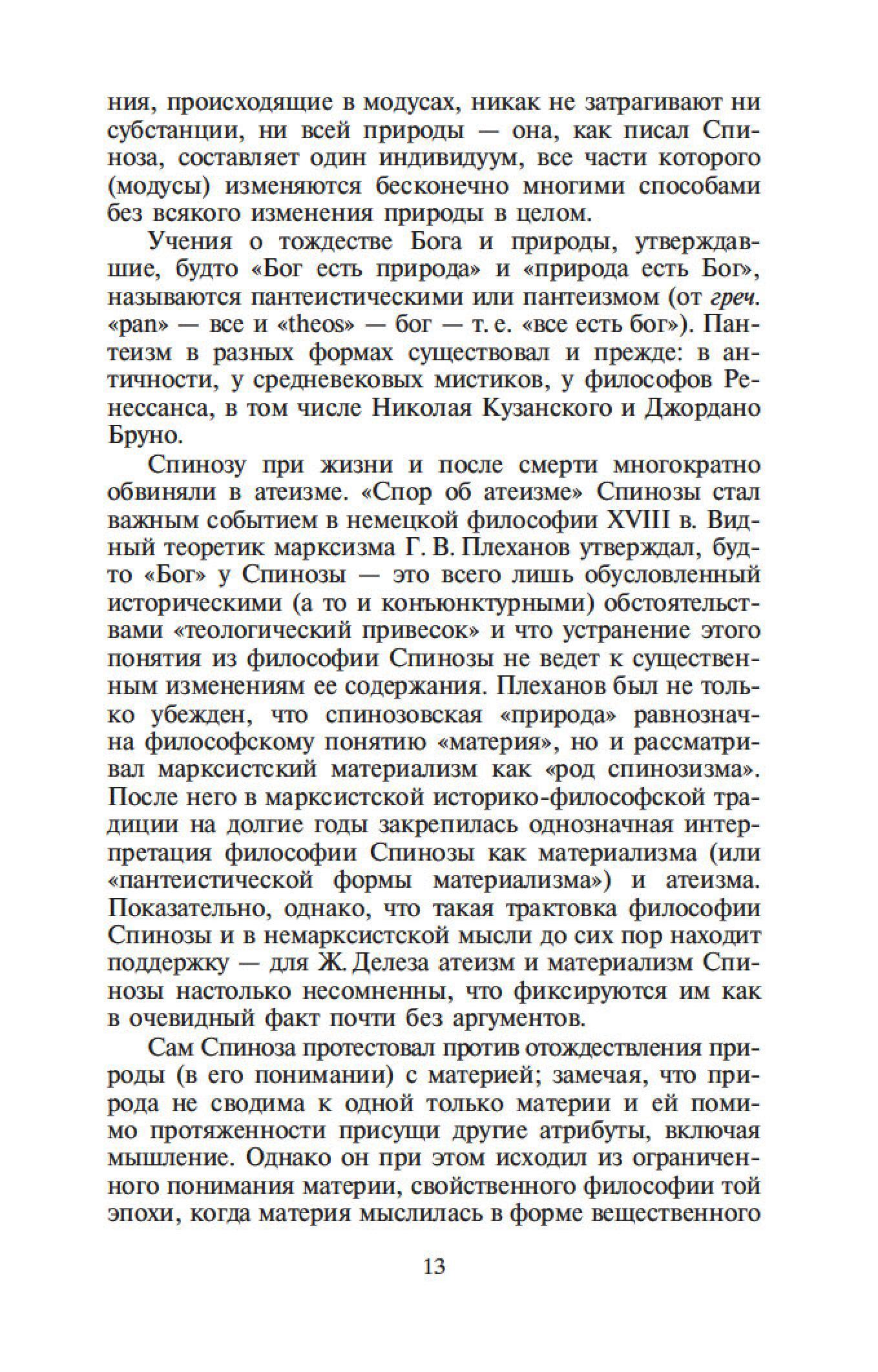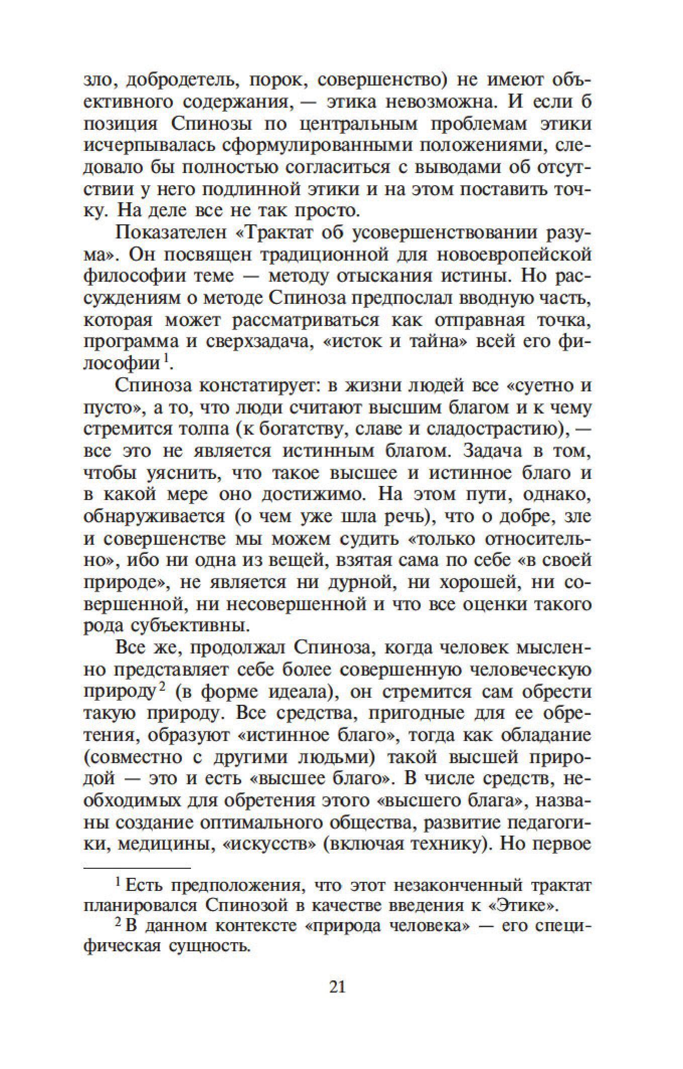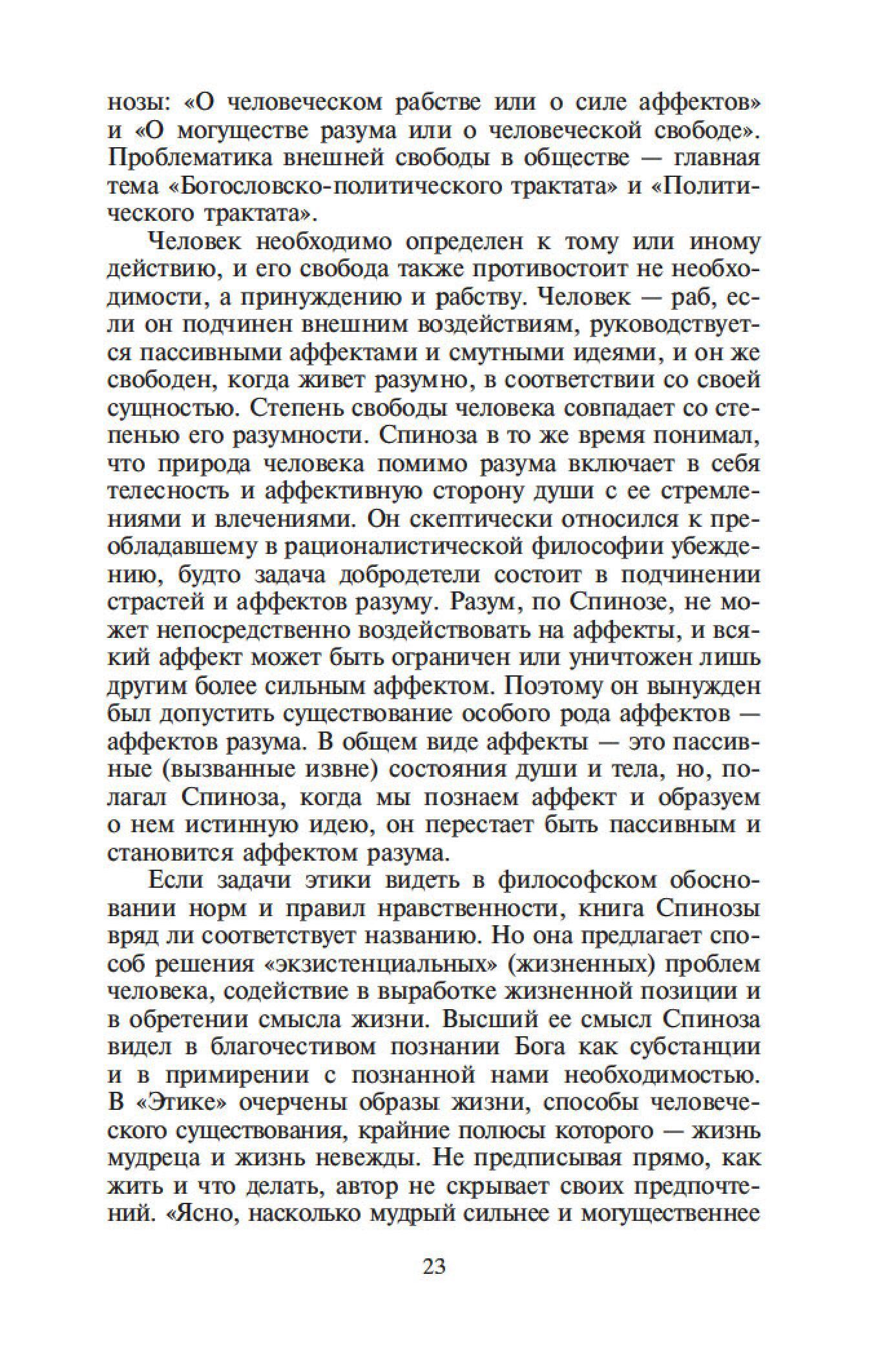 Бенедикт Спиноза — один из величайших философов-рационалистов. Его сочинения составляют эпоху в истории европейской мысли, и их изучение стало необходимым моментом всех учебных курсов по метафизике. Характерной чертой трактатов Спинозы является строгая последовательность мысли и четкая организация текста. Идеи Спинозы, особенно его центрального произведения, «Этики», оказали мощное воздействие на культуру XVII–XIX столетий: Спинозу любили, читали, толковали, с ним спорили не только такие философы, как Беркли, Юм, Шеллинг, Гегель, но и великие ученые, просветители, поэты — Дидро, Гередер, Гете.