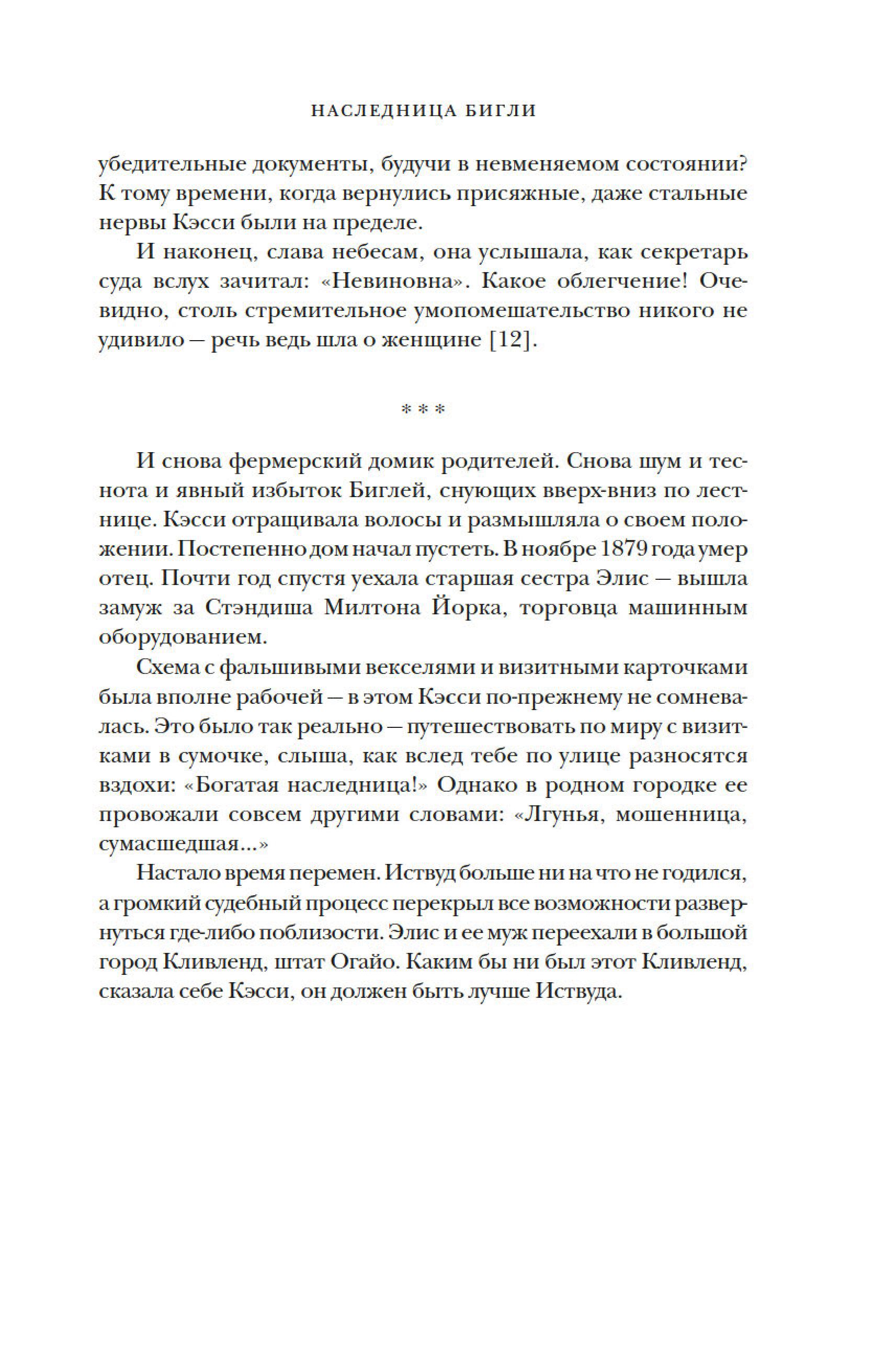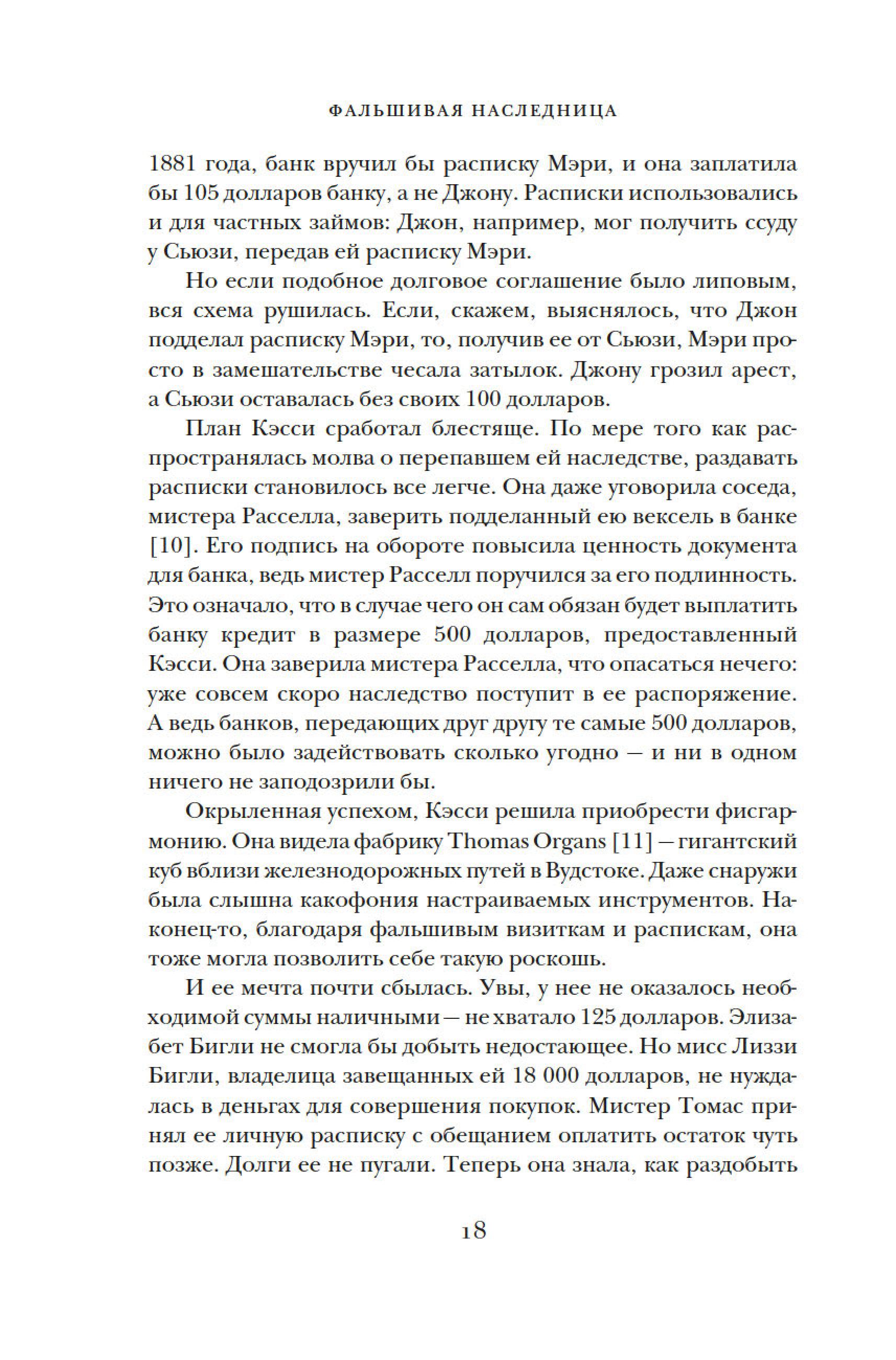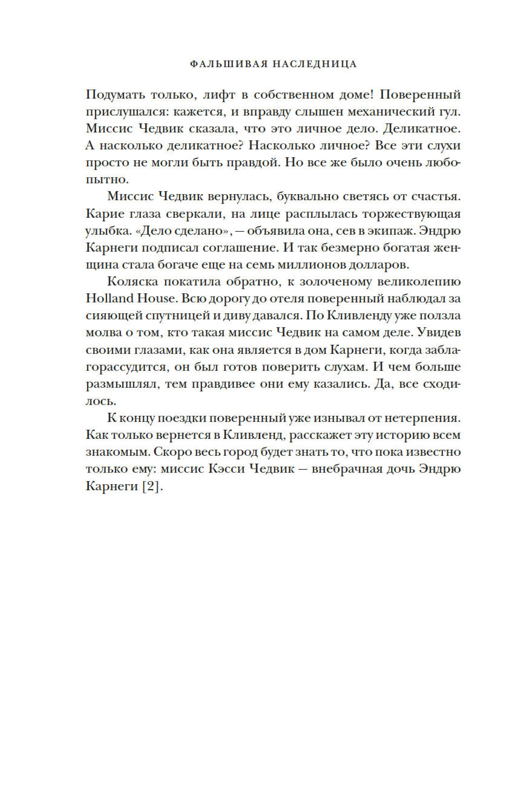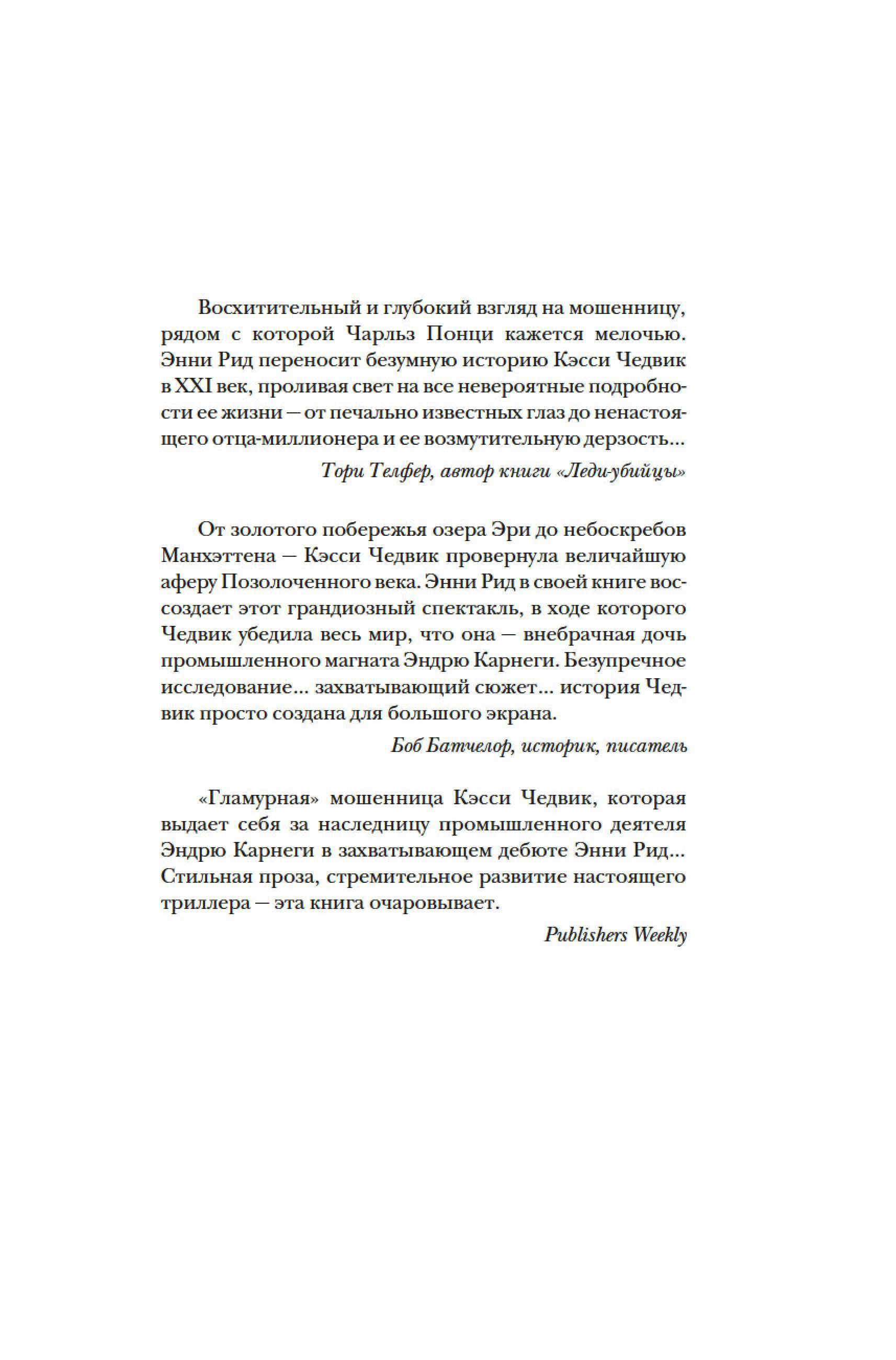 Элизабет Бигли, уроженка маленького городка в канадской провинции, в юном возрасте открыла в себе талант к убеждению и хитроумным выдумкам. Именно благодаря этой способности она станет одной из самых известных аферисток в истории. Меняя имена и придумывая новые уловки, Кэсси Чедвик смогла прожить 14 лет за счет кредитов, которые подкрепляла поддельными векселями, очаровывала одного банкира за другим и убеждала всех вокруг, что она дочь знаменитого Эндрю Карнеги. Книга писательницы Энни Рид рассказывает одну из самых захватывающих историй о жизни американского общества конца XIX века.