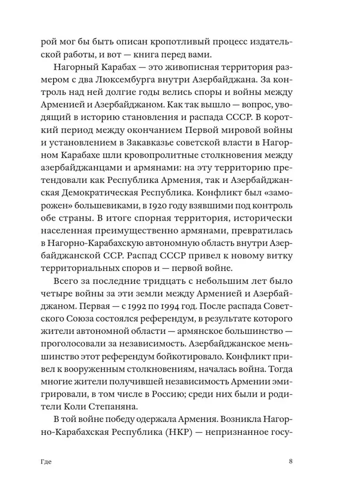 В 2020 году 22-летний московский армянин Коля Степанян отправился в Армению, где втайне от родителей встал на военный учет. Из армии его отправили на войну, которая вошла в историю как «Вторая карабахская». После двух недель боевых действий он пропал без вести на 70 дней. Где он был, что там происходило и как вместе с несколькими сослуживцами ему удалось оттуда выбраться — об этом Коля написал книгу «Где»: страшную, смешную, во многом неудобную и чертовски правдивую.