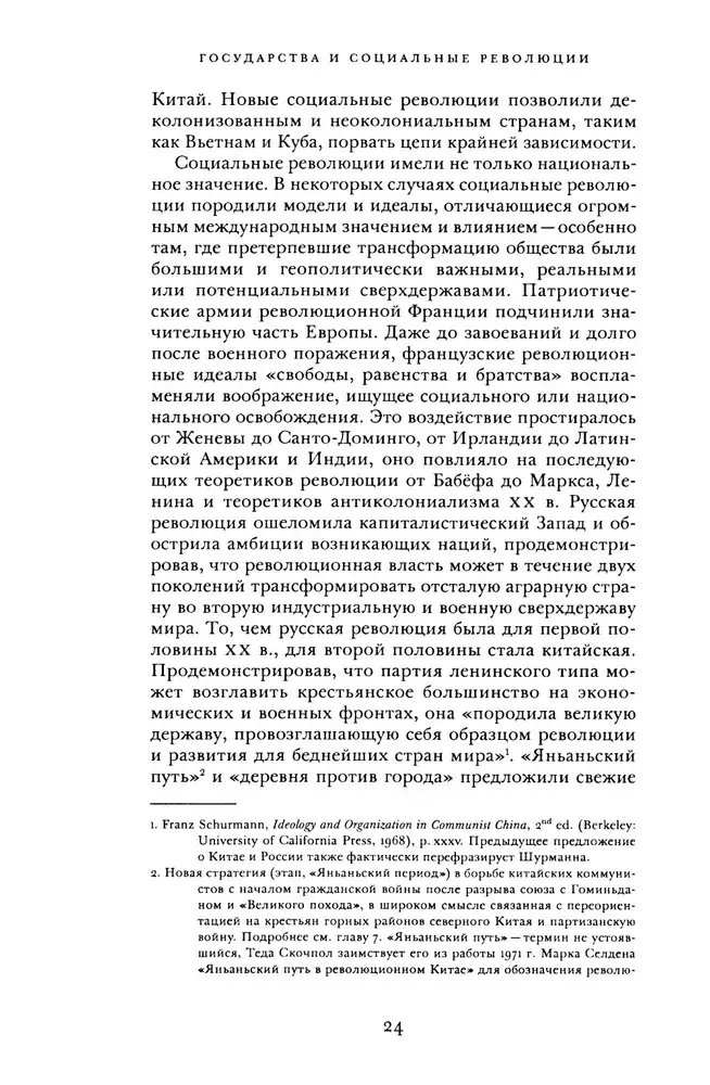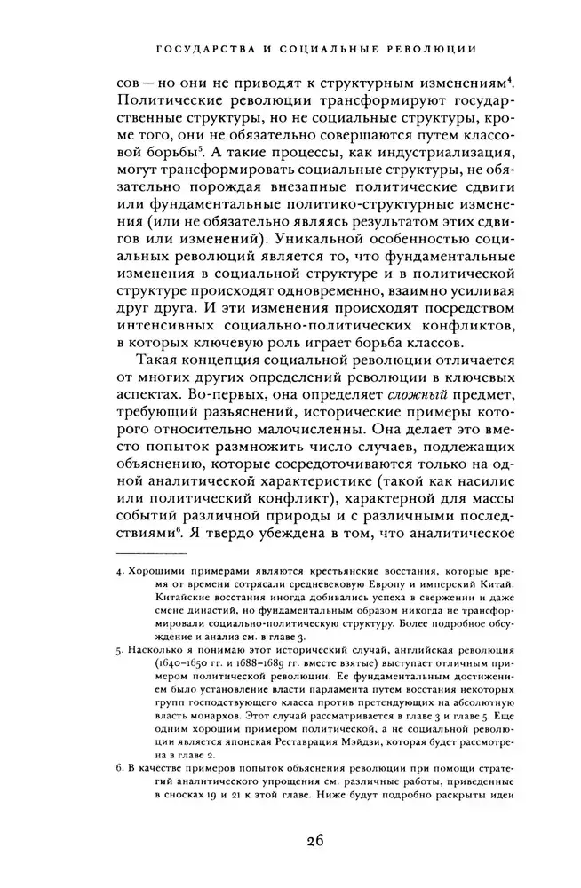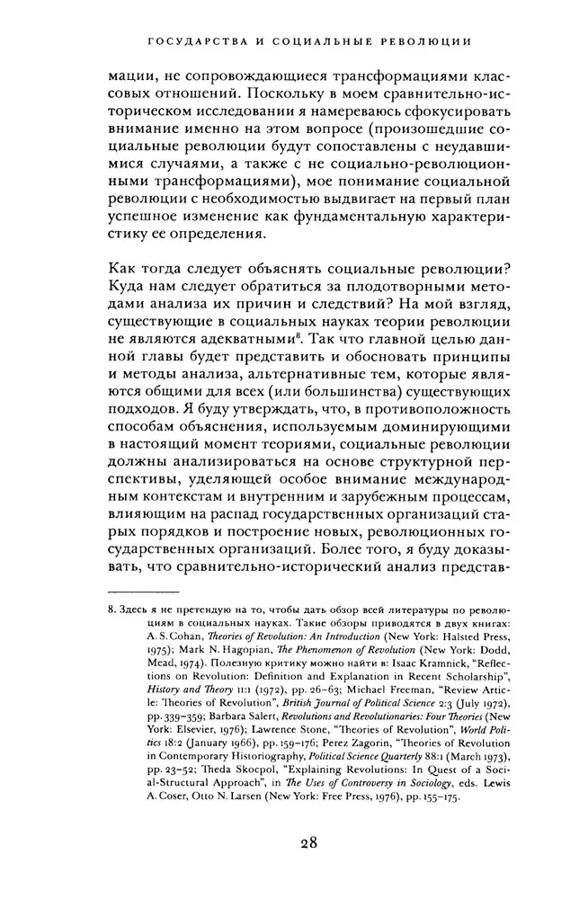 Теда Скочпол демонстрирует, каким образом сочетание таких факторов, как государственные структуры, внешнеполитические и внешнеэкономические силы и отношения классов, позволяет объяснить истоки социальных революций и их свершения. Считая, что существующие теории революции, как марксистские, так и немарксистские, недостаточны для объяснения их реальных исторических закономерностей, автор призывает нас взглянуть на революции по-новому. Прежде всего она настаивает на том, что государства, рассматриваемые как организации, осуществляющие управление и принуждение, потенциально автономные от классовых интересов и контроля со стороны классов, должны стать главным элементом в объяснениях революций.