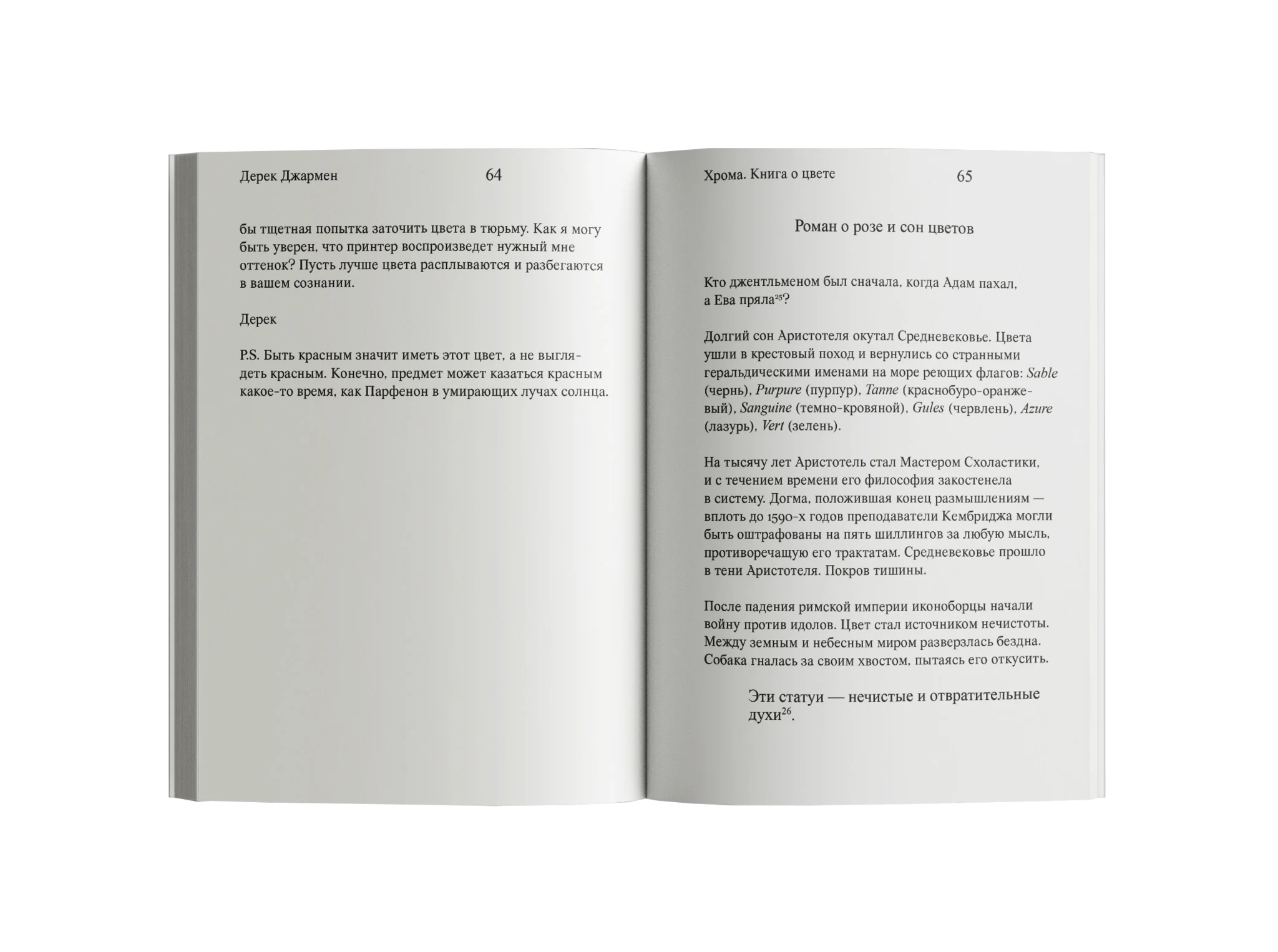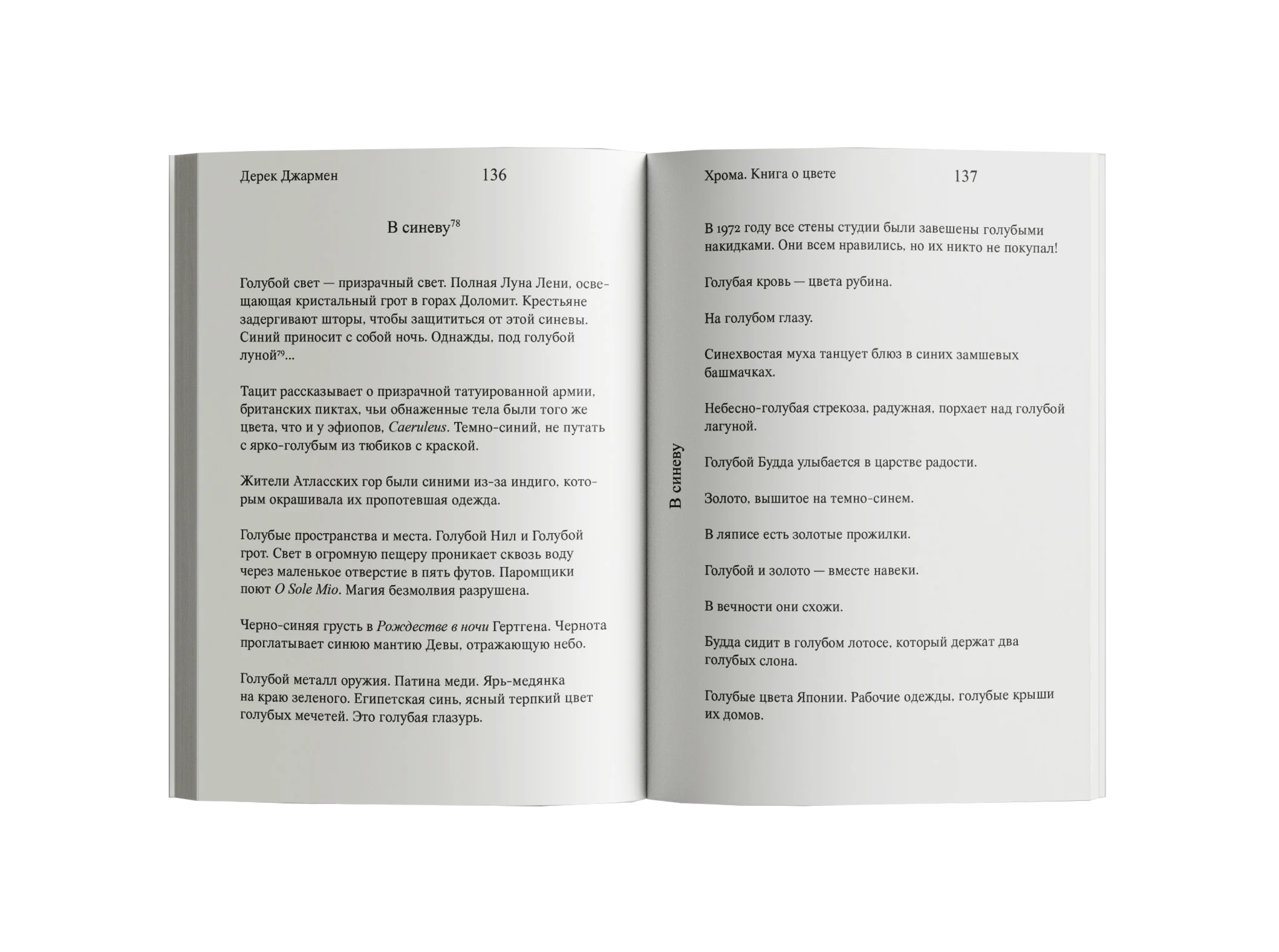 «Хрома» — размышления о цветовом многообразии знаменитого британского режиссера и художника Дерека Джармена (1942–1994). В этой книге, написанной в 1993 году, за год до смерти, теряющий зрение Джармен использует все ресурсы письма в попытке передать сложный и неуловимый аспект предмета, в отношении которого у него накопился опыт целой жизни. В своем характерном стиле — лирическом соединении классической теории, анекдотичности и поэзии — Джармен проводит читателя сквозь цветовой спектр, представляя каждый цвет олицетворением эмоций, пробуждая воспоминания и сны. Он объясняет использование цвета в изобразительном искусстве — от Средневековья до Ренессанса и модернистов, обращается к великим теоретикам цвета — от Плиния Старшего до Леонардо, пишет о значении цвета в литературе, науке, философии, психологии, религии и алхимии.