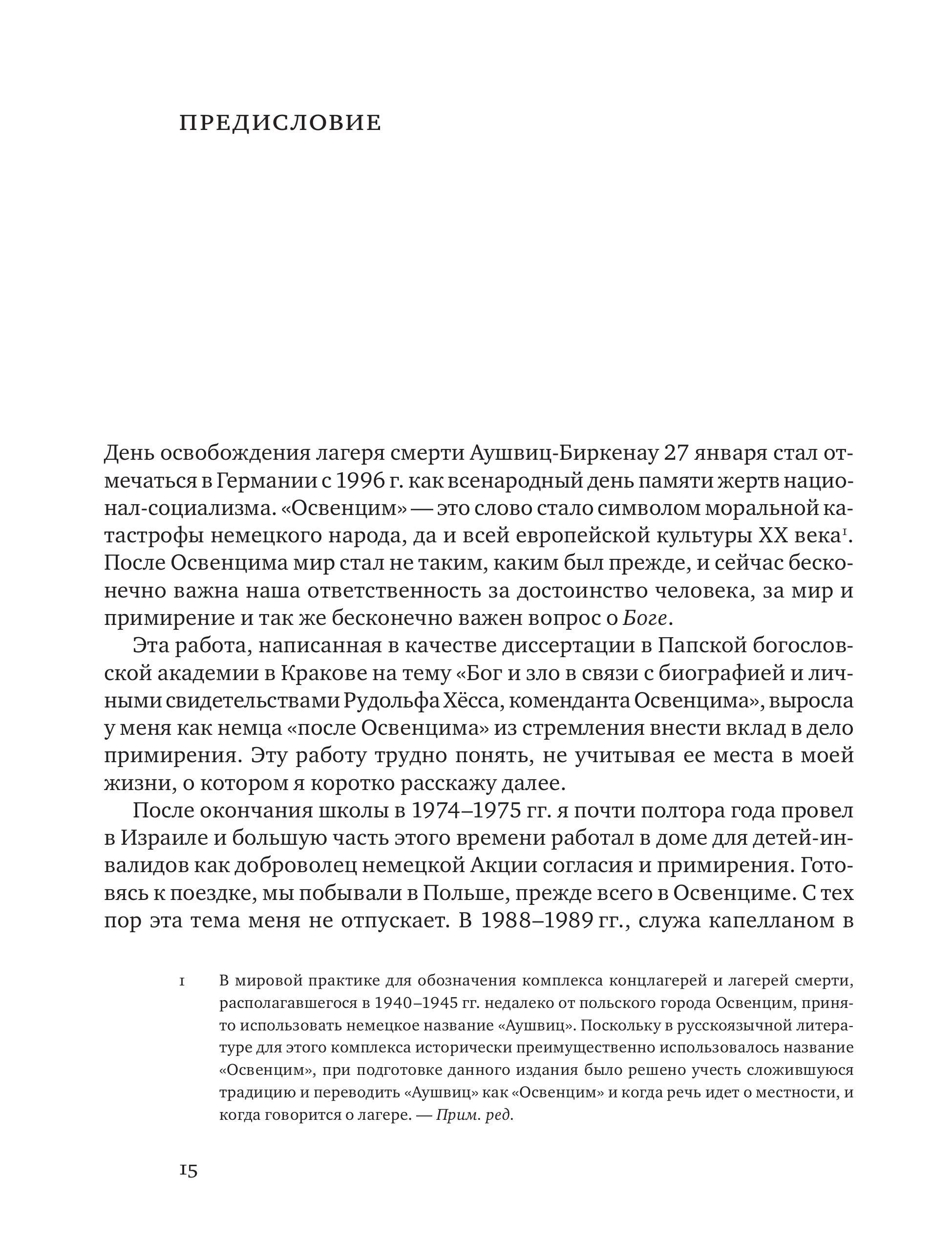 Священник Манфред Дезелерс подробно анализирует автобиографию Рудольфа Хёсса с опорой на философские наработки Рикёра и Левинаса, прослеживая процесс нарастания структур зла, расщепляющих мир на внутренний и внешний и превращающих жизнь в борьбу против врагов, которых нужно подчинить или уничтожить. Богословский вопрос сохранения «образа Божьего» в человеке, ставшем массовым убийцей, он связывает с библейским понятием «сердца», экзистенциального центра человека, открытого или закрытого по отношению к Другому.