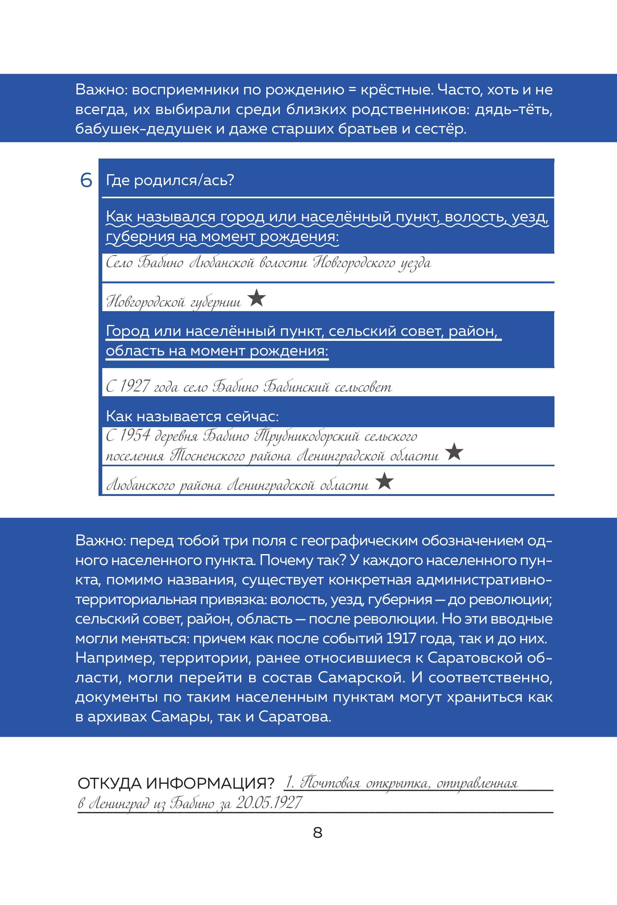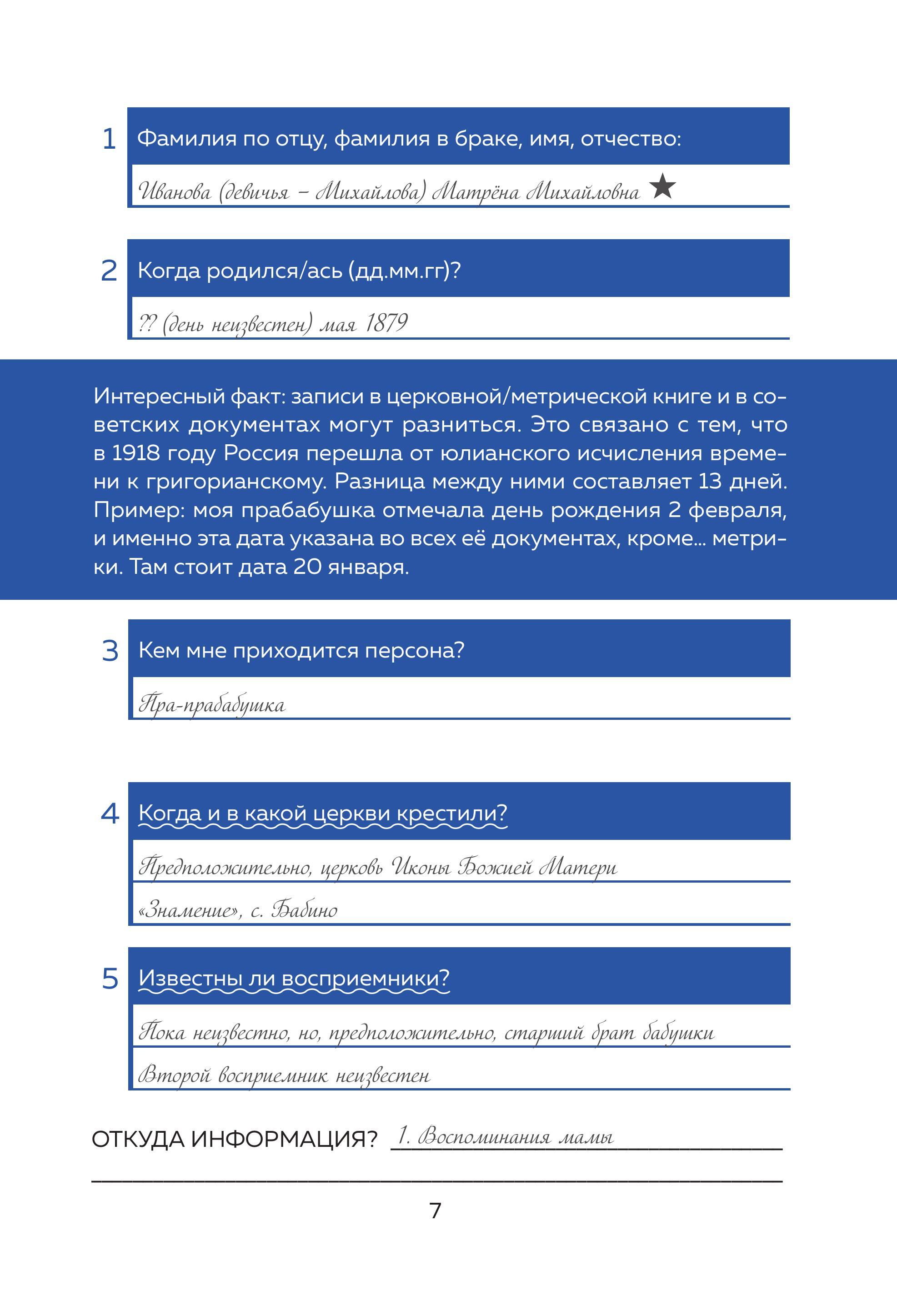 Мария Тычинина, генеалог с 10-летним опытом и автор проекта From Past With Love, создала этот пошаговый гид для всех, кто хочет сохранить связь с родом и гордо нести ее в будущее. С ним ты разгадаешь увлекательный детектив в виде прошлого своей семьи, сохранишь ценные данные и откроешь удивительные факты о своих предках. В процессе ты узнаешь, откуда в тебе эта стойкость — возможно, от прабабушки, пережившей войну, или почему в семье так ценят образование — а вдруг твой прадед был первым грамотным в деревне?