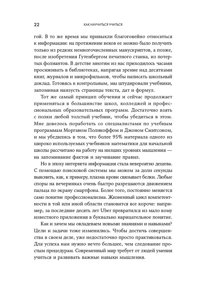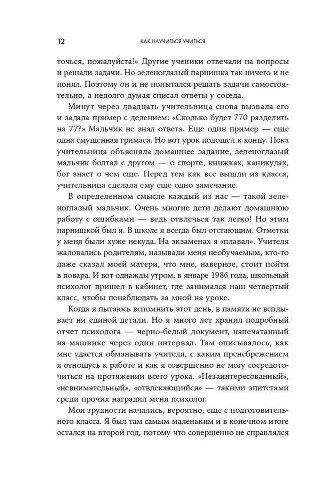 Научный журналист и исследователь в области образования Ульрих Бозер рассказывает о методах, которые позволят достичь нового уровня. Автор описывает шесть главных шагов, которые помогут не только студентам, но и зрелым людям, осваивающим новые знания, научиться учиться осмысленно. Вы узнаете, как учиться эффективнее, и это запустит цепочку важных перемен, в результате которых вы сможете быстро овладевать новыми навыками и покорять новые карьерные вершины.