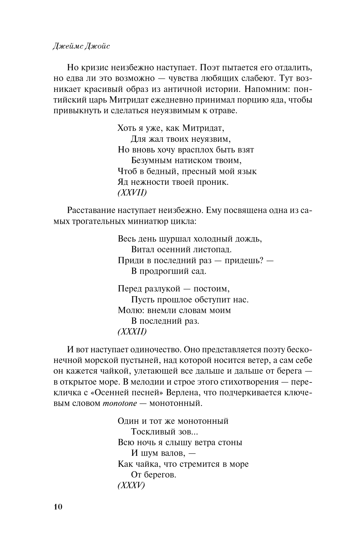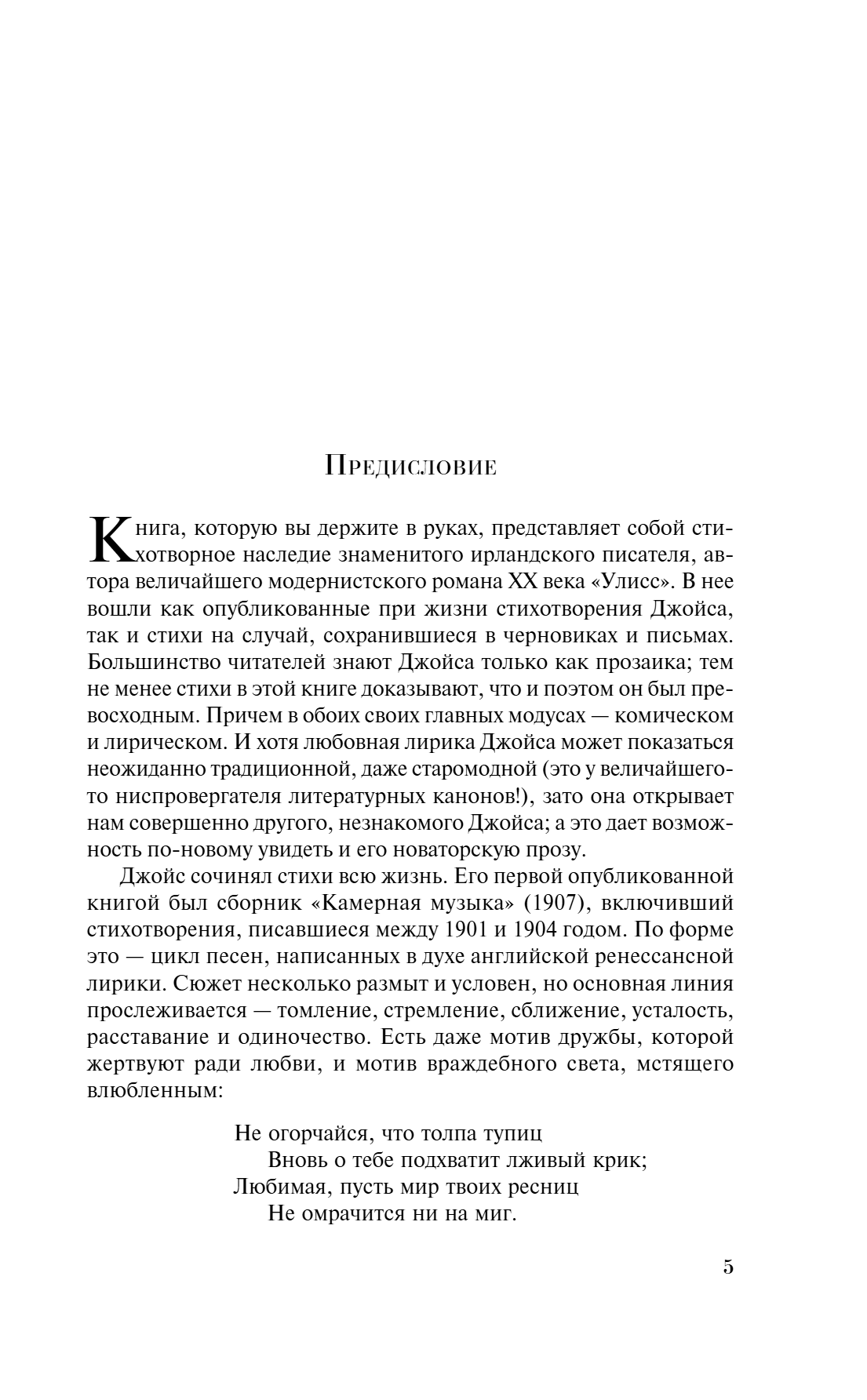 Тихая нежность «Камерной музыки» открывает читателям неожиданную сторону творчества великого модерниста Джеймса Джойса, почитаемого по всему свету. Автор бессмертного «Улисса» в своих стихотворениях предстает то чутким романтиком, то великолепным остряком, а блистательный перевод, выполненный Григорием Кружковым, передает все нюансы поэзии Джойса.