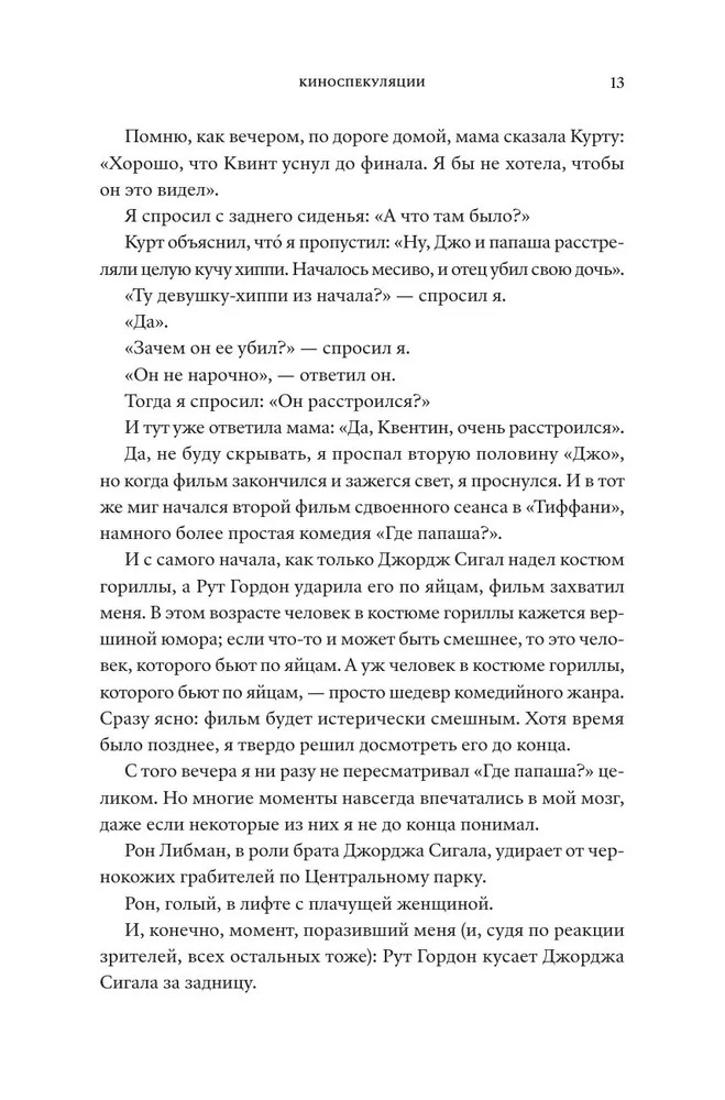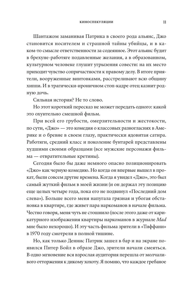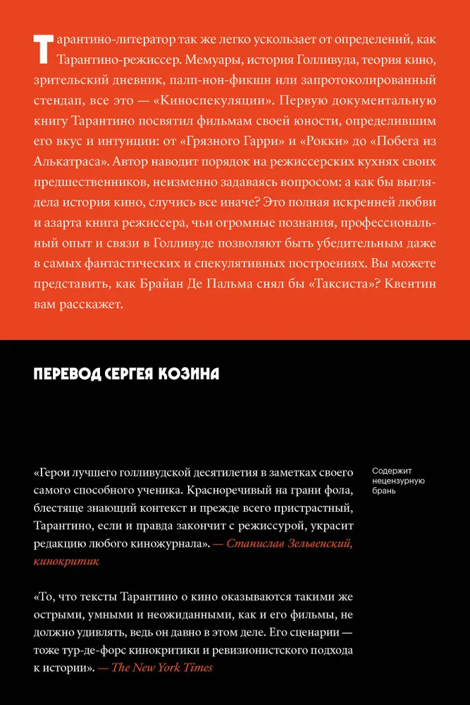 Тарантино-литератор так же легко ускользает от определений, как Тарантино-режиссер. Мемуары, история Голливуда, теория кино, зрительский дневник, палп-нон-фикшн или запротоколированный стендап, все это — «Киноспекуляции». Первую документальную книгу Тарантино посвятил фильмам своей юности, определившим его вкус и интуиции: от «Грязного Гарри» и «Рокки» до «Побега из Алькатраса». Автор наводит порядок на режиссерских кухнях своих предшественников, неизменно задаваясь вопросом: а как бы выглядела история кино, случись все иначе? Это полная искренней любви и азарта книга режиссера, чьи огромные познания, профессиональный опыт и связи в Голливуде позволяют быть убедительным даже в самых фантастических и спекулятивных построениях. Вы можете представить, как Брайан Де Пальма снял бы «Таксиста»? Квентин вам расскажет.