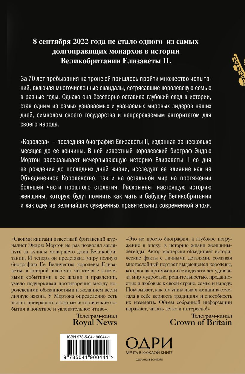 «Королева» — последняя биография Елизаветы II, изданная за несколько месяцев до ее кончины. В ней известный королевский биограф Эндрю Мортон рассказывает исчерпывающую историю Елизаветы II со дня ее рождения до последних дней жизни, исследует ее влияние как на Объединенное королевство, так и на остальной мир на протяжении большей части прошлого столетия. Раскрывает настоящую историю женщины, которую будут помнить как мать и бабушку Великобритании и как одну из величайших суверенных правительниц современной эпохи.