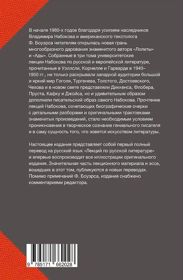 Настоящее издание представляет собой первый полный перевод на русский язык «Лекций по русской литературе» и впервые воспроизводит все иллюстрации оригинального издания. Значительная часть лекционного материала и эссе, вошедших в этот том, публикуются в новых переводах. Помимо примечаний Ф. Боуэрса, издание снабжено комментариями редактора.