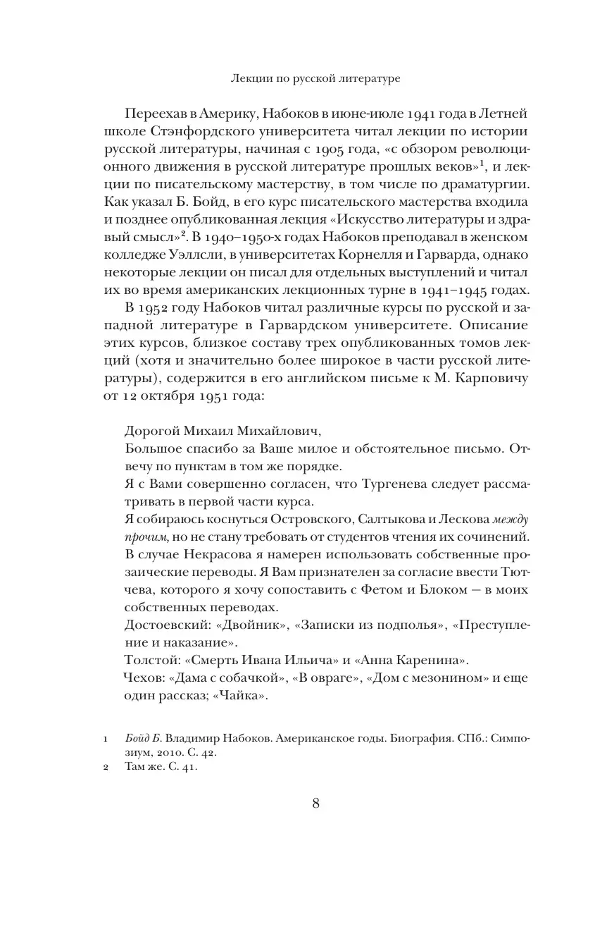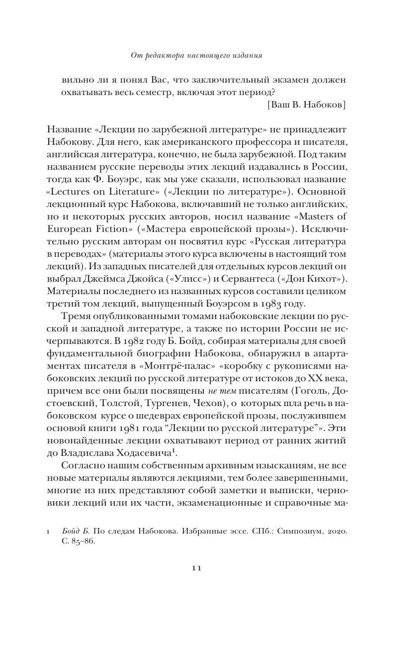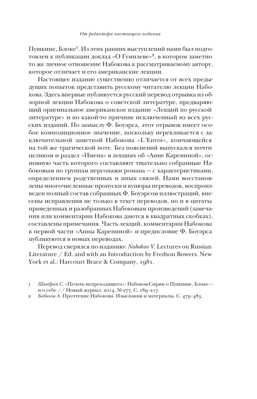 В начале 1980‑х годов благодаря усилиям наследников Владимира Набокова и американского текстолога Ф. Боуэрса читателям открылась новая грань многообразного дарования знаменитого автора «Лолиты» и «Ады». Собранные в три тома университетские лекции Набокова по русской и европейской литературе, прочитанные в Уэллсли, Корнелле и Гарварде в 1940–1950 гг., не только раскрывали западной аудитории большой и яркий мир Гоголя, Тургенева, Толстого, Достоевского, Чехова и в новом свете представляли Диккенса, Флобера, Пруста, Кафку и Джойса, но и удивительным образом дополнили писательский образ самого Набокова. Прочтение лекций Набокова, сочетающих биографические очерки с детальными разборами и оригинальными трактовками знаменитых произведений, стало необходимым условием проникновения в творческое сознание гениального писателя и в саму сущность того, что зовется искусством литературы.