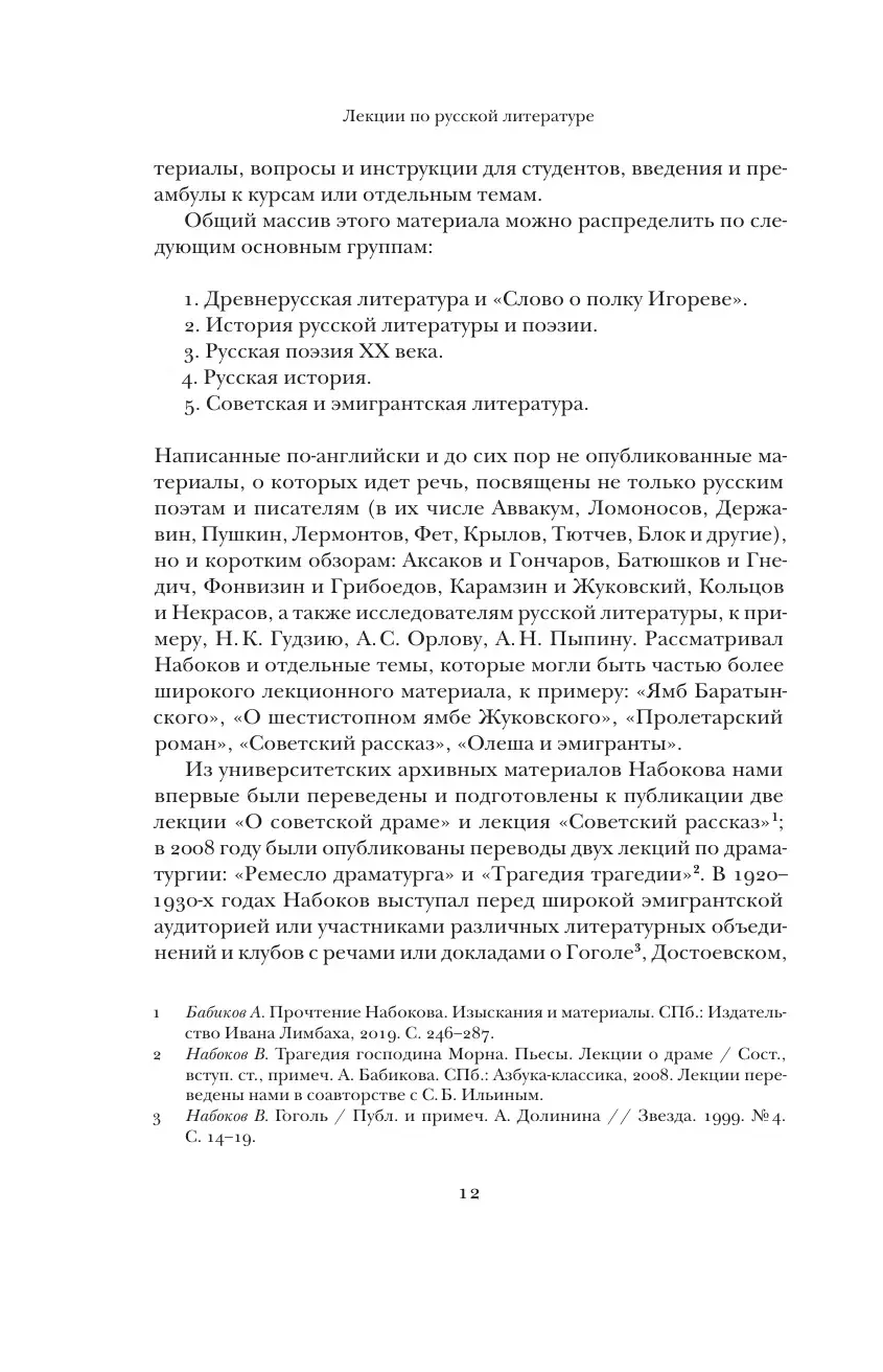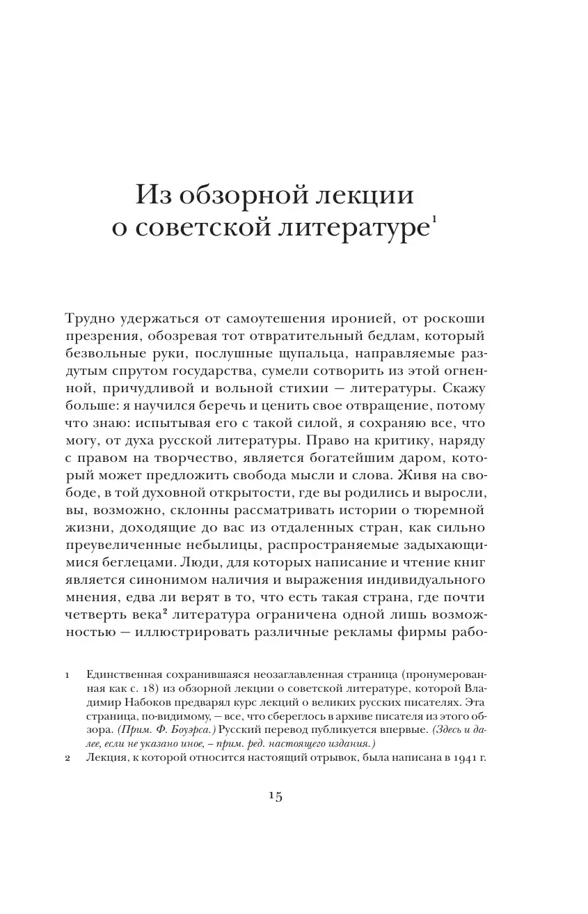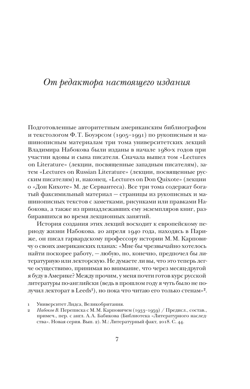 В начале 1980‑х годов благодаря усилиям наследников Владимира Набокова и американского текстолога Ф. Боуэрса читателям открылась новая грань многообразного дарования знаменитого автора «Лолиты» и «Ады». Собранные в три тома университетские лекции Набокова по русской и европейской литературе, прочитанные в Уэллсли, Корнелле и Гарварде в 1940–1950 гг., не только раскрывали западной аудитории большой и яркий мир Гоголя, Тургенева, Толстого, Достоевского, Чехова и в новом свете представляли Диккенса, Флобера, Пруста, Кафку и Джойса, но и удивительным образом дополнили писательский образ самого Набокова. Прочтение лекций Набокова, сочетающих биографические очерки с детальными разборами и оригинальными трактовками знаменитых произведений, стало необходимым условием проникновения в творческое сознание гениального писателя и в саму сущность того, что зовется искусством литературы.