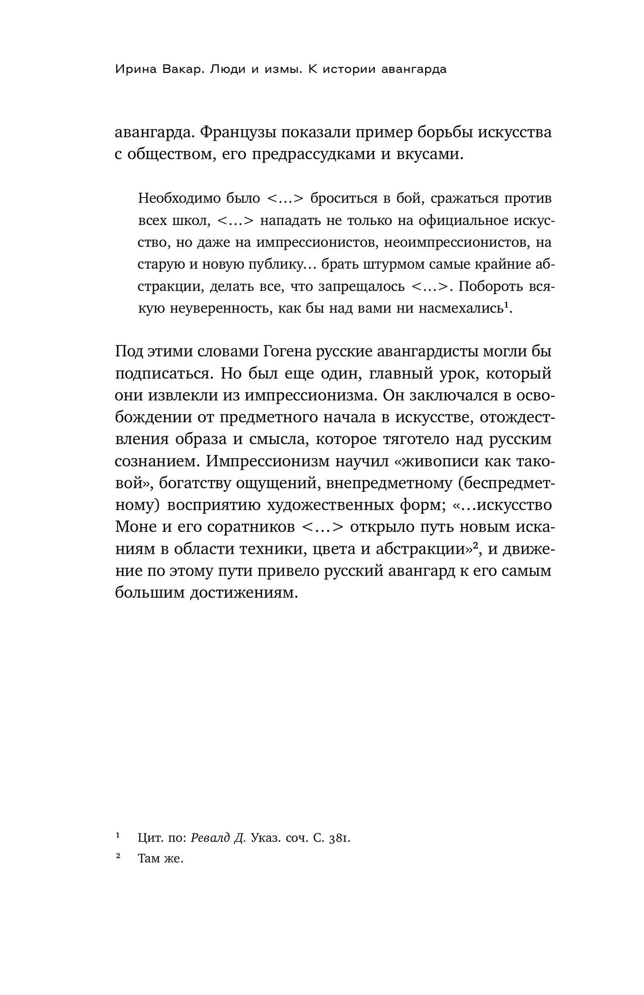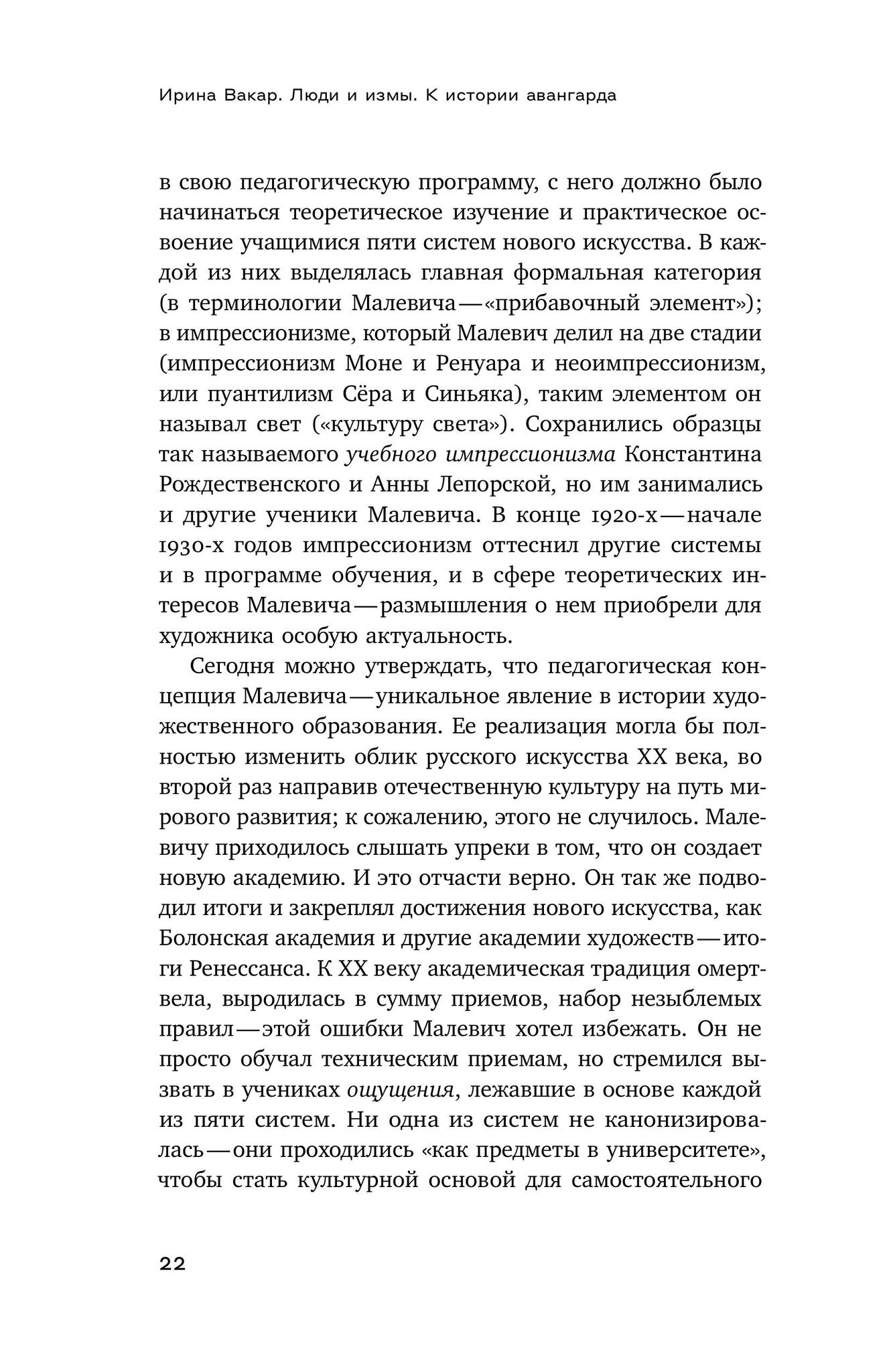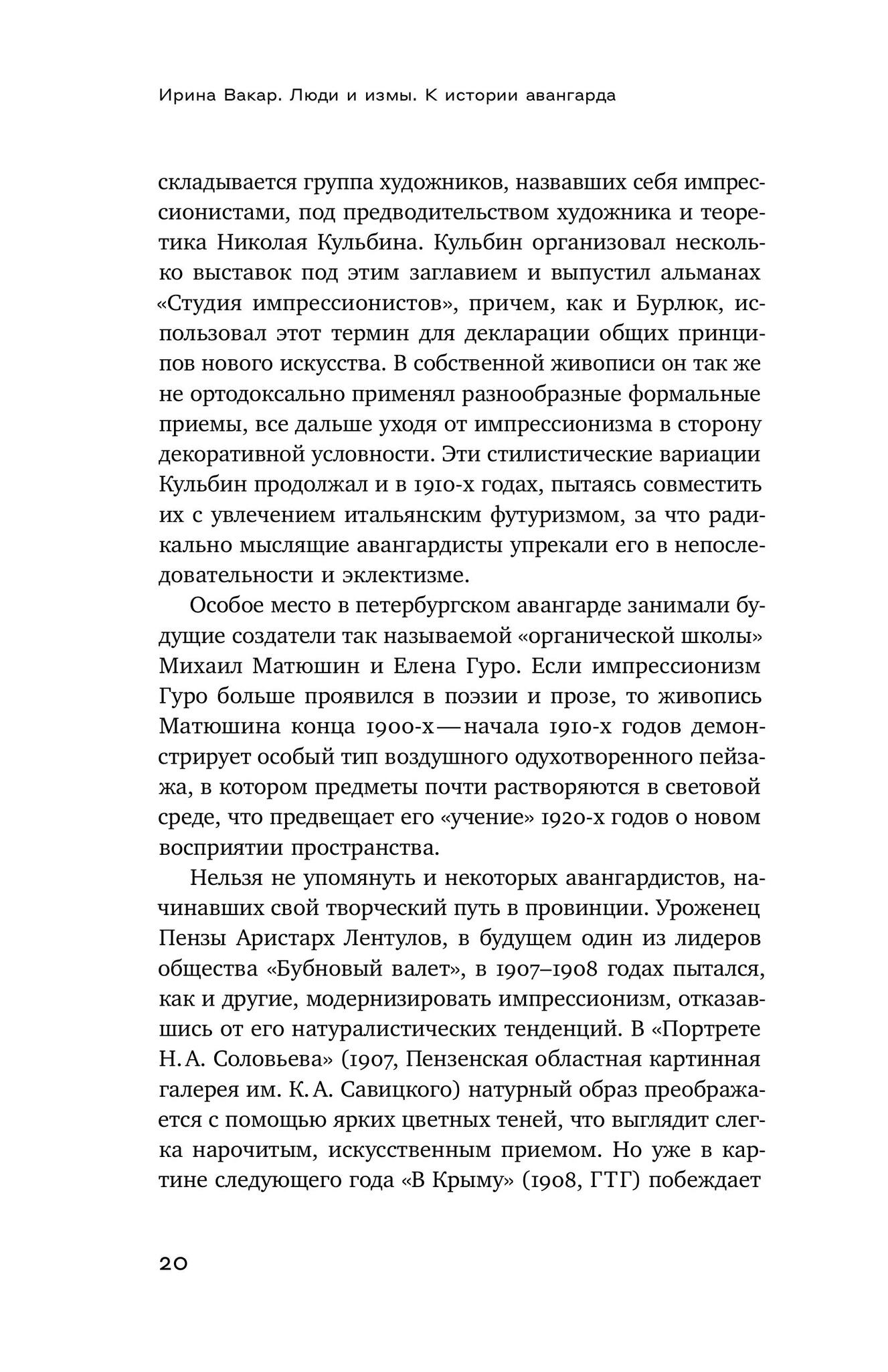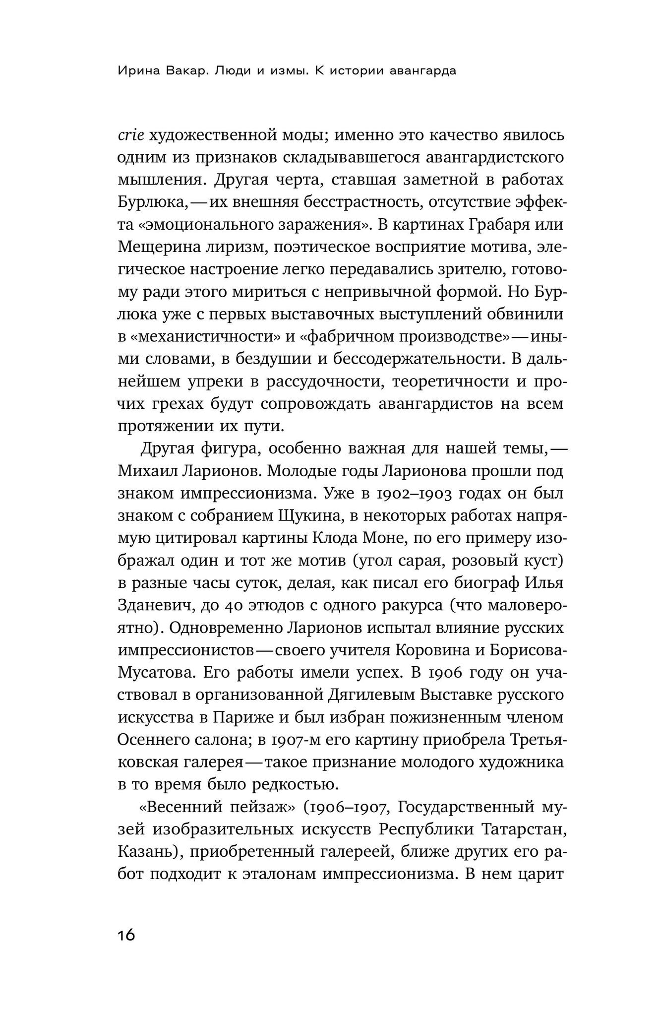 В фокусе внимания Ирины Вакар — знаковые фигуры и важнейшие направления русского живописного авангарда. Существовал ли «русский сезаннизм»? Какую роль сыграл импрессионизм в начале и конце пути художников авангарда? Чем творчество Ларионова, Малевича, Татлина оказалось схожим с творчеством Пикассо? Почему беспредметность была неизбежным этапом русского искусства? Чем отличалось сознание и жизненные приоритеты модернистов и авангардистов, например, Бенуа и Малевича? И что делал авангард, когда все битвы были уже проиграны? На все эти вопросы отвечают «Люди и измы». Ирина Вакар — главный научный сотрудник Третьяковской галереи, специалист в области русской живописи первой трети ХХ века, куратор многих выставок. Большинство глав книги написаны на основе докладов, прочитанных автором на научных конференциях.