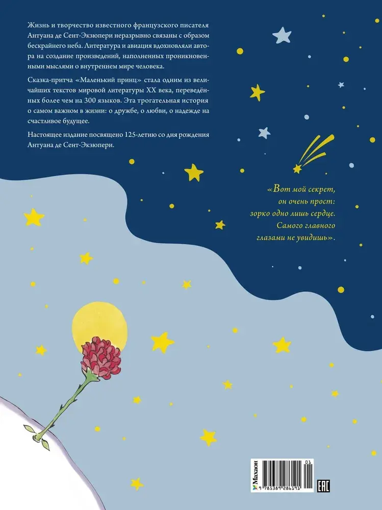 Жизнь и творчество известного французского писателя Антуана де Сент-Экзюпери неразрывно связаны с образом бескрайнего неба. Литература и авиация вдохновляли автора на создание произведений, наполненных проникновенными мыслями о внутреннем мире человека. Сказка-притча «Маленький принц» стала одним из величайших текстов мировой литературы ХХ века, переведённых более чем на 300 языков. Эта трогательная история о самом важном в жизни: о дружбе, о любви, о надежде на счастливое будущее.