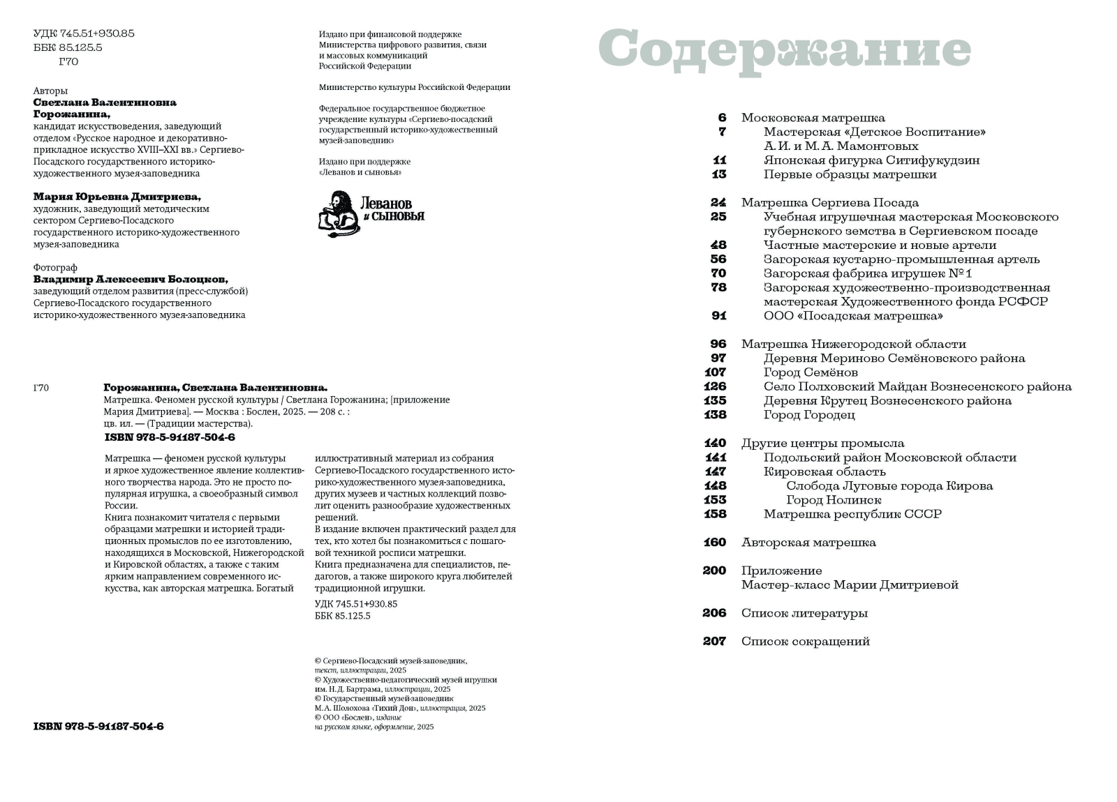 Книга познакомит читателя с первыми образцами матрешки и историей традиционных промыслов по ее изготовлению, находящихся в Московской, Нижегородской и Кировской областях, а также с таким ярким направлением современного искусства, как авторская матрешка. Богатый иллюстративный материал из собрания Сергиево-Посадского музея-заповедника, других музеев и частных коллекций позволит оценить разнообразие художественных решений.