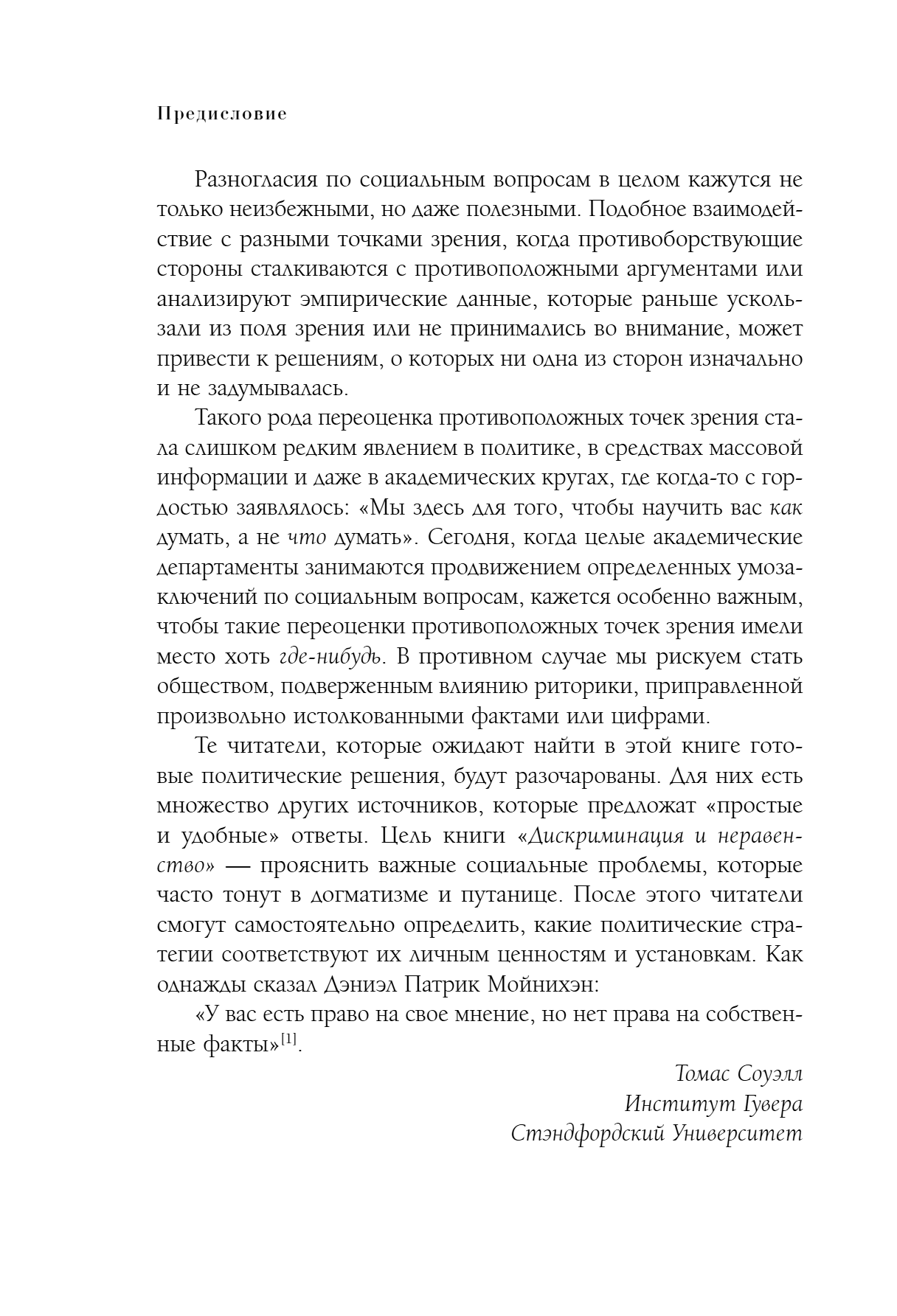 Томас Соуэл – известный американский экономист, социальный теоретик и историк, в своем труде призывает к более глубокому пониманию дискриминации, предлагая подходы, которые способствуют справедливости и равенству. Он исследует феномен неравенства, предлагая детальный анализ ее природы и различных форм.