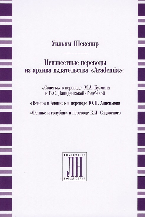 В этом выпуске «Библиотеки “Литературного наследства”» публикуются переводы, подготовленные для тома VIII Полного собрания сочинений У. Шекспира, выпускавшегося издательством «Academia» с 1936 года. В декабре 1937 г. издательство ликвидировали, том с поэзией Шекспира вышел в 1949 г. в Гослитиздате уже с другими переводами. В фонде «Academia» в РГАЛИ был обнаружен считавшийся утраченным перевод сонетов, выполненный М.А Кузминым (сонеты 1–103, беловая машинопись), там же отложились переводы В.С. Давиденковой-Голубевой, Ю.П. Анисимова и Е.И. Садовского. Их издательская история раскрывается во вступительной статье и примечаниях. Все тексты печатаются впервые.