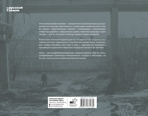 Этот уникальный фотоальбом — путешествие по регионам Урала, где суровая красота природы переплетается с загадочными тенями русской хтони. Вы увидите индустриальные пейзажи с ржавеющими сооружениями, затерянные деревни и заброшенные церкви, памятники природы и архитектуры — всё то, что хранит в себе дух нашей истории и преданий.
