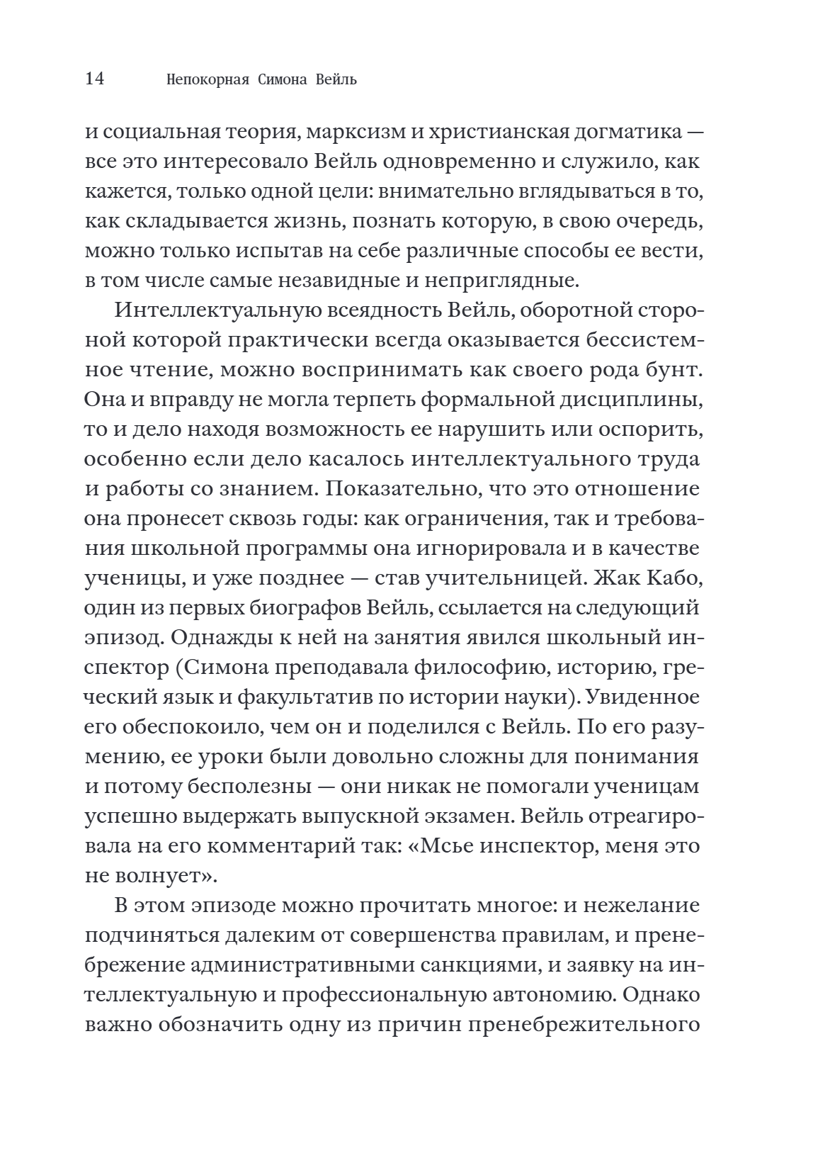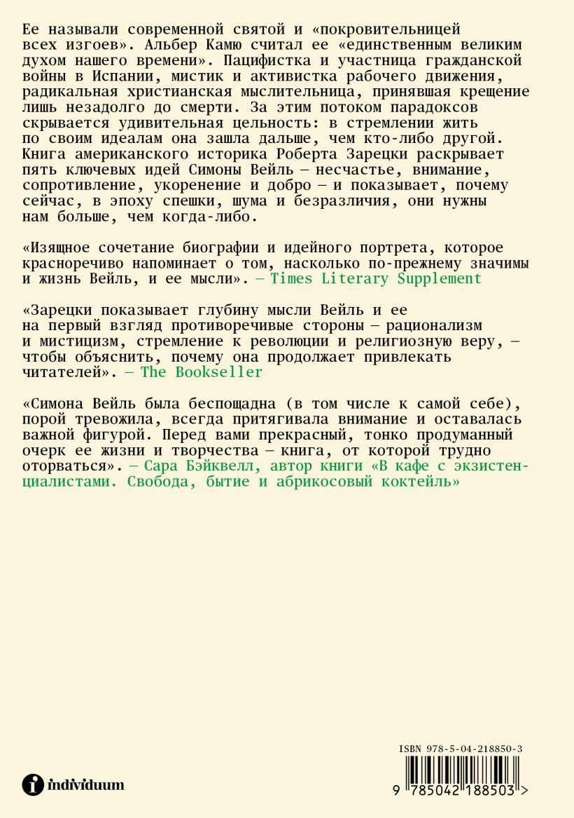 Ее называли современной святой и «покровительницей всех изгоев». Альбер Камю считал ее «единственным великим духом нашего времени». Пацифистка и участница гражданской войны в Испании, мистик и активистка рабочего движения, радикальная христианская мыслительница, принявшая крещение лишь незадолго до смерти. За этим потоком парадоксов скрывается удивительная цельность: в стремлении жить по своим идеалам она зашла дальше, чем кто-либо другой. Книга американского историка Роберта Зарецки раскрывает пять ключевых идей Симоны Вейль — несчастье, внимание, сопротивление, укоренение и добро — и показывает, почему сейчас, в эпоху спешки, шума и безразличия, они нужны нам больше, чем когда-либо.