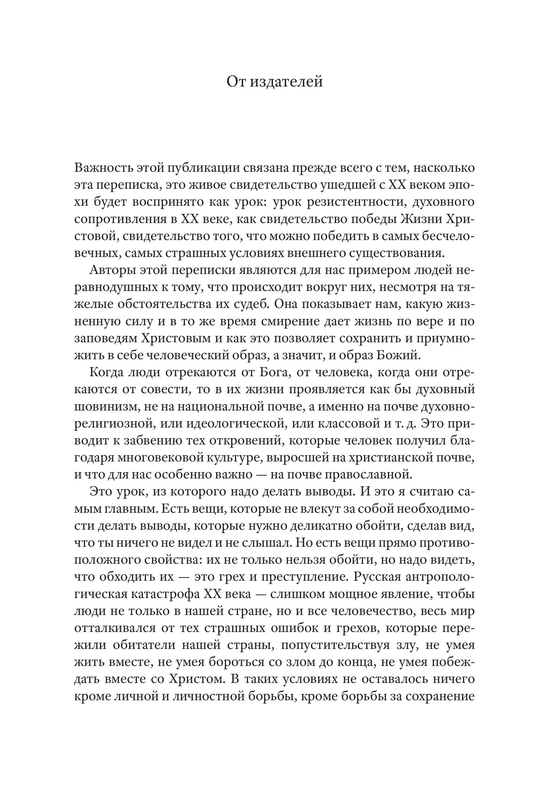 Эта личная переписка отражает не только собственные переживания авторов, но и духовный путь обоих, а также является ярким свидетельством их духовного сопротивления страшным событиям XX века, свидетельством того, какую силу и в то же время смирение дает жизнь по вере и по заповедям Христовым и как она позволяет сохранить в себе человеческий образ, а значит, и образ Божий. Вопросы, затрагиваемые в письмах, важны и сегодня.