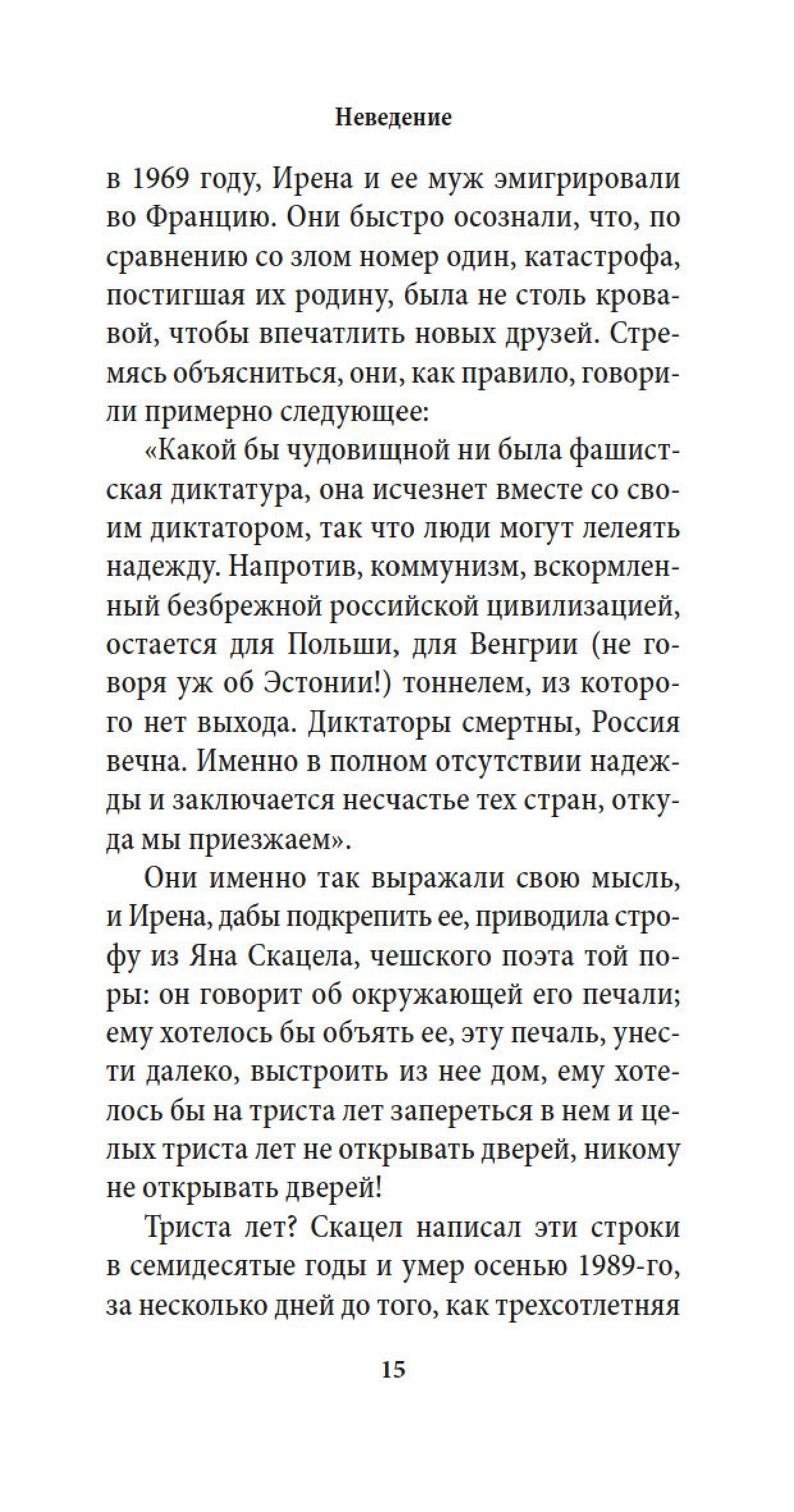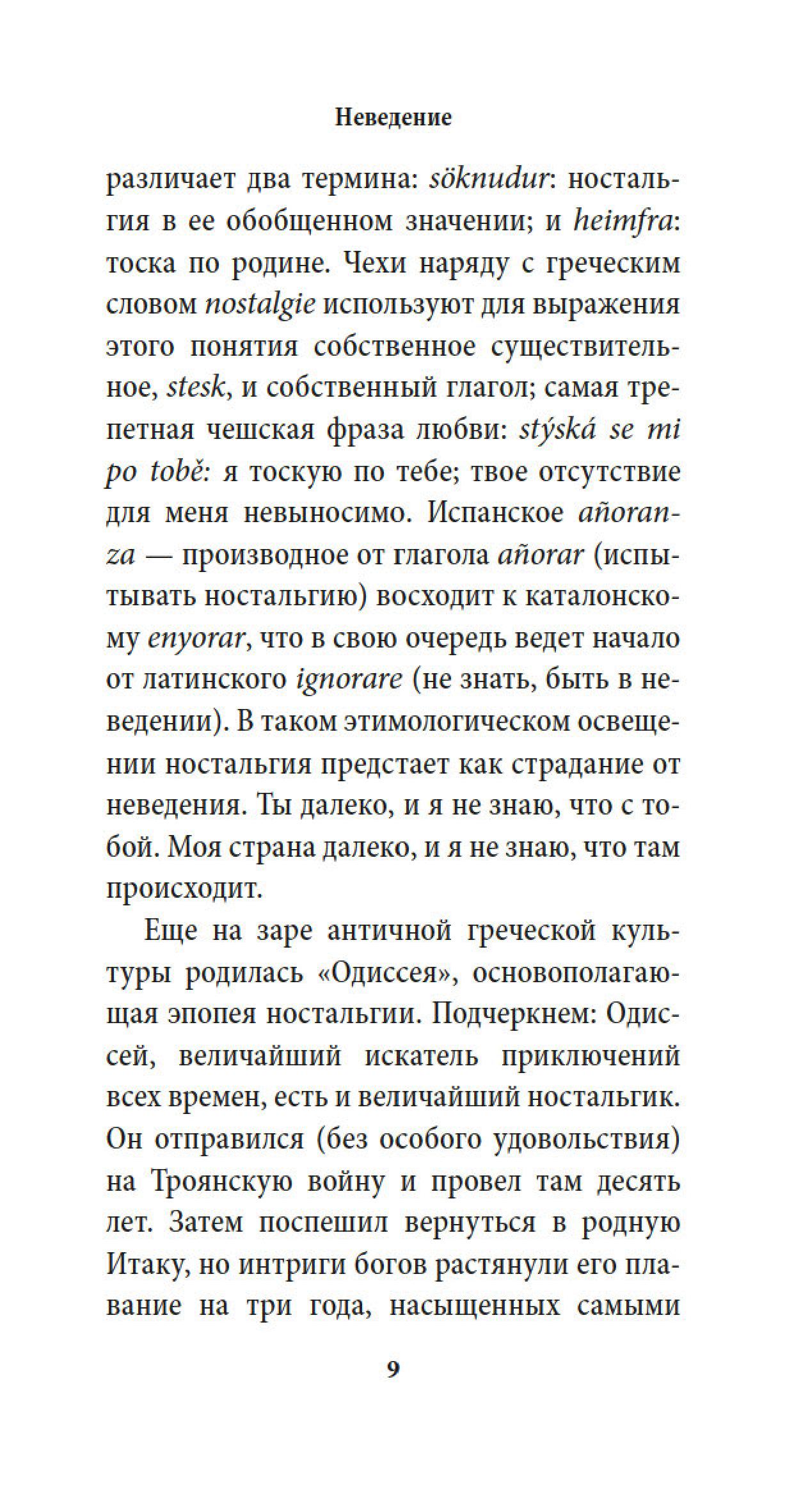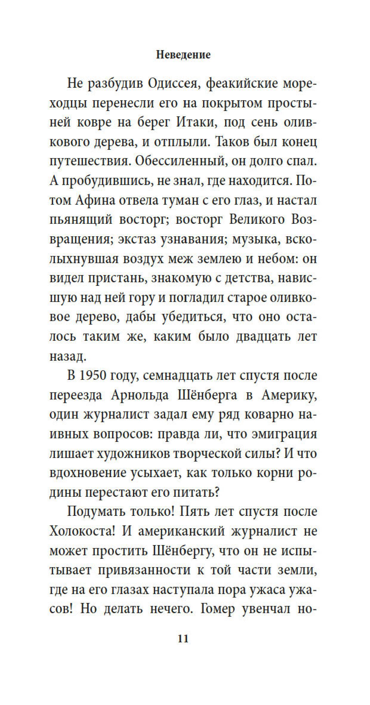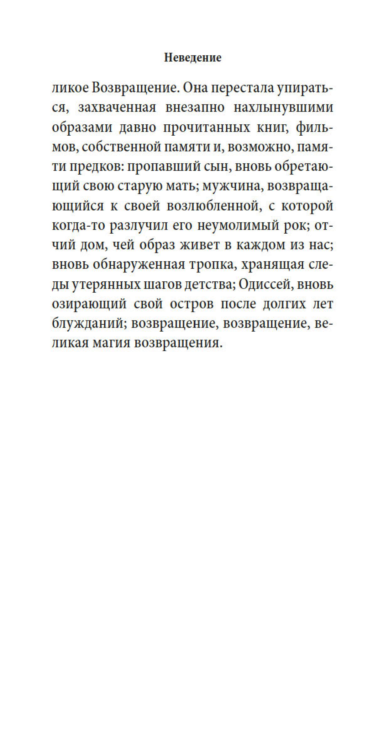 Возвращение — один из основных сюжетов мировой литературы, и всякая одиссея развивается предсказуемо... впрочем, не всегда. Герои романа одного из крупнейших писателей современности Милана Кундеры «Неведение» возвращаются в Чехию после эмиграции — после многих лет тягот, счастья, потерь, компромиссов, новых переживаний и воспоминаний, которые непостижимы и не интересны никому на родине. Как работает память? Из чего строятся надежды? Что такое подлинная честность? Кто возвращается к Пенелопе и знает ли она человека, который к ней вернулся? Те, кто уехал; те, кто повстречался им в пути; те, кто остался, — Кундера вглядывается в человеческие судьбы с беспримерной проницательностью и талантом к сочувственному пониманию.