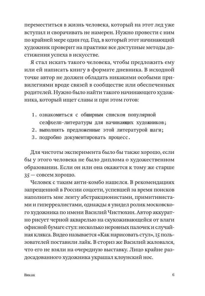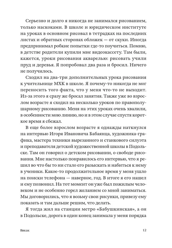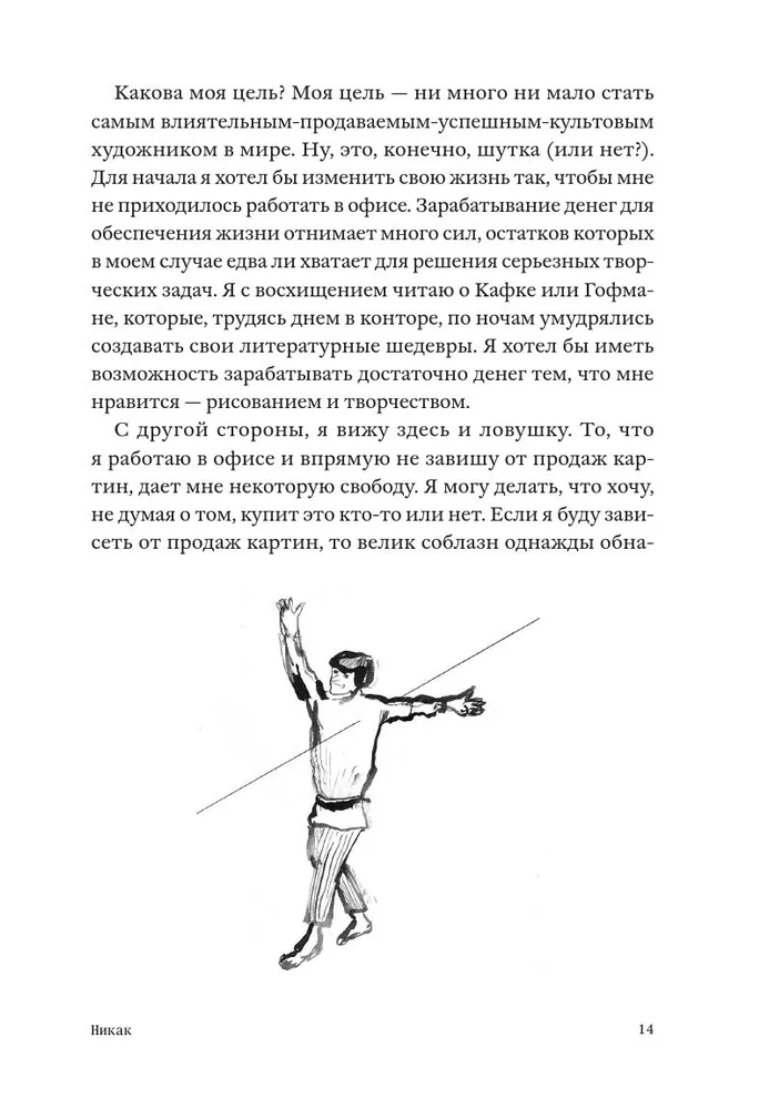 «Никак» — не просто дневник неудачливого художника, его надежд, разочарований и бесконечной борьбы за признание. Это предельно откровенная экскурсия в закулисье российского арт-рынка, а также универсальная история борьбы с внутренними демонами, с которыми сталкивается каждый, кто стремится вперед, но снова и снова поскальзывается на банановой кожуре собственных страхов и сомнений.