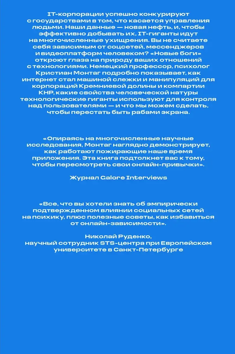 IT-корпорации успешно конкурируют с государствами в том, что касается управления людьми. Наши данные — новая нефть, и, чтобы эффективно добывать их, IT-гиганты идут на многочисленные ухищрения. Вы не считаете себя зависимым от соцсетей, мессенджеров и видеоплатформ человеком? «Новые боги» откроют глаза на природу ваших отношений с технологиями. Немецкий профессор, психолог Кристиан Монтаг подробно показывает, как интернет стал машиной слежки и манипуляций для корпораций Кремниевой долины и компартии КНР, какие свойства человеческой натуры технологические гиганты используют для контроля над пользователями — и что мы можем сделать, чтобы перестать быть рабами экрана.