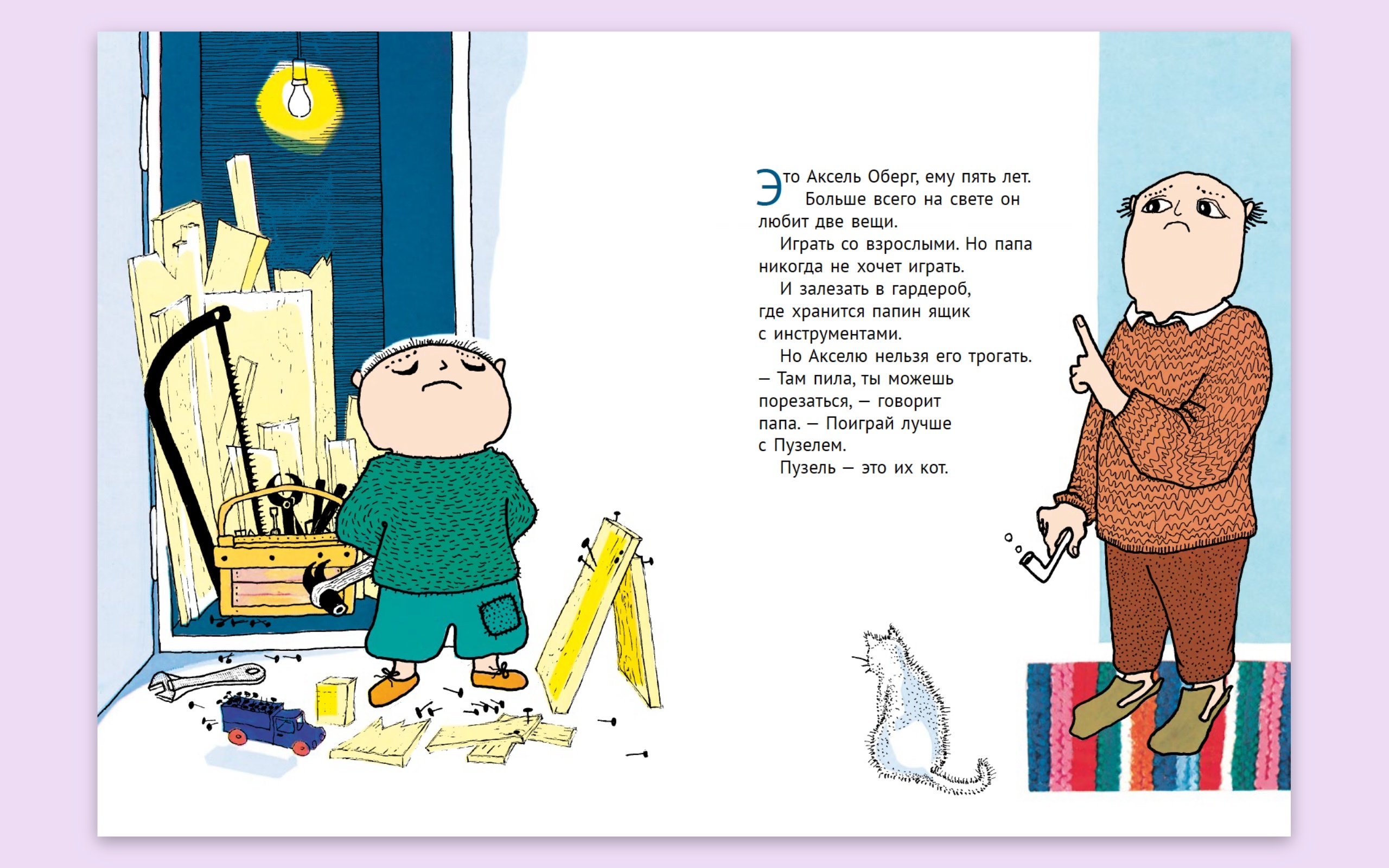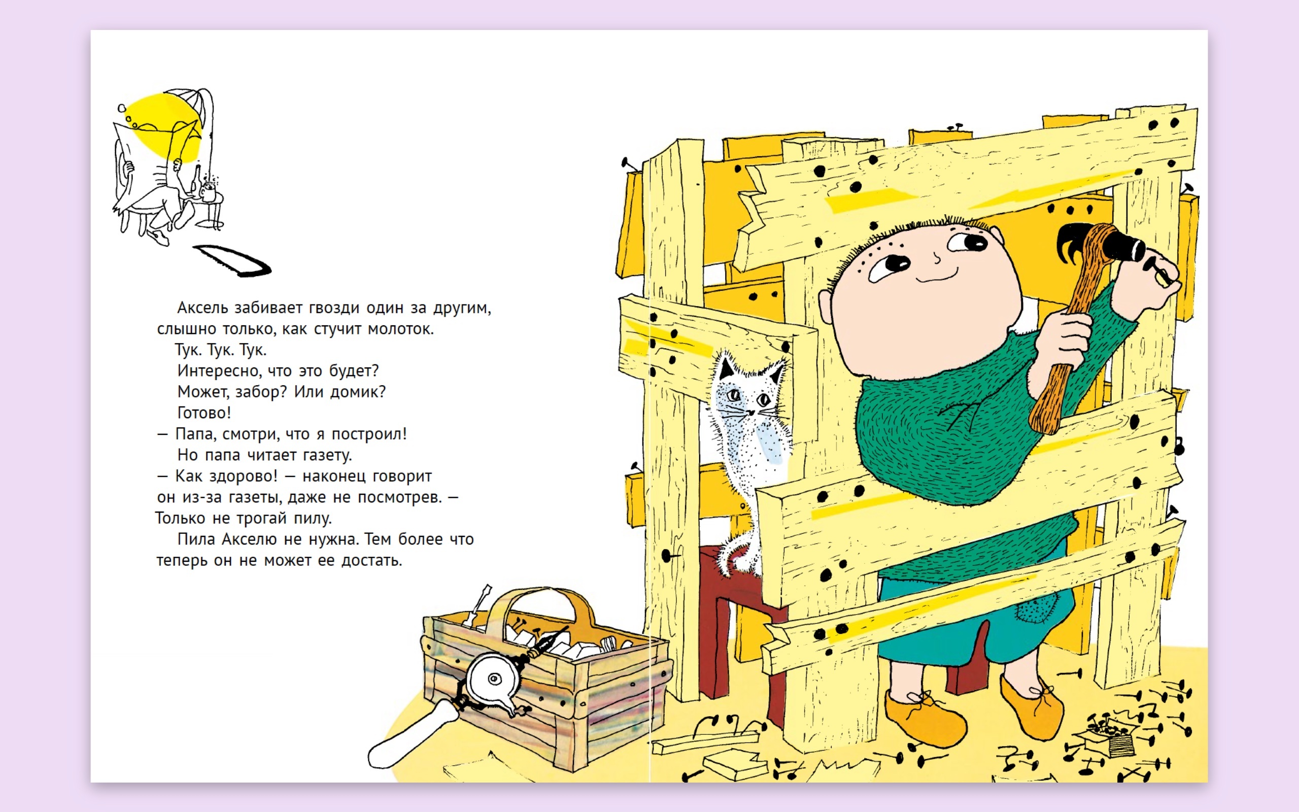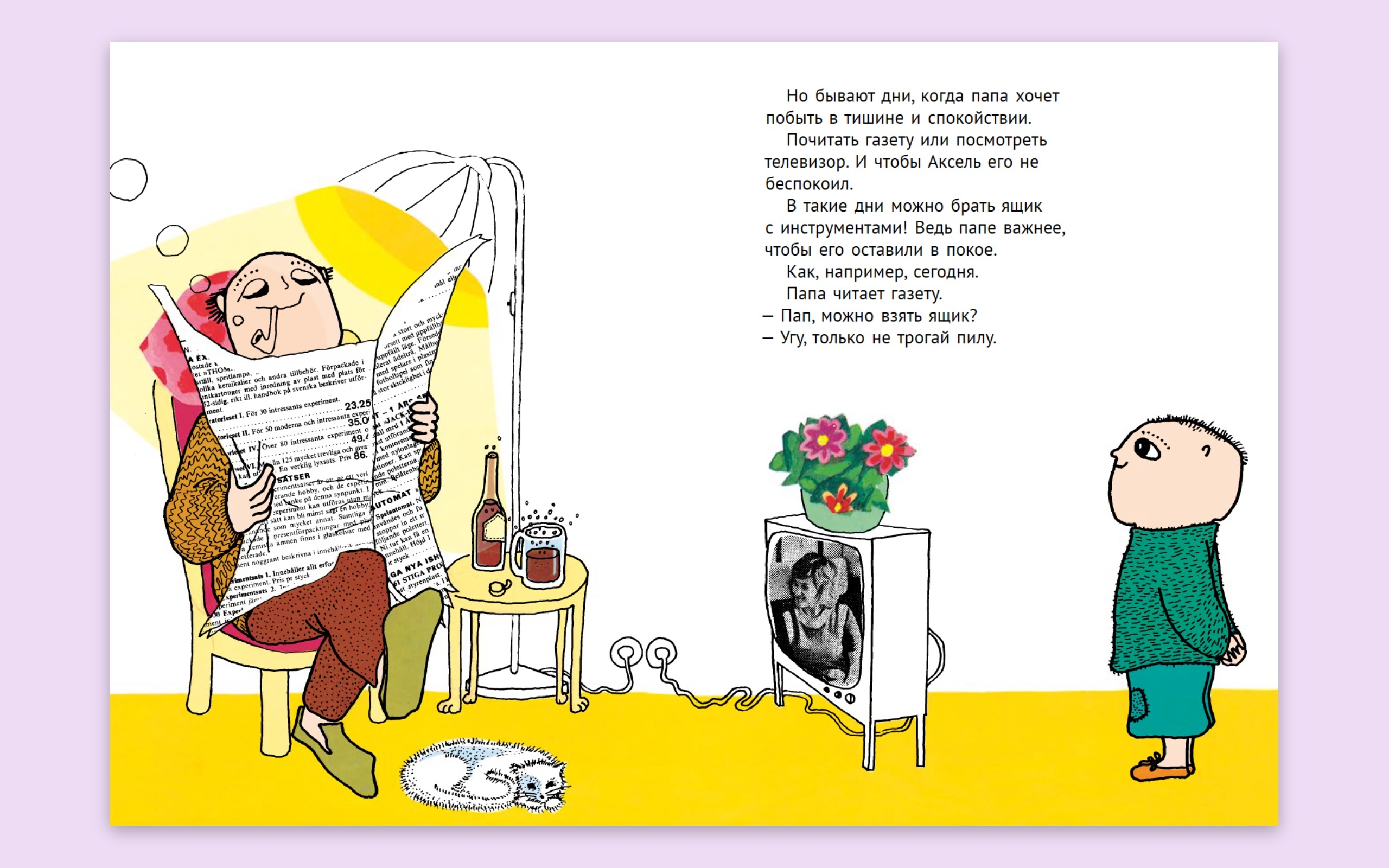 Папа хочет посидеть в тишине и почитать газету. А значит, Акселю можно взять ящик с инструментами и поиграть. Но главное — ему нельзя трогать пилу.