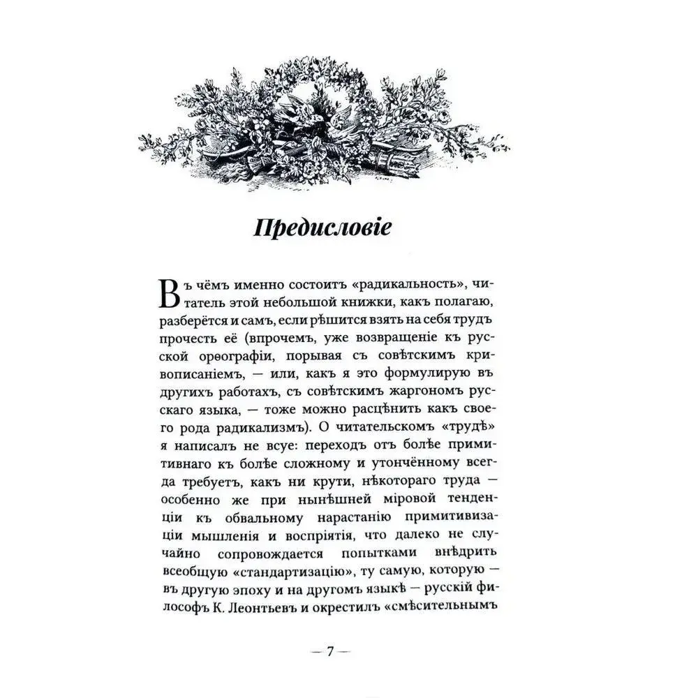 Автор сторонник возвращения к правописанию, принятому в России до революции 1917 года. Книга опубликована в традиционной русской (дооктябрьской) орфографии.