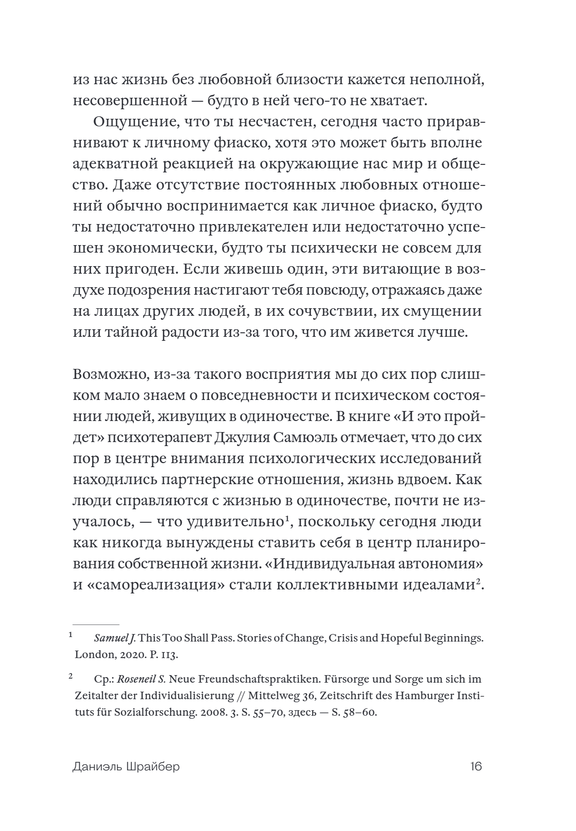 В современном обществе доминирует идея индивидуализма, но одиночество при этом часто воспринимается как личный провал. Мы обнаруживаем в себе стремление одновременно и к свободе, и к близости, что наглядно показал опыт изоляции во время пандемии. В своих эссе немецкий писатель и журналист Даниэль Шрайбер всматривается в этот кажущийся парадокс, обращаясь к трудам философов (от Аристотеля и Мишеля Фуко до Ханны Арендт и Жиля Делёза), художественной литературе (от Джейн Остин до Анни Эрно), актуальным исследованиям практикующих психотерапевтов и даже к популярным ситкомам. И приходит к дарящей надежду мысли, что выстраивание иерархий из моделей жизни, возможно, — не самая удачная идея и слову «одиночество» соответствуют не только темные тона.