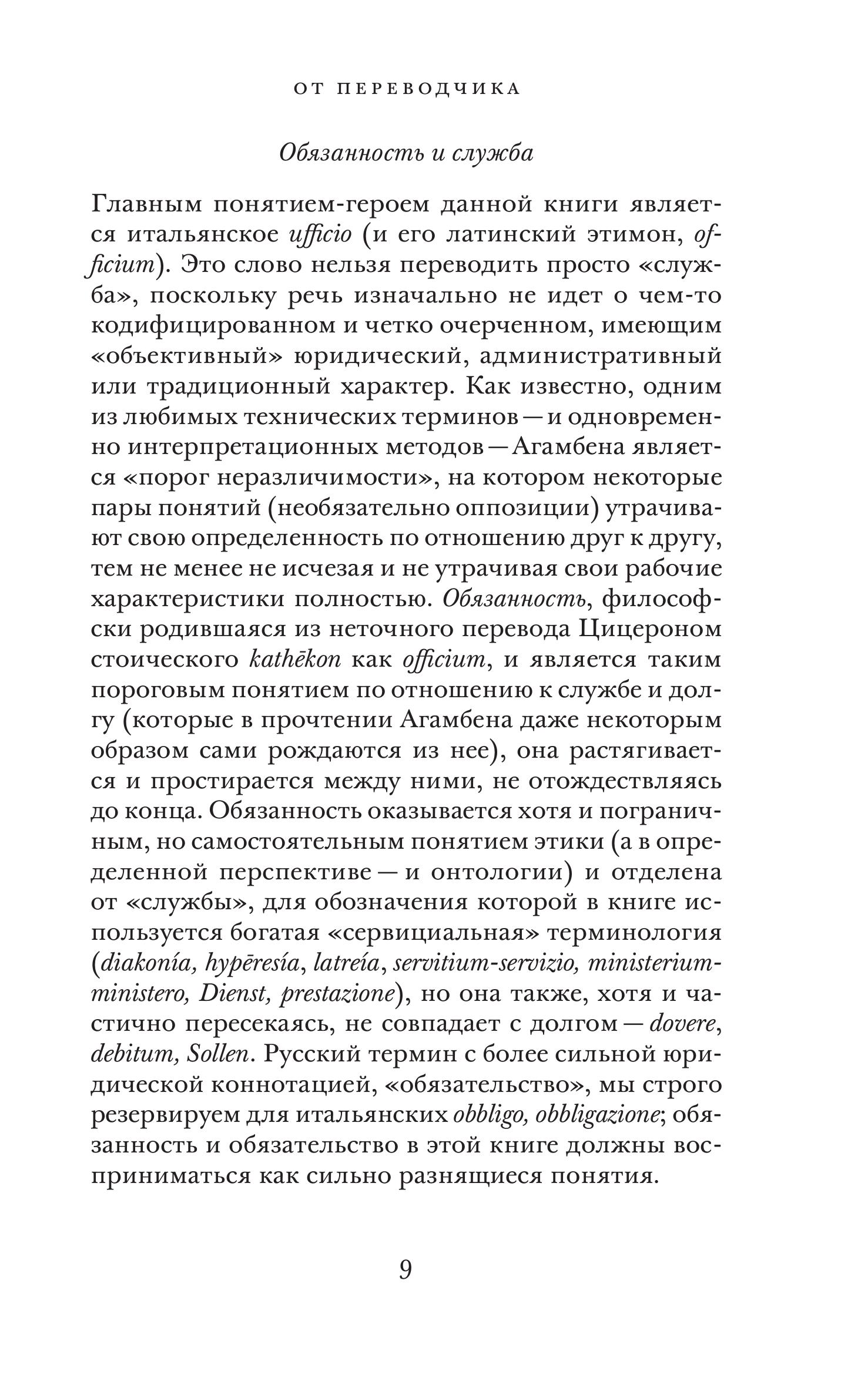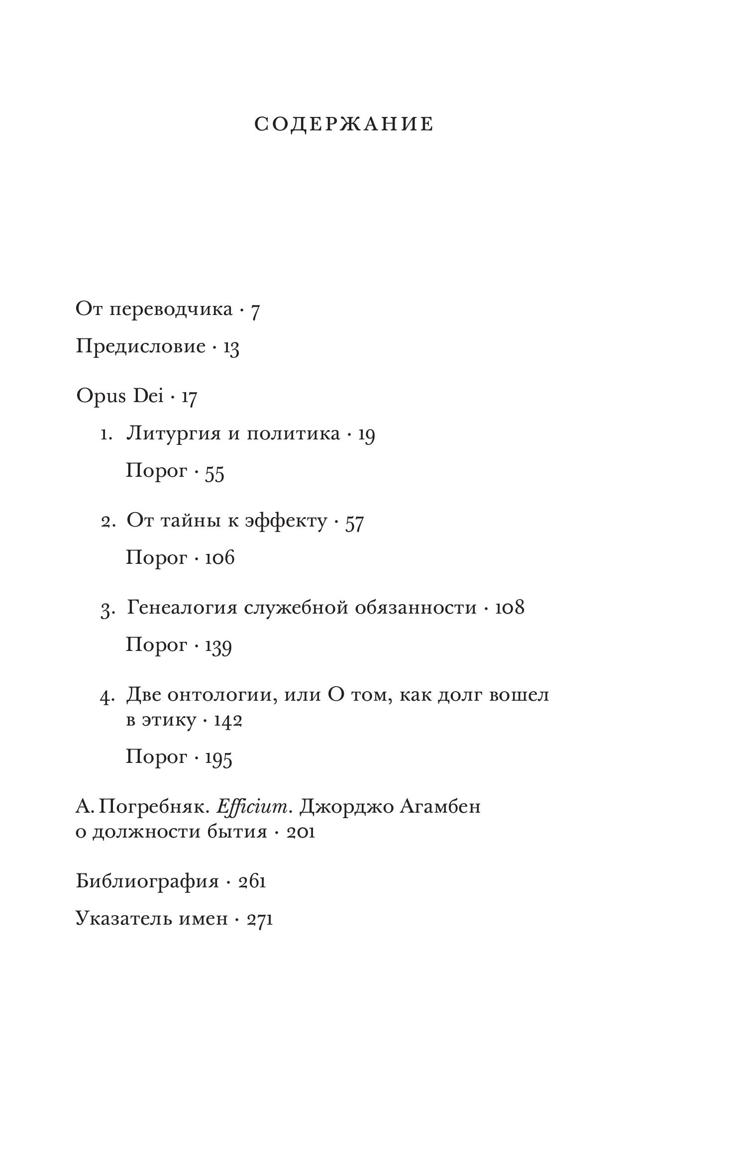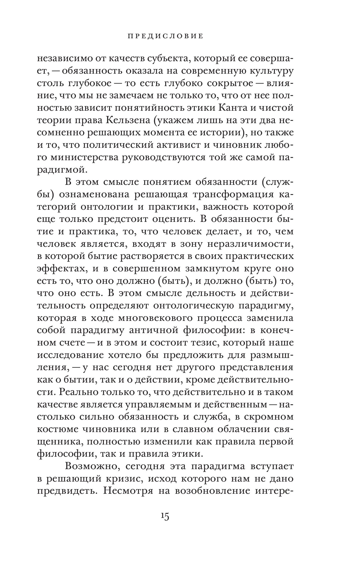 Так, он демонстрирует, что центральную роль в развитии обеих парадигм играет христианское богослужение с его совершенно особым пониманием действия и действенности, а также понятие «обязанности», пришедшее в христианскую богослужебную мысль из стоической этики, развитой Цицероном. В силу подобных предпосылок онтология и этика в конечном итоге оказываются связанными в едином круге, которому теперь соответствует особый субъект, буквально обреченный на эффективное совершение действий, ему самому не принадлежащих. Эта концепция и ее следствия, как показывает Агамбен, активно воздействуют на сферу политики вплоть до наших дней.