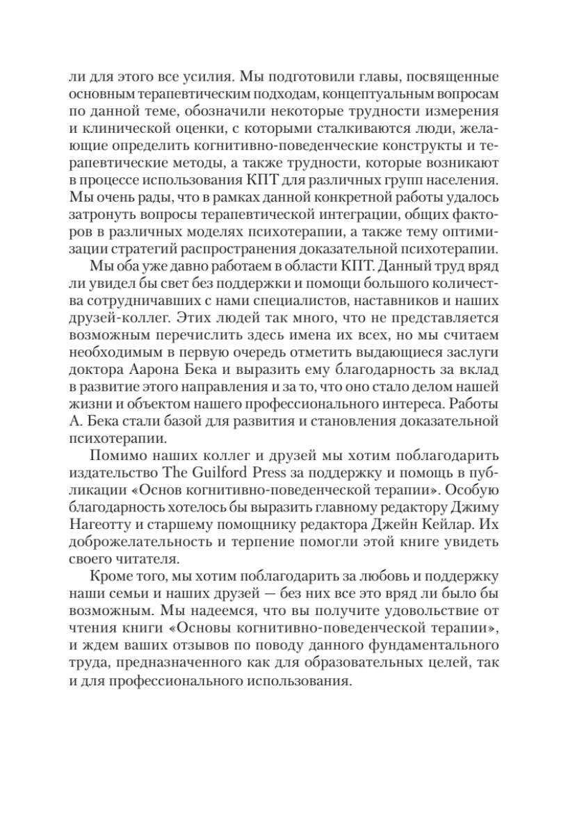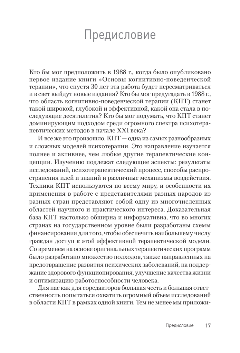 Авторы этой книги, ведущие специалисты, Кейт Добсон и Дэвид Дозуа, описывают концептуальные и научные основы КПТ. В издании подробно рассматриваются основные КПТ-подходы, включая эмоционально-ориентированную терапию решения проблем, рационально-эмотивную поведенческую терапию, схема-терапию, вмешательства на основе осознанности и принятия, а также диалектическую поведенческую терапию (ДБТ). Кроме того, в книге есть информация, посвященная клинической оценке и главы, посвященные трансдиагностическому лечению и моделям профилактики на основе КПТ. Авторы подробно обсуждают применение КПТ-подходов к конкретным группам населения, включая детей и подростков, супружеские пары, клиентов с различными культурными особенностями и многое другое.