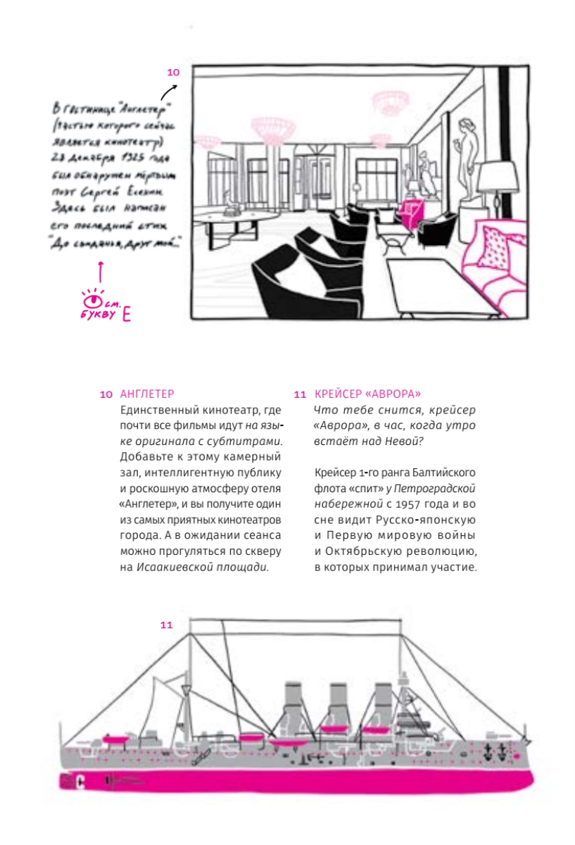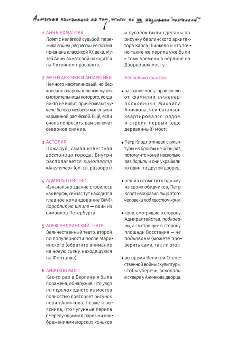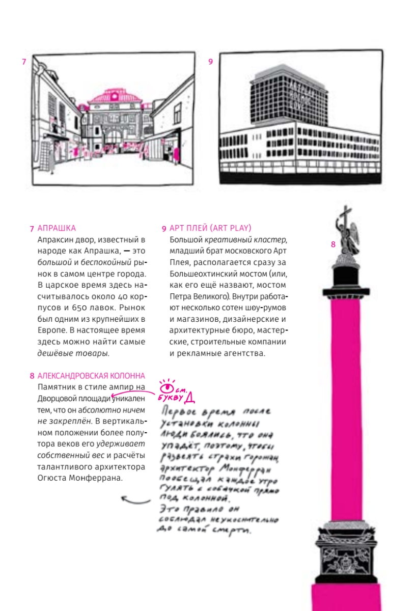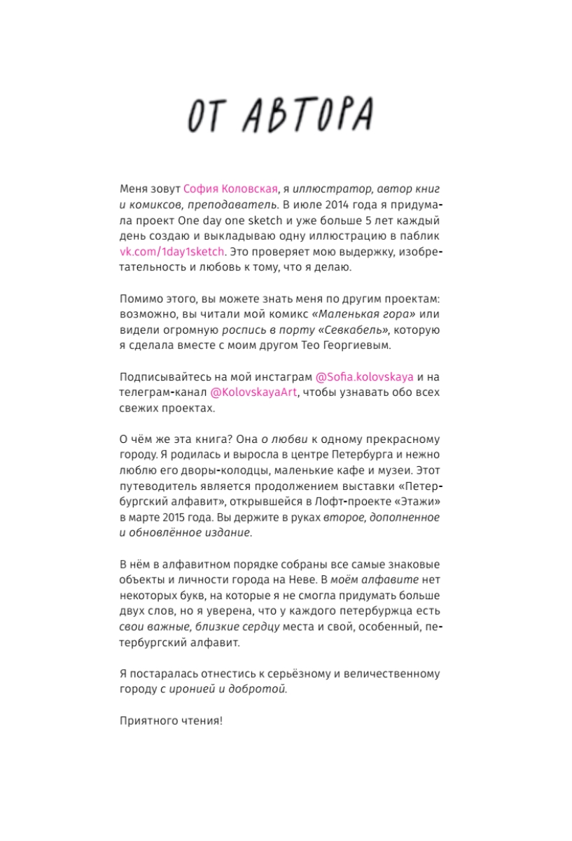 София Коловская — автор книг и комиксов, создатель популярного паблика One day one sketch — видит петербургские достопримечательности по-своему. Ее работы из серии «Петербургский алфавит» с большим успехом выставлялись в Лофт-проекте «Этажи» и переросли в этот путеводитель.