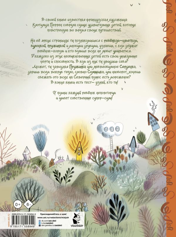Эта книга полна потрясающих иллюстраций и стихов, которые увлекут вашего малыша. Каждая страница рассказывает о детях с уникальными суперспособностями: Ребёнок-Солнышко освещает всех вокруг своим светом, Холодок любит мороженое и уединение, а Ребёнок-Сердечко излучает любовь. Вы узнаете, где живут эти удивительные дети, что они любят и кто их друзья.